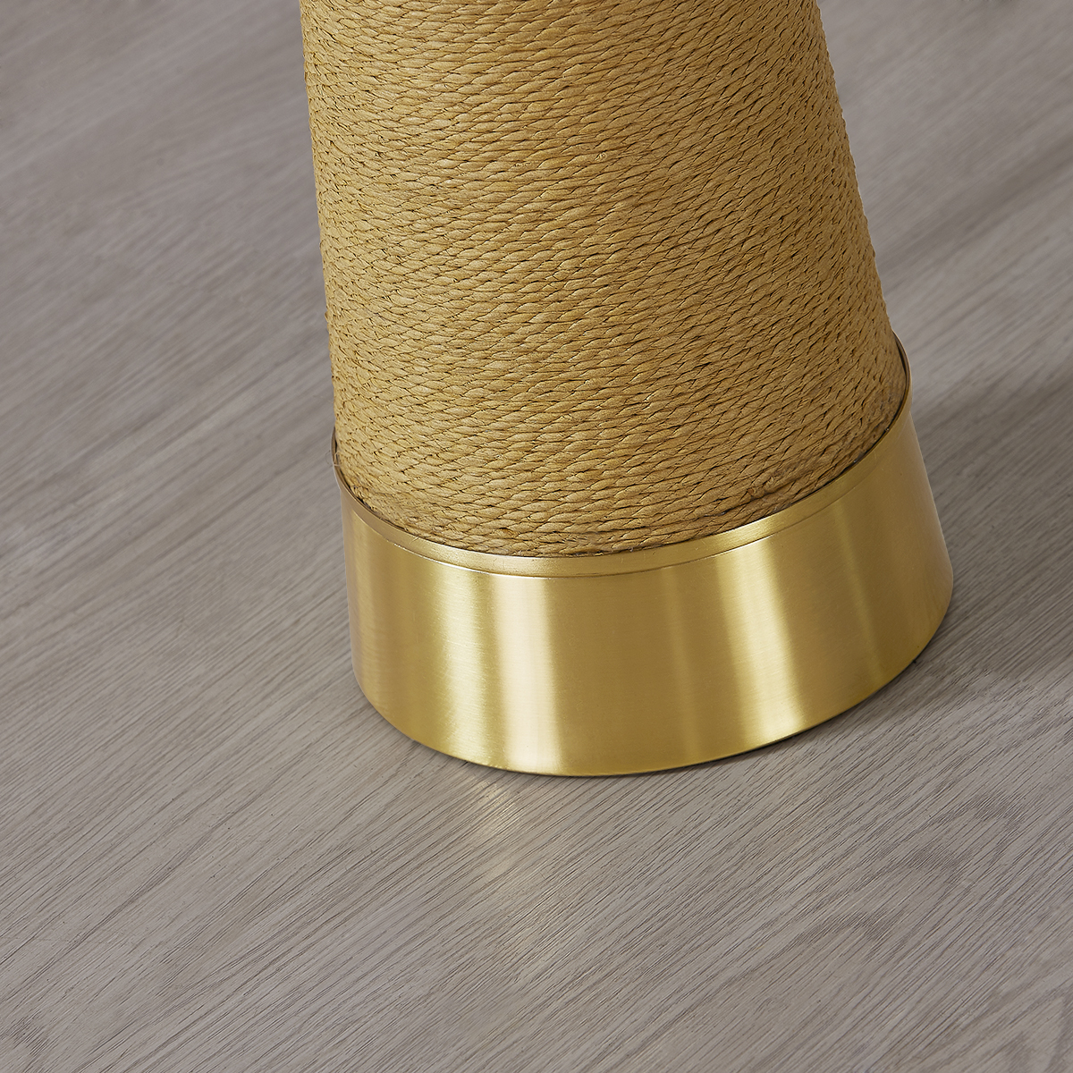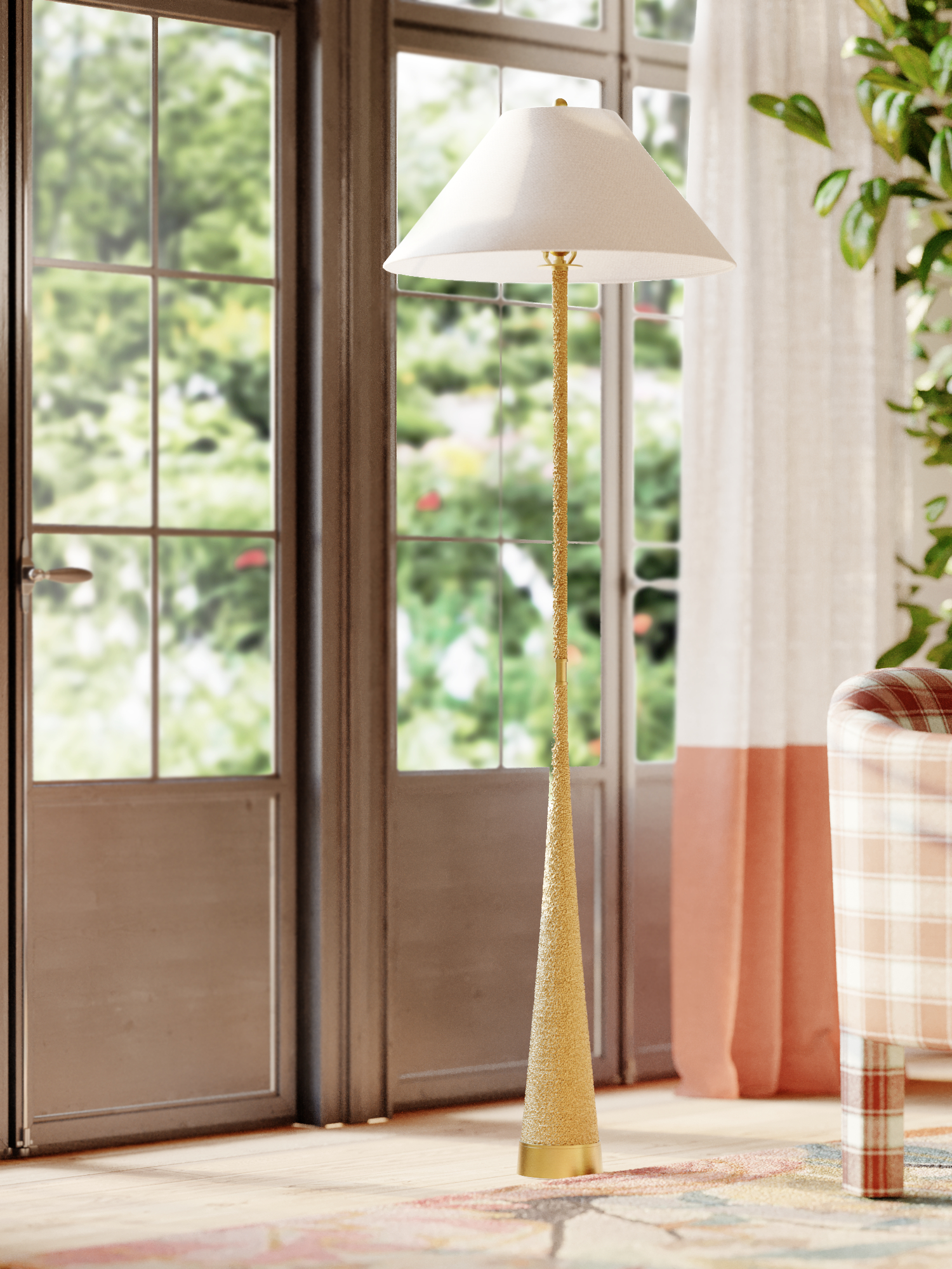 Extremely usable yet trend forward, this striking floor lamp makes a gorgeous organic statement. A slender natural raffia-wrapped stem, tapered at the bottom and straight at the top, has an Aged Brass band at the middle, creating a modern hourglass-like silhouette. A tapered white linen shade and round Aged Brass finial complete the look.