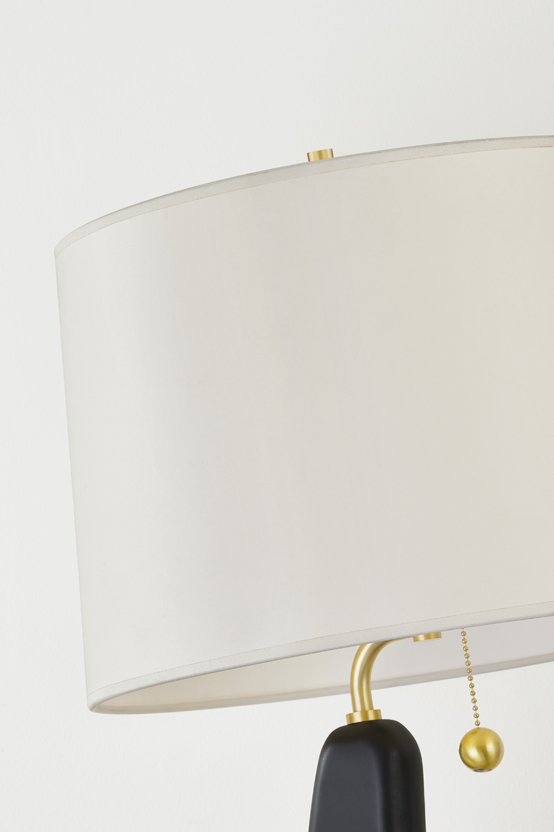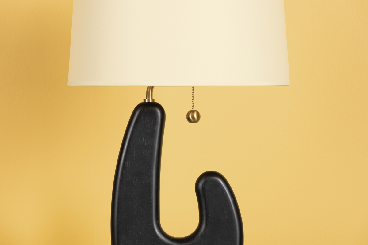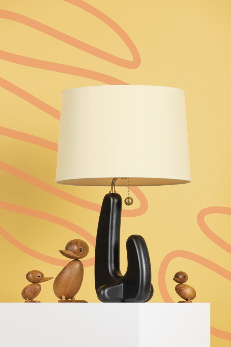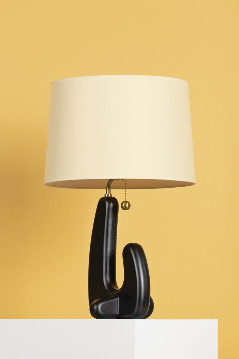 An oversize bauble at the end of the beaded pull chain hangs perfectly in the space created by the modern, sculptural base, giving this table lamp its asymmetrical but balanced feel. The visible grain in the blackened wood base and cream paper shade work beautifully with the Aged Brass details. Regina brings a chic, elevated look to tabletops throughout the home. Part of our Home Ec. x Mitzi Tastemakers collection.