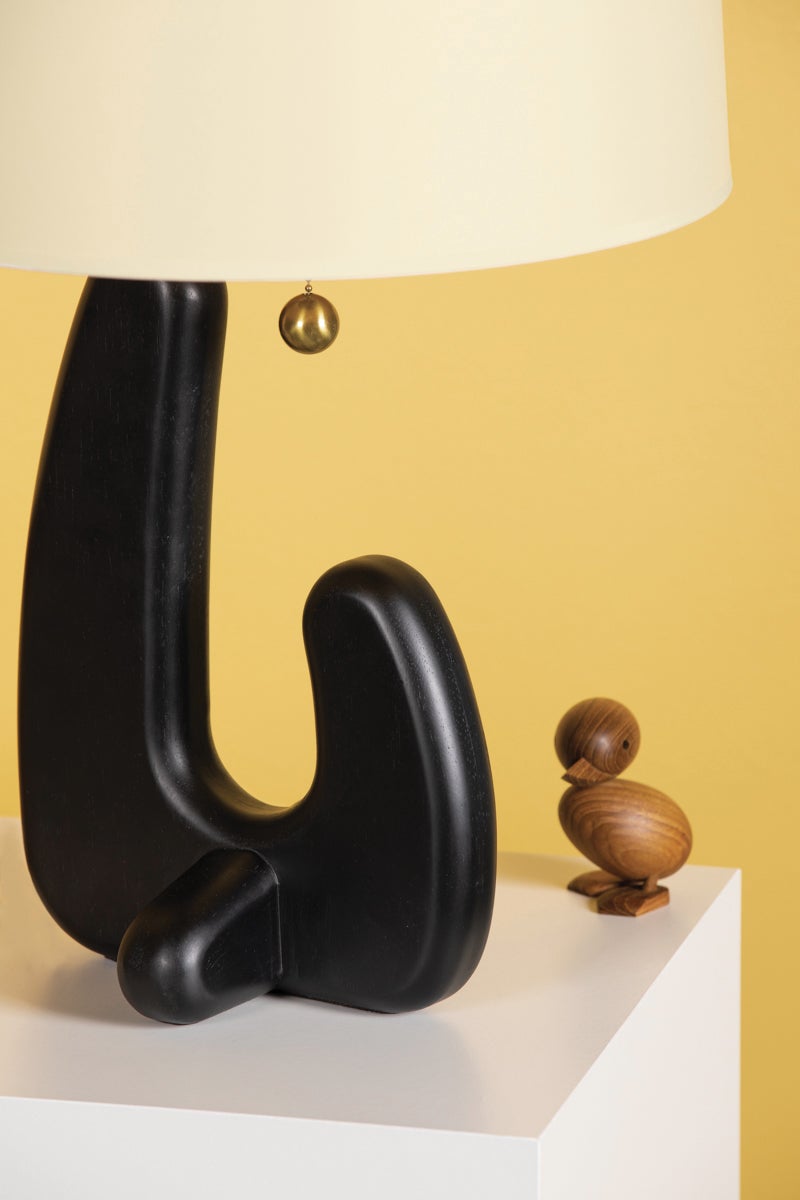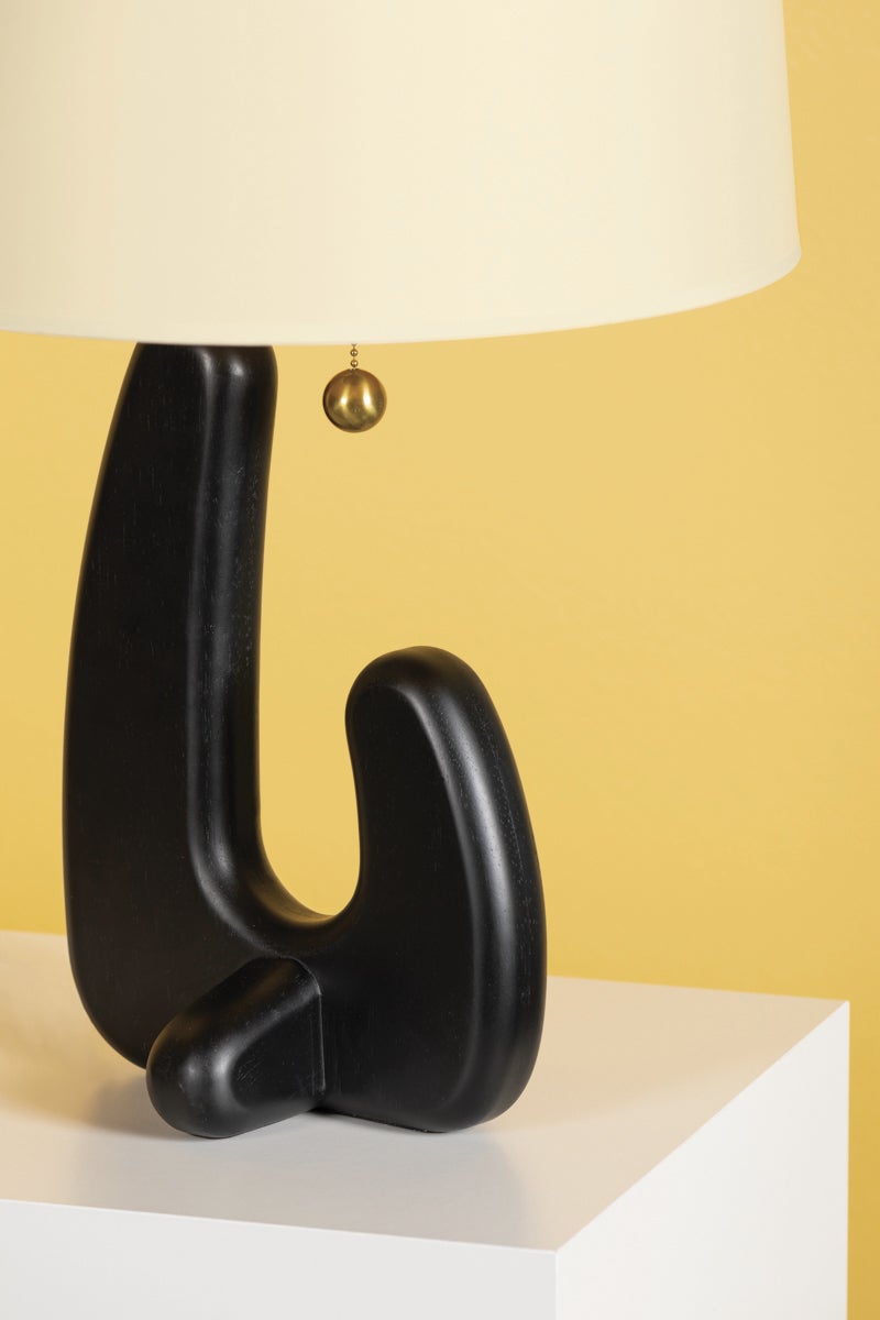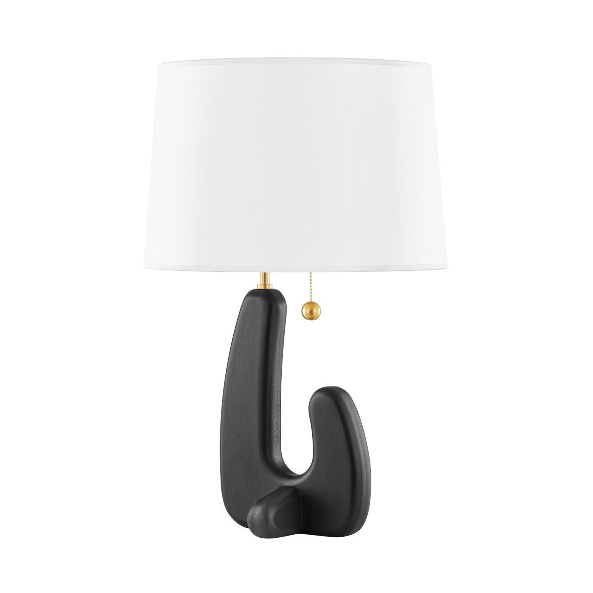 An oversize bauble at the end of the beaded pull chain hangs perfectly in the space created by the modern, sculptural base, giving this table lamp its asymmetrical but balanced feel. The visible grain in the blackened wood base and cream paper shade work beautifully with the Aged Brass details. Regina brings a chic, elevated look to tabletops throughout the home. Part of our Home Ec. x Mitzi Tastemakers collection.
