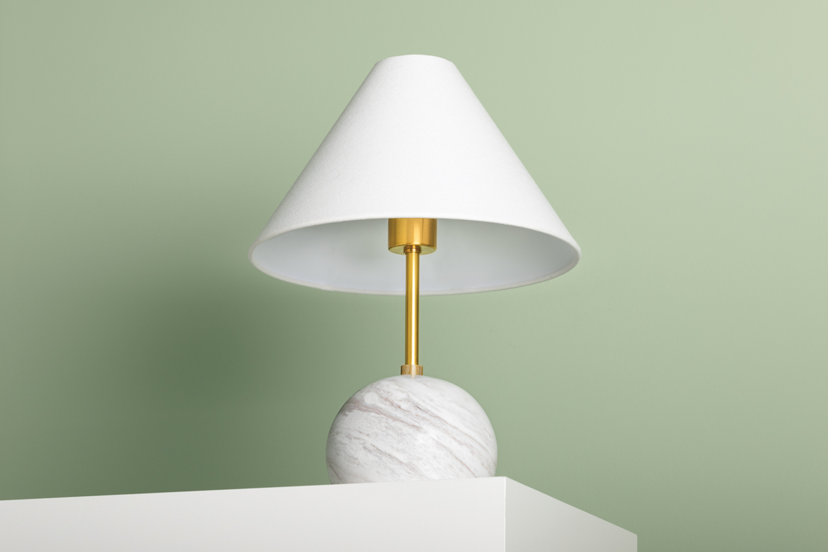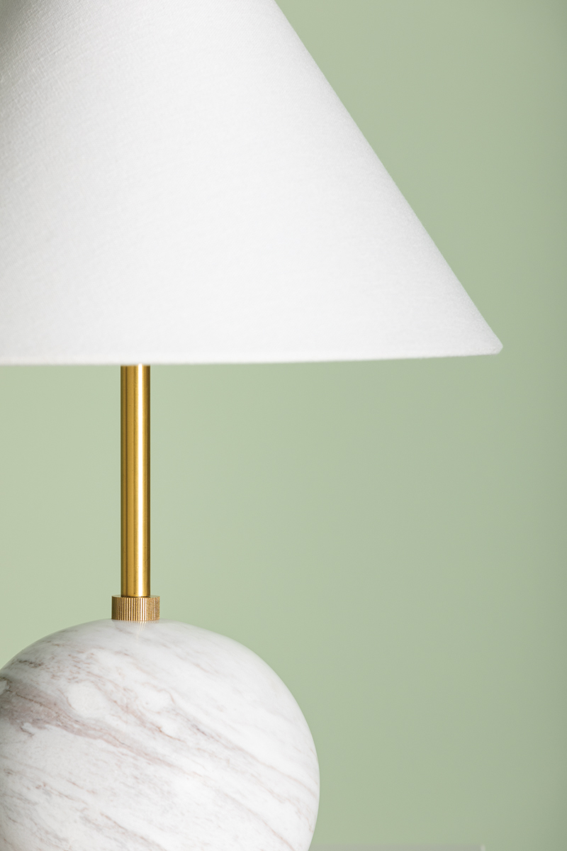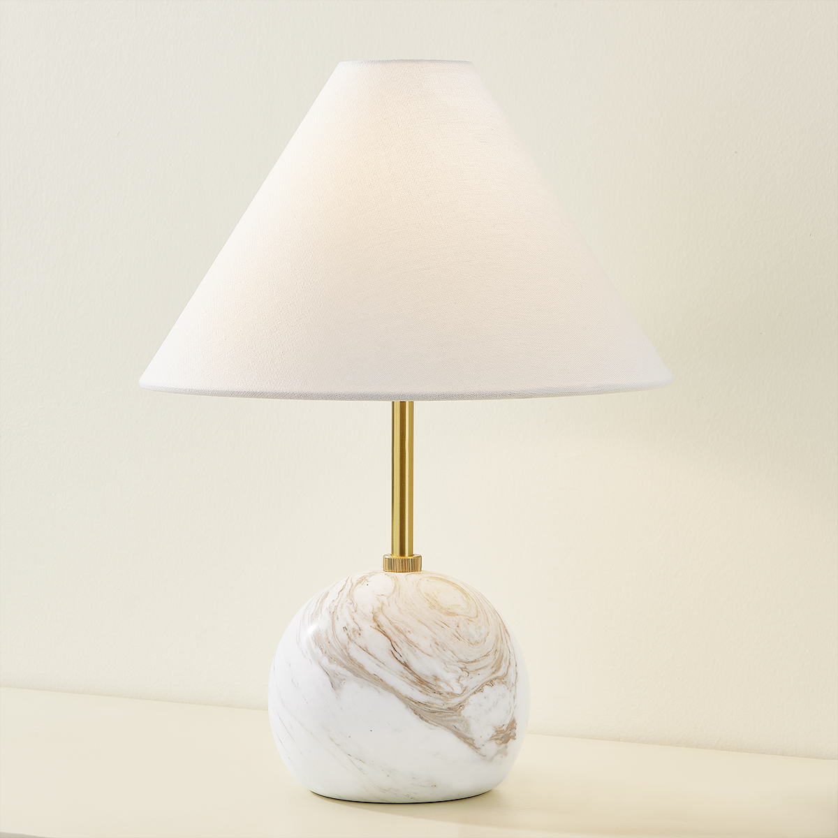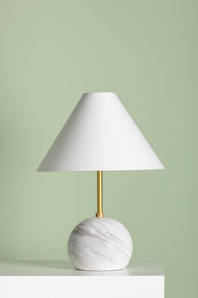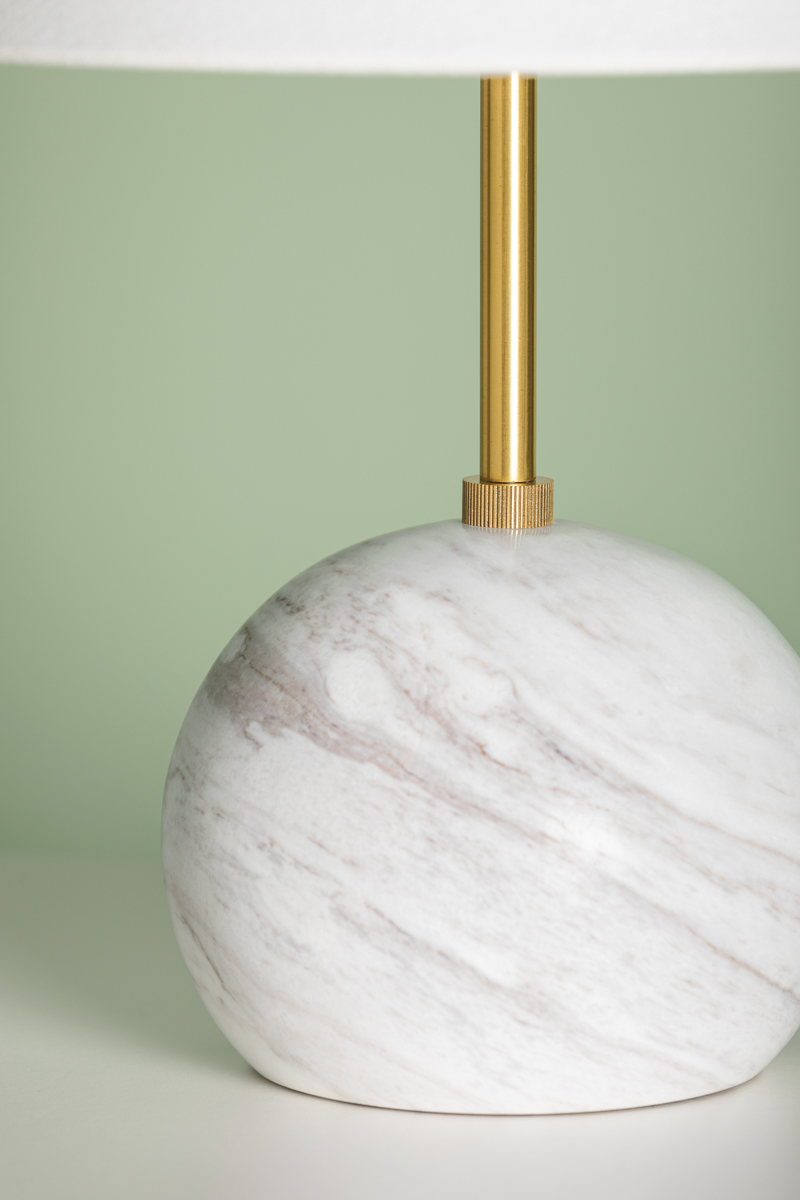 Petite, yet statuesque, Jewel marries distinctive materials and geometric shapes. Sculpted from honed Calcutta gold marble, the spherical body supports a sleek, elongated neck in Aged Brass. A tapered white linen shade tops this table lamp, bringing texture to any space.