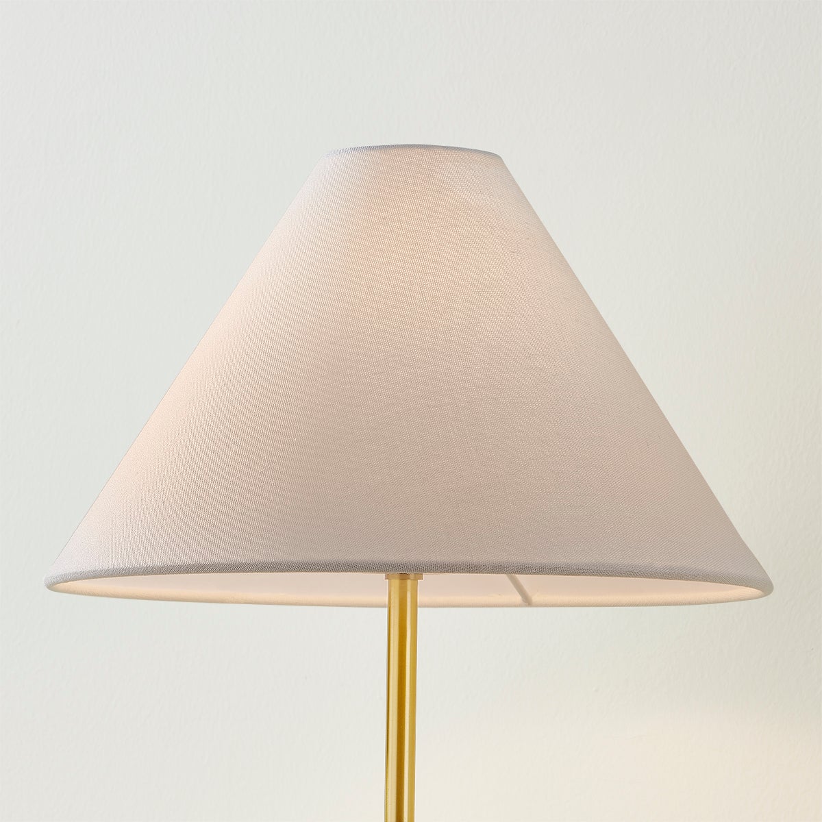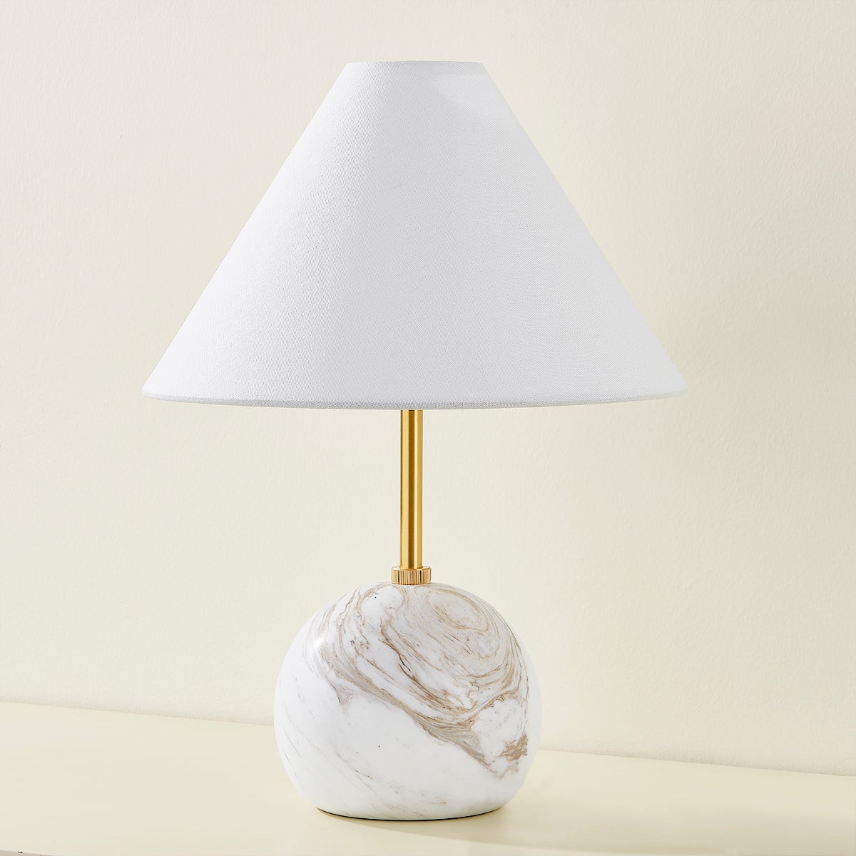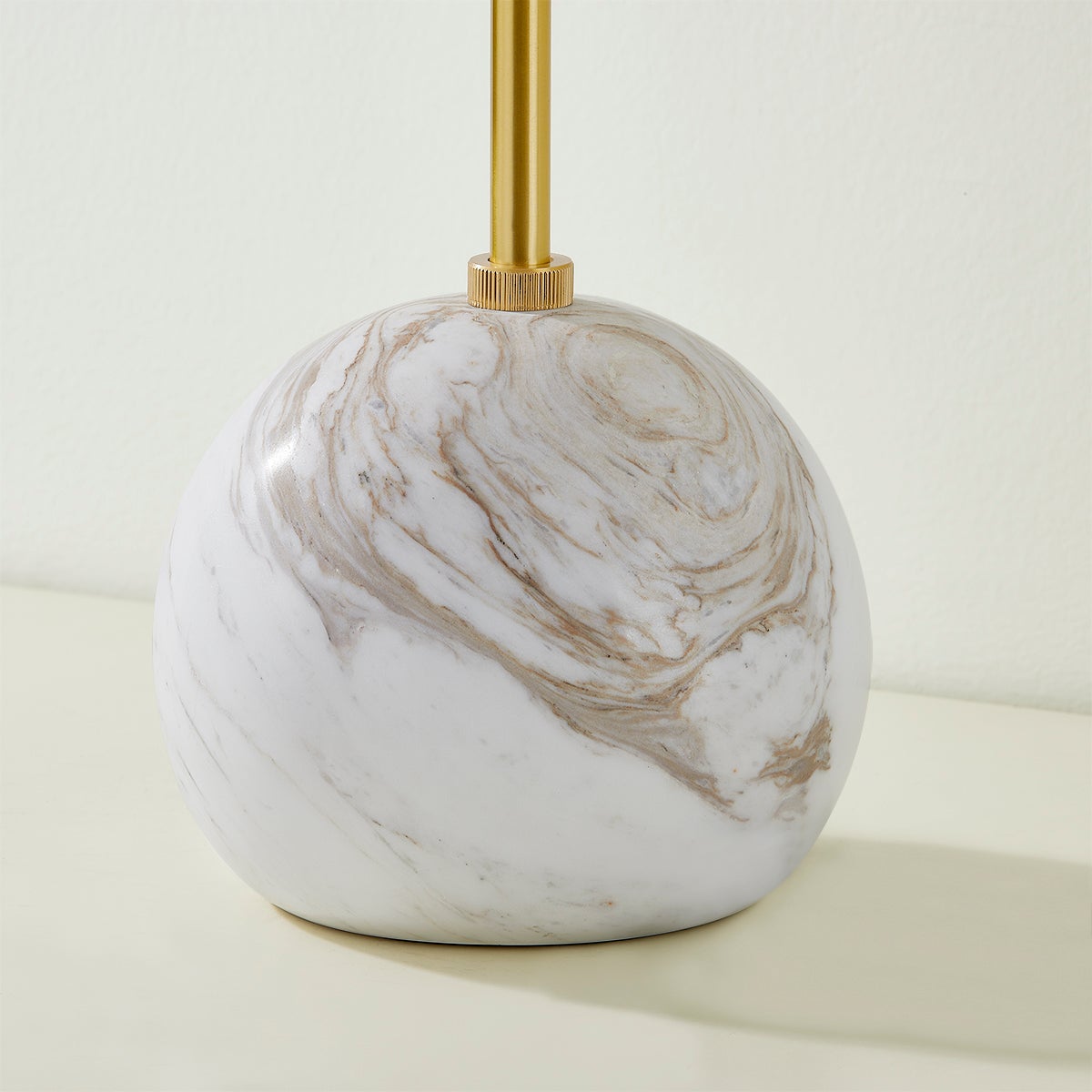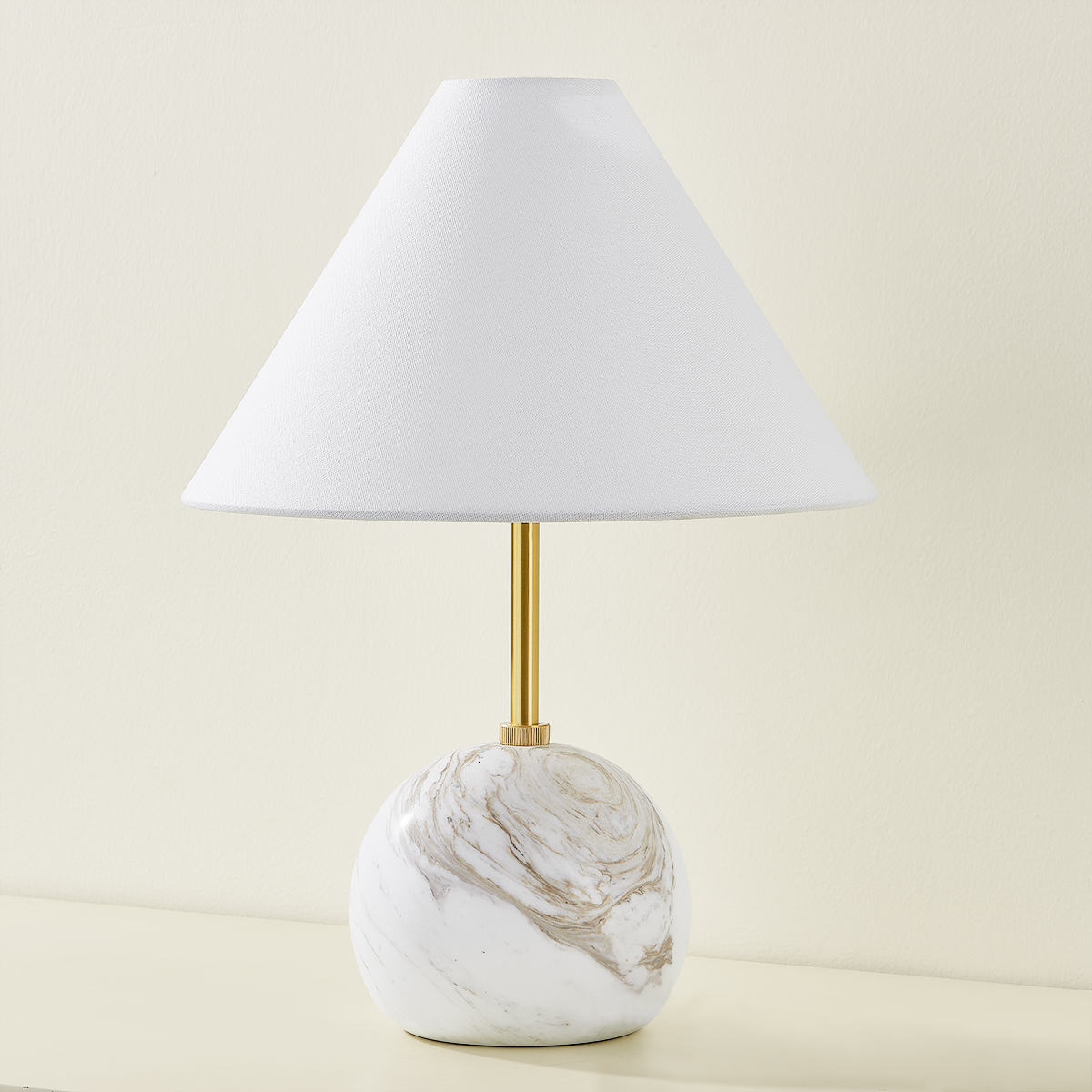 Petite, yet statuesque, Jewel marries distinctive materials and geometric shapes. Sculpted from honed Calcutta gold marble, the spherical body supports a sleek, elongated neck in Aged Brass. A tapered white linen shade tops this table lamp, bringing texture to any space.
