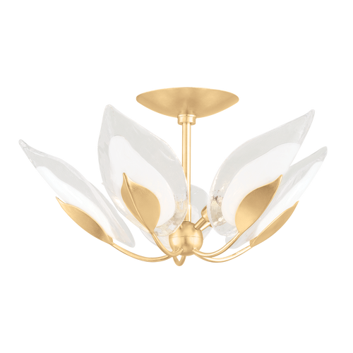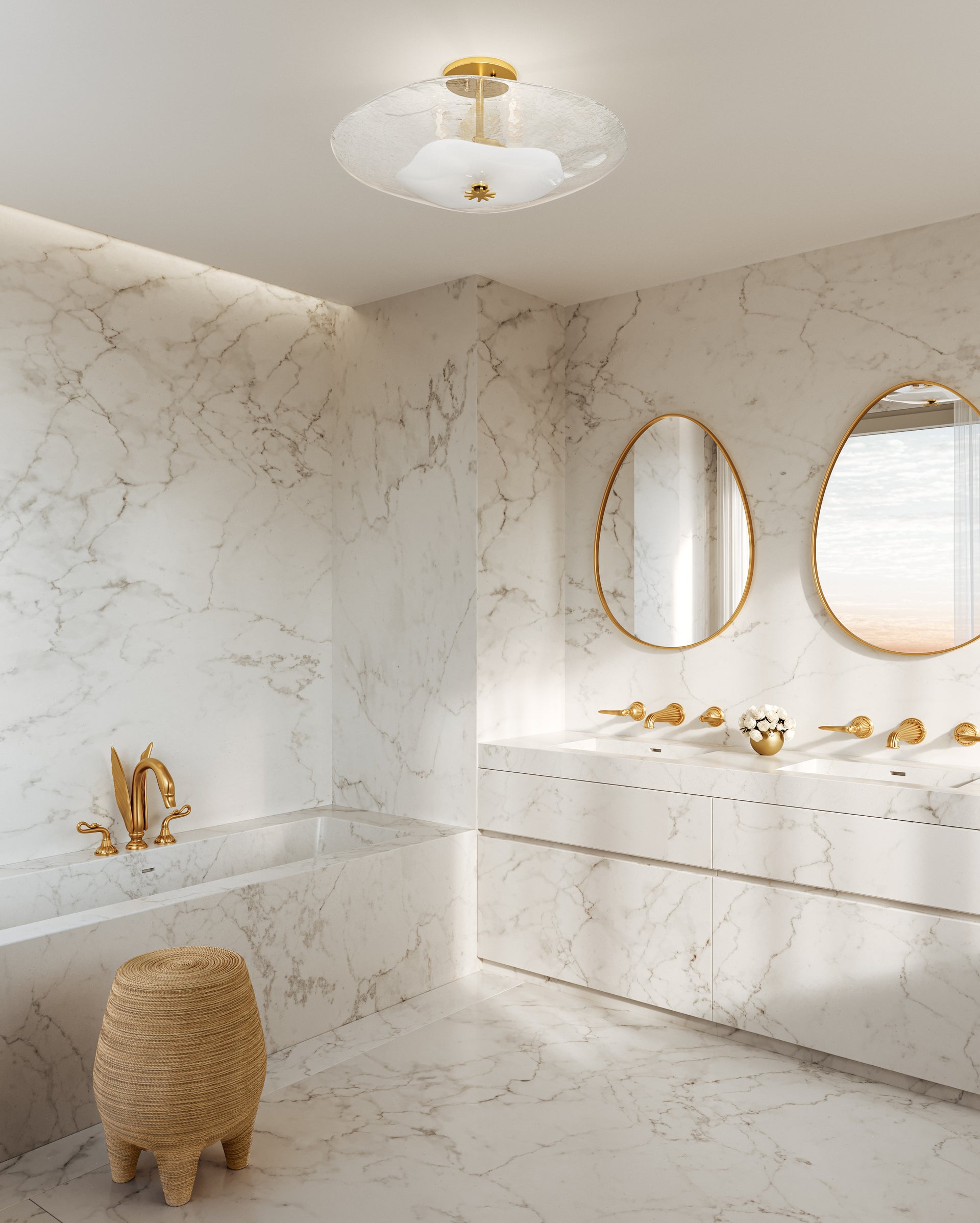 Glass takes center stage in this exquisite flush mount. The round shade is made of a thick piece of hand-blown piastra glass, each with a unique, opaque Blonchino at the center. Mounted close to the ceiling, light fills the shade and reflects off the ceiling back into it, creating a mesmerizing, almost motion-like glow. The decorative aged brass finial adds to the piece's distinctive design.