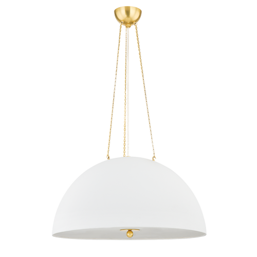 Clean, sleek and decidedly modern, Brim is full of style. The traditional pendant rod is replaced by a trio of thin wires that suspend the soft white plaster shade from the canopy. The wires extend below the shade, allowing the opal glossy globe to hover beneath, rather than rest inside the shade. This unique design allows light to fully flow from the globe and also reflect off the gold leaf shade above.