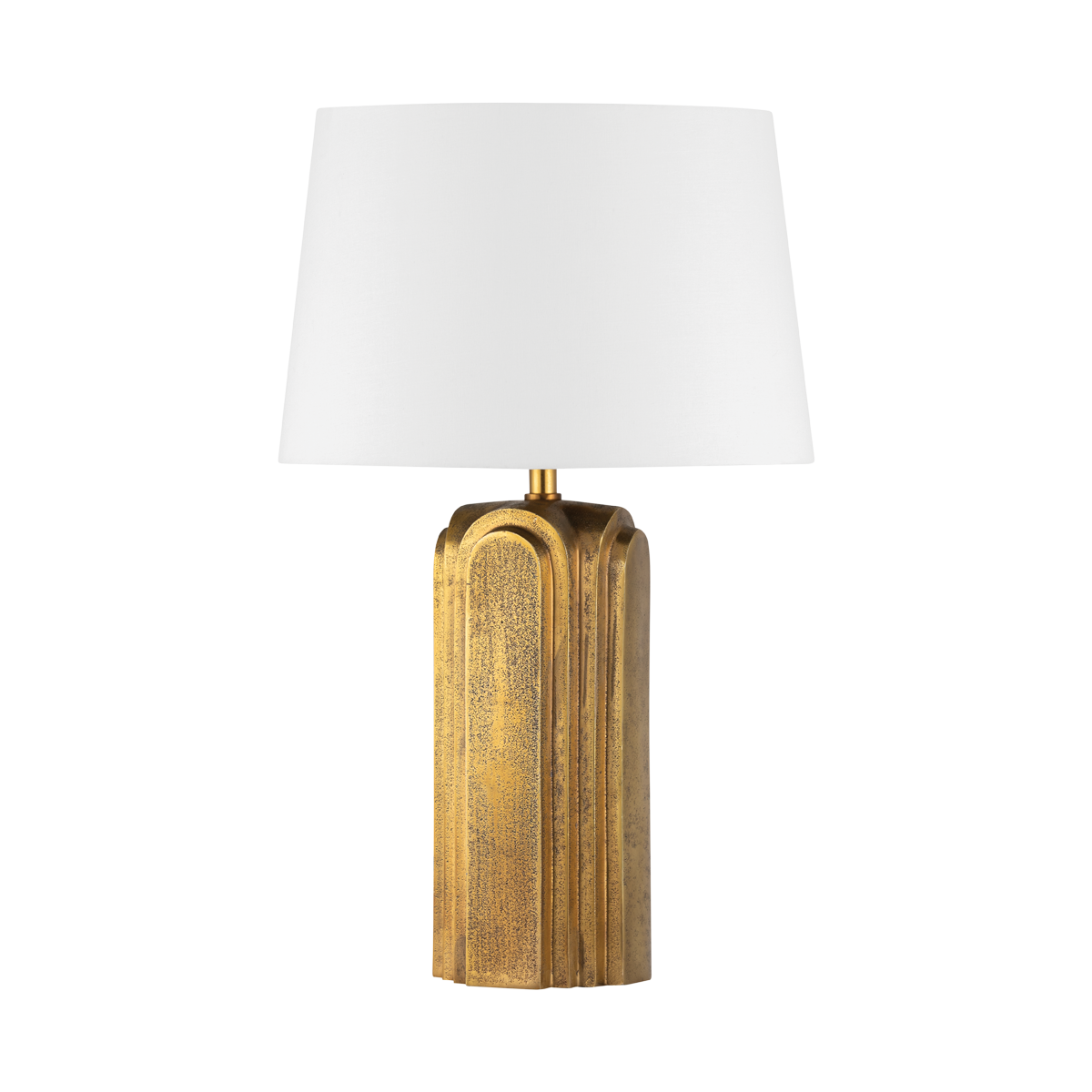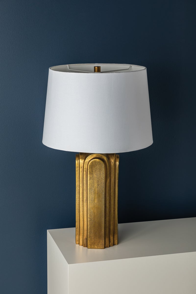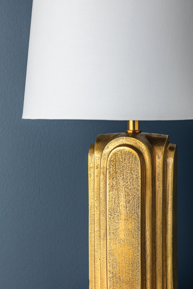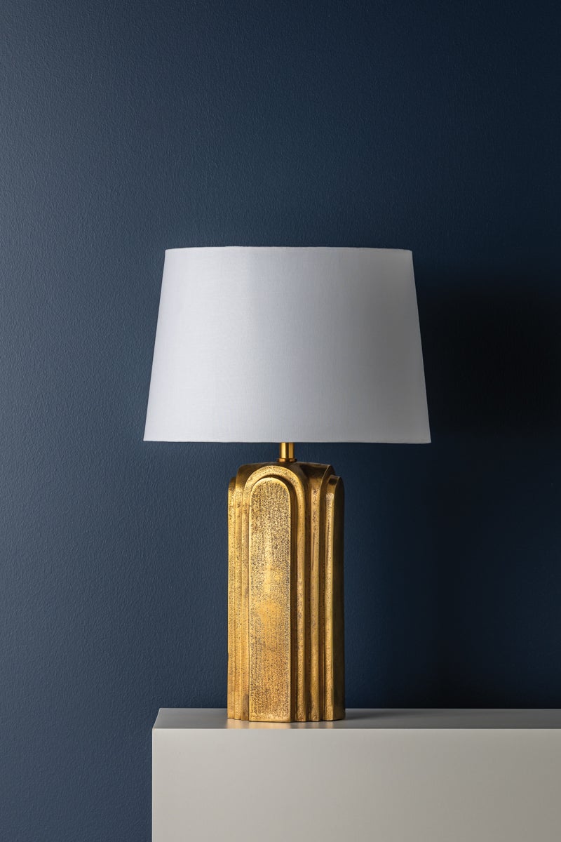 Inspired by the Art Deco period, Bergman stands straight and proud with design-led details. Cast in Aged Brass, elegant arches accent this highly architectural table lamp. An oversized white linen drum shade balances out the antique feel, emanating a soft glow when lit.