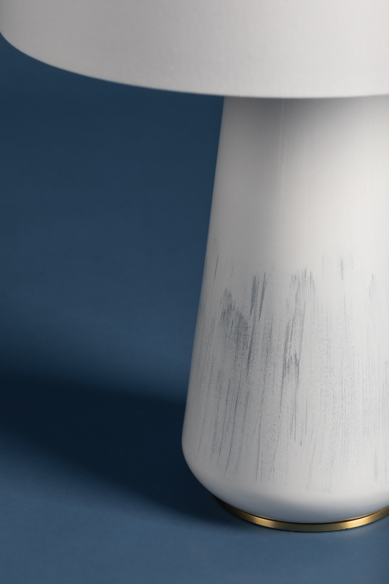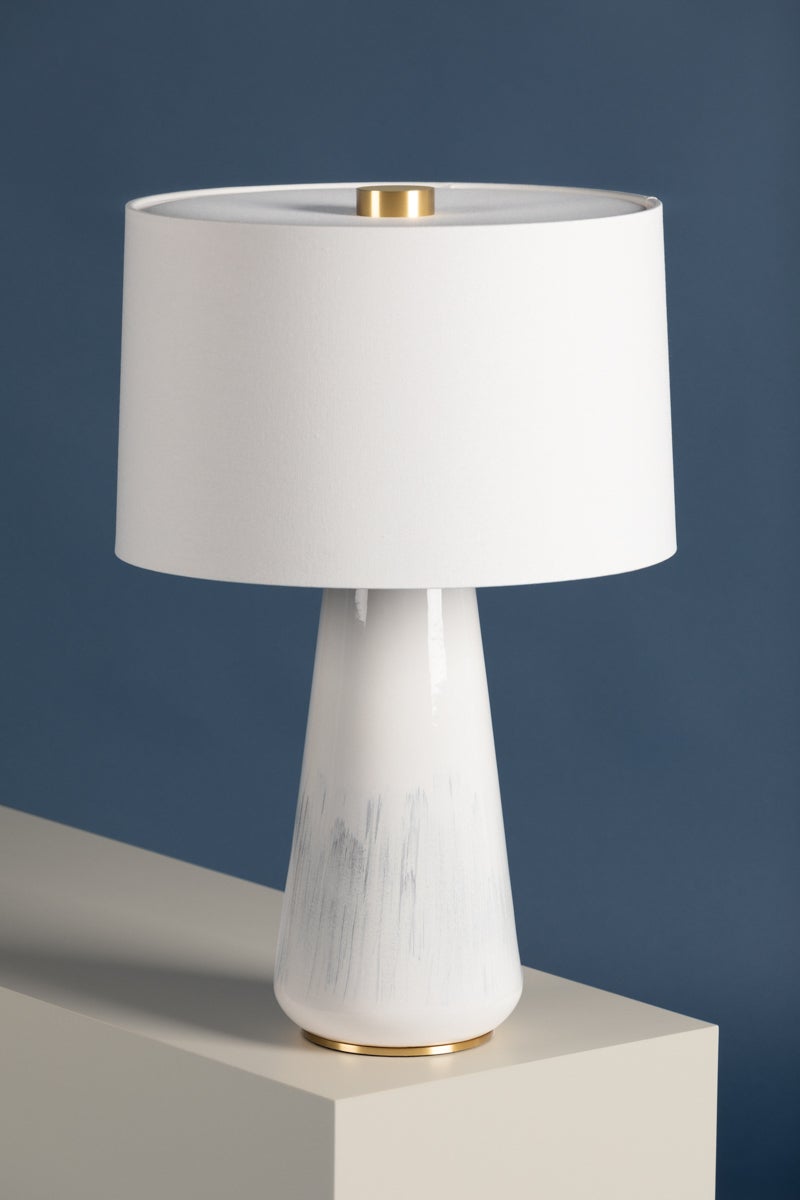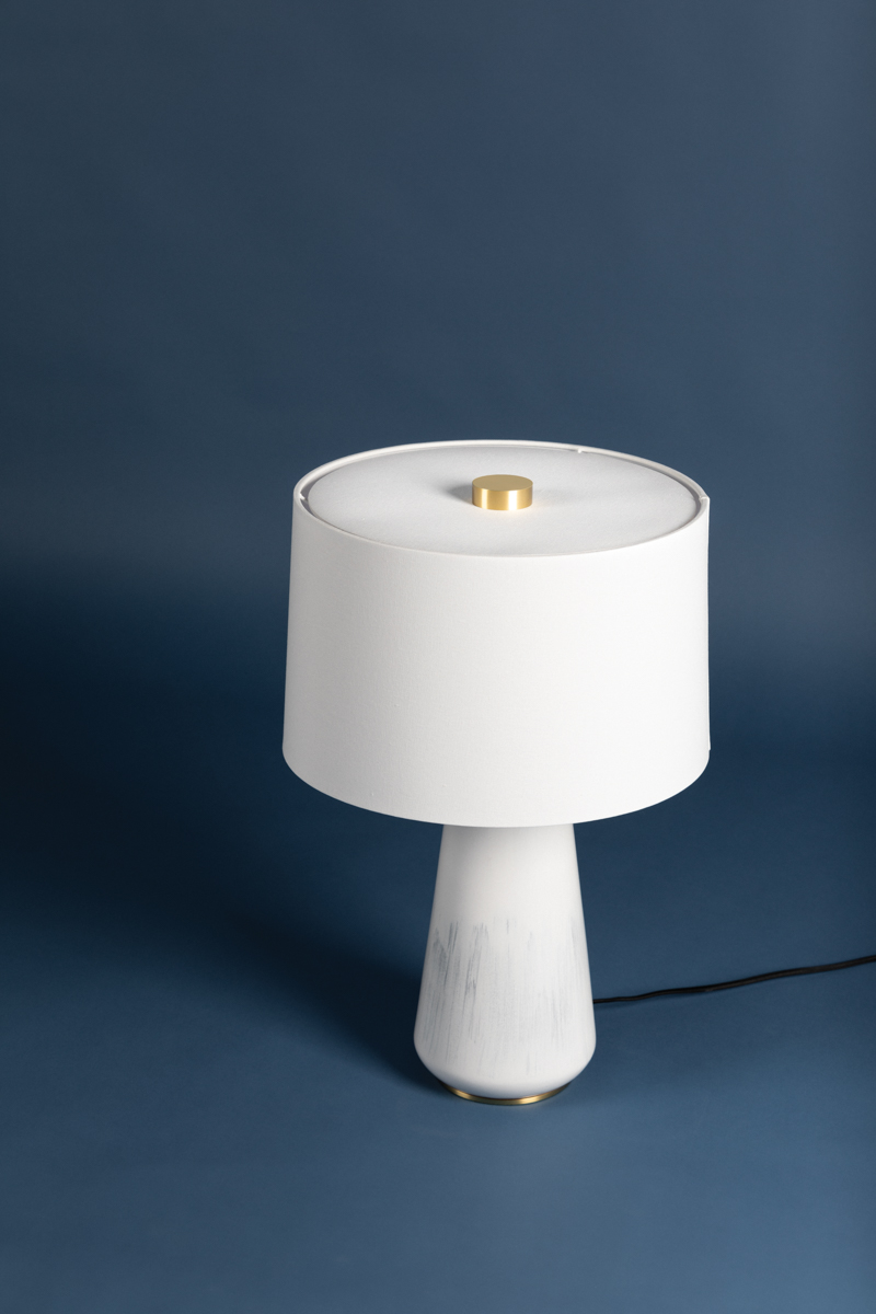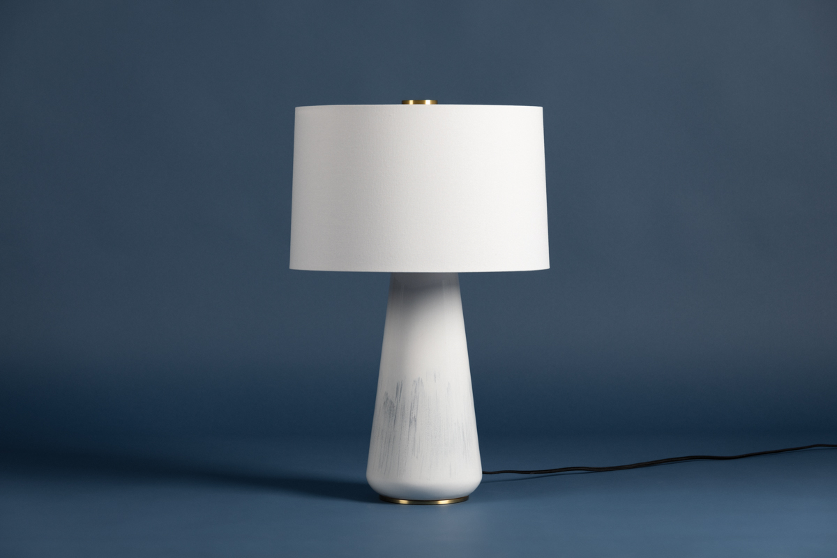 Saugerties takes a familiar table lamp form and modernizes it with a ceramic white ash finish. The widest part of the tapered base has a hand-painted, ash-like effect that adds a subtle hint of color and an organic element. An oversized finial at the top pairs well with the Aged Brass ring at the bottom.