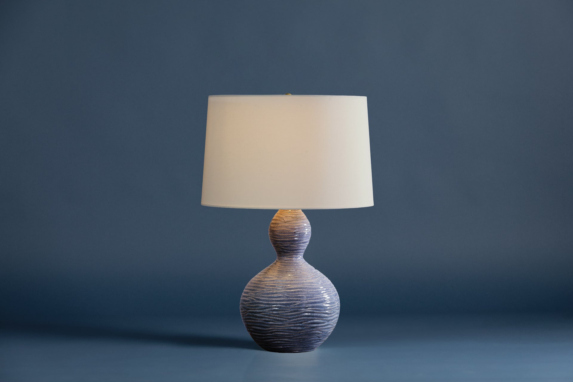 Cairns' organic bulbous shape, textured ceramic base, and white linen shade makes this table lamp a natural beauty. The Ceramic Coastal Blue finish is a reactive glaze, creating color and movement as light spills down the base.