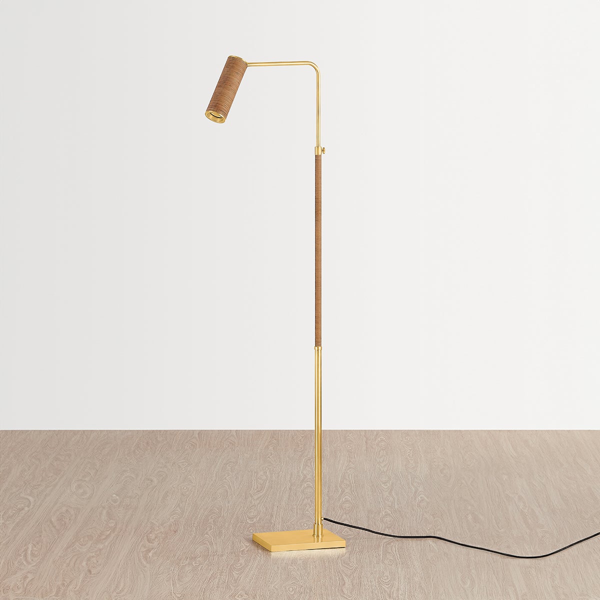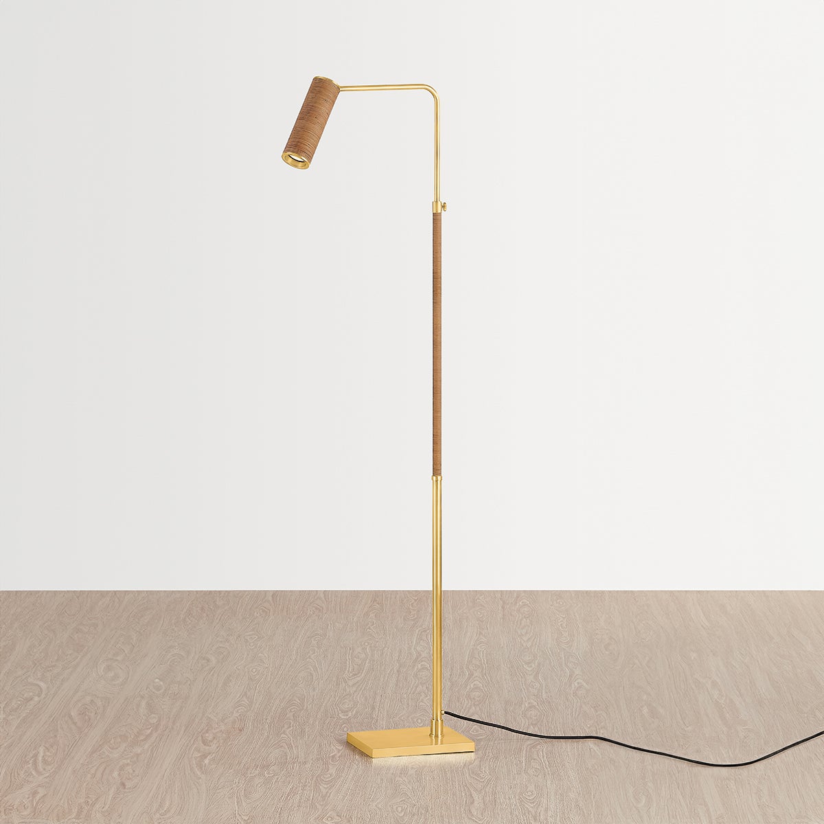 The Narragansett family tells an innovative design story marked by the use of tactile materials. While the silhouette of this sconce and floor lamp are understated, the Aged Brass metalwork and rattan-wrapped details mix hard and soft, manmade and natural. The elongated swing arm feature makes Narragansett perfect for bedside, desk, or reading nook illumination.