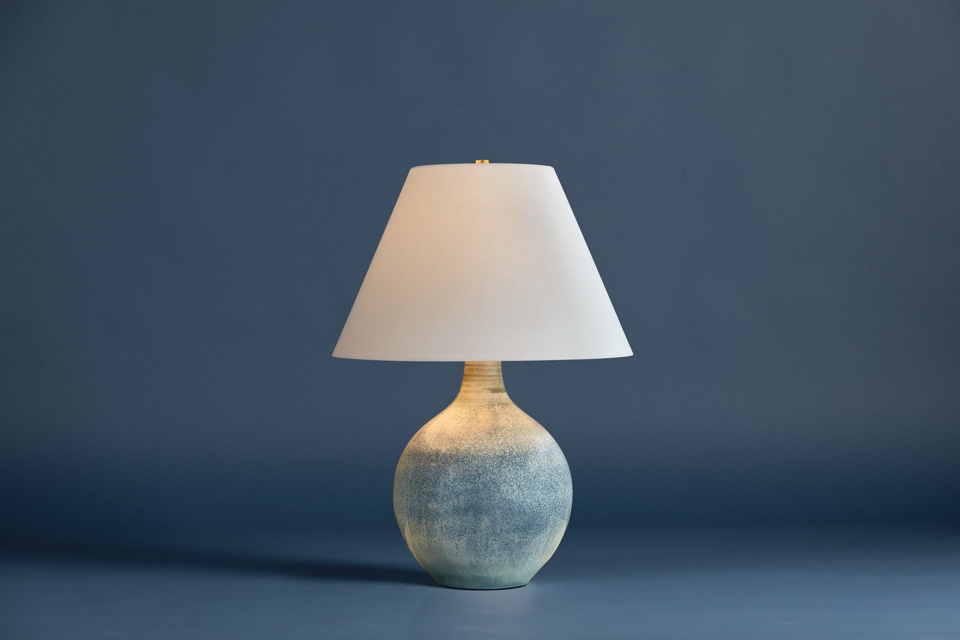 Inspired by an antique jug, Kearny features a gourd-shaped ceramic base with a painterly treatment. The variations of blue in the glaze add interest while connecting this artistic table lamp to the outdoors. The conical white linen shade offsets the base with a contemporary lift.