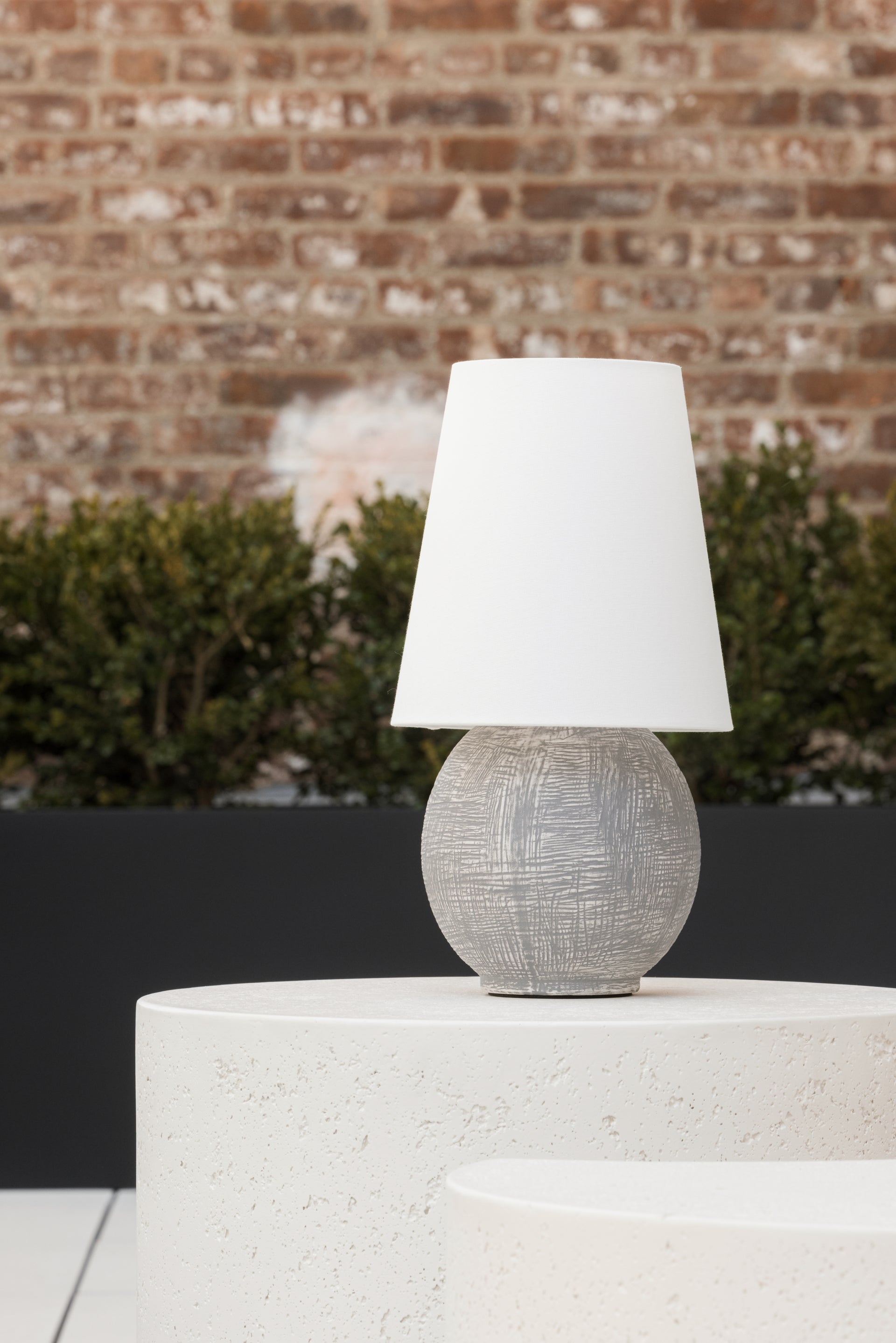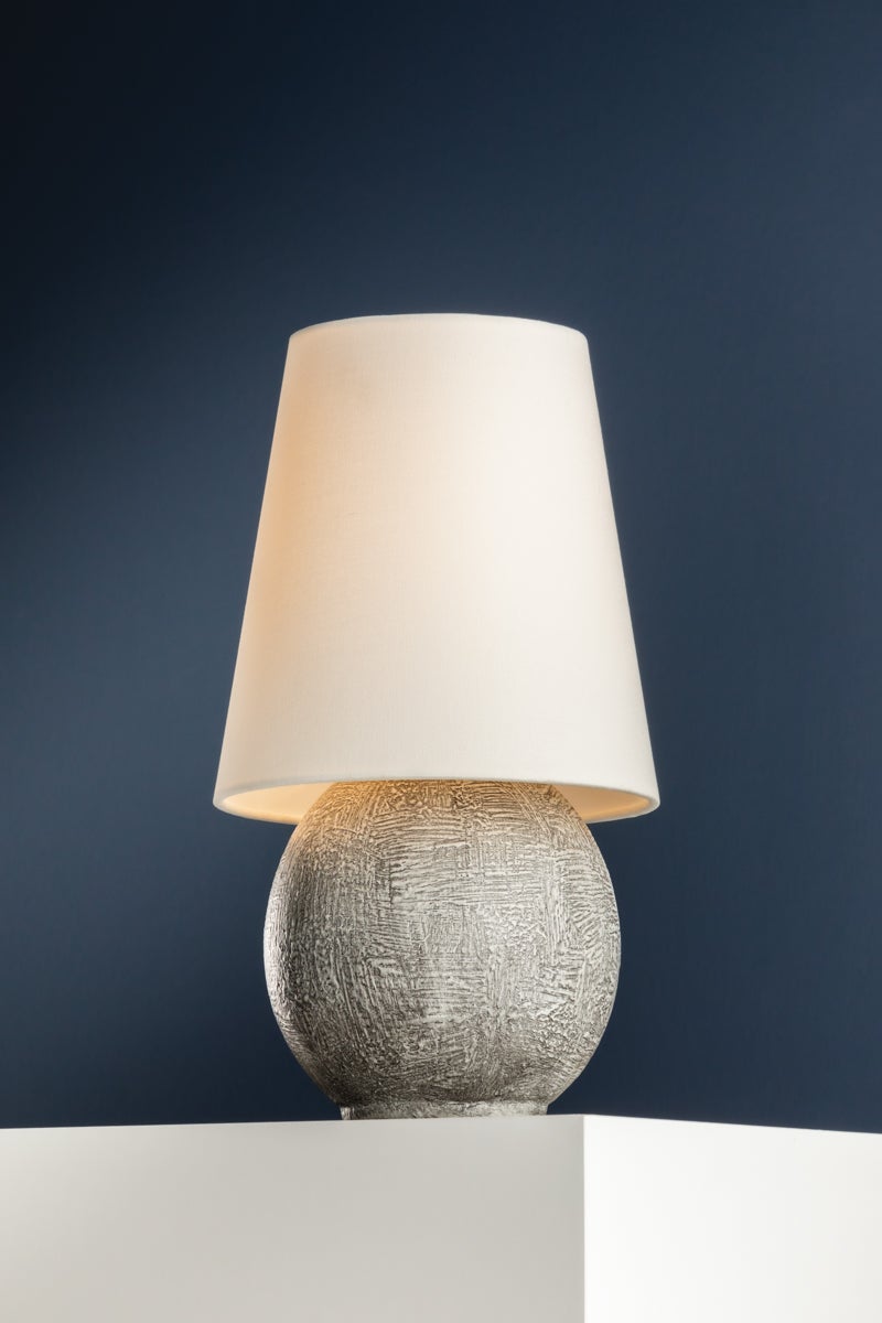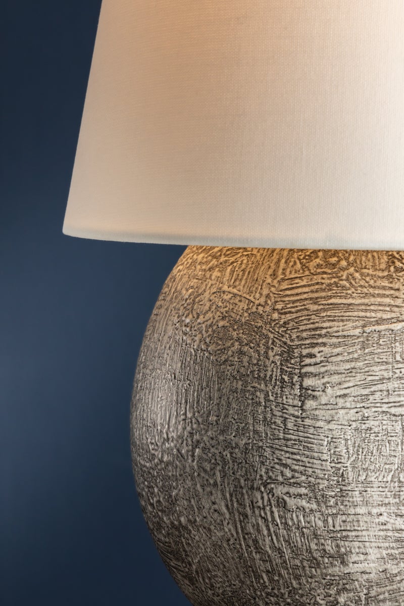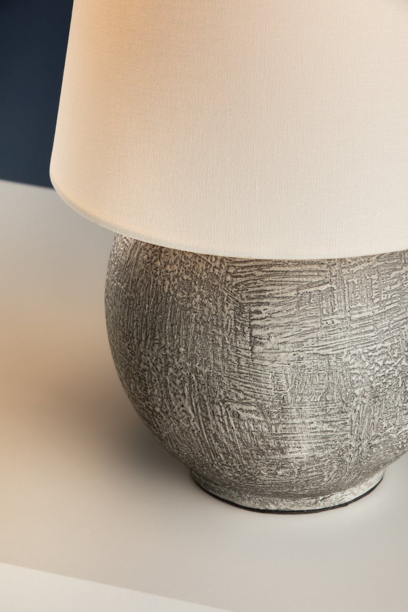 A celebration of unique proportions, Ulsterville features an oversized linen shade paired with a spherical ceramic base. While this dimmable lamp is petite, the textured finish gives it an artifact-like charm that makes it stand out as a focal point. Equipped with rechargeable LED lighting, Ulsterville is portable for versatile styling. The battery life is dependent on the brightness level set by the user, and it recharges in 3.5 hours. Ulsterville can also be used while charging.