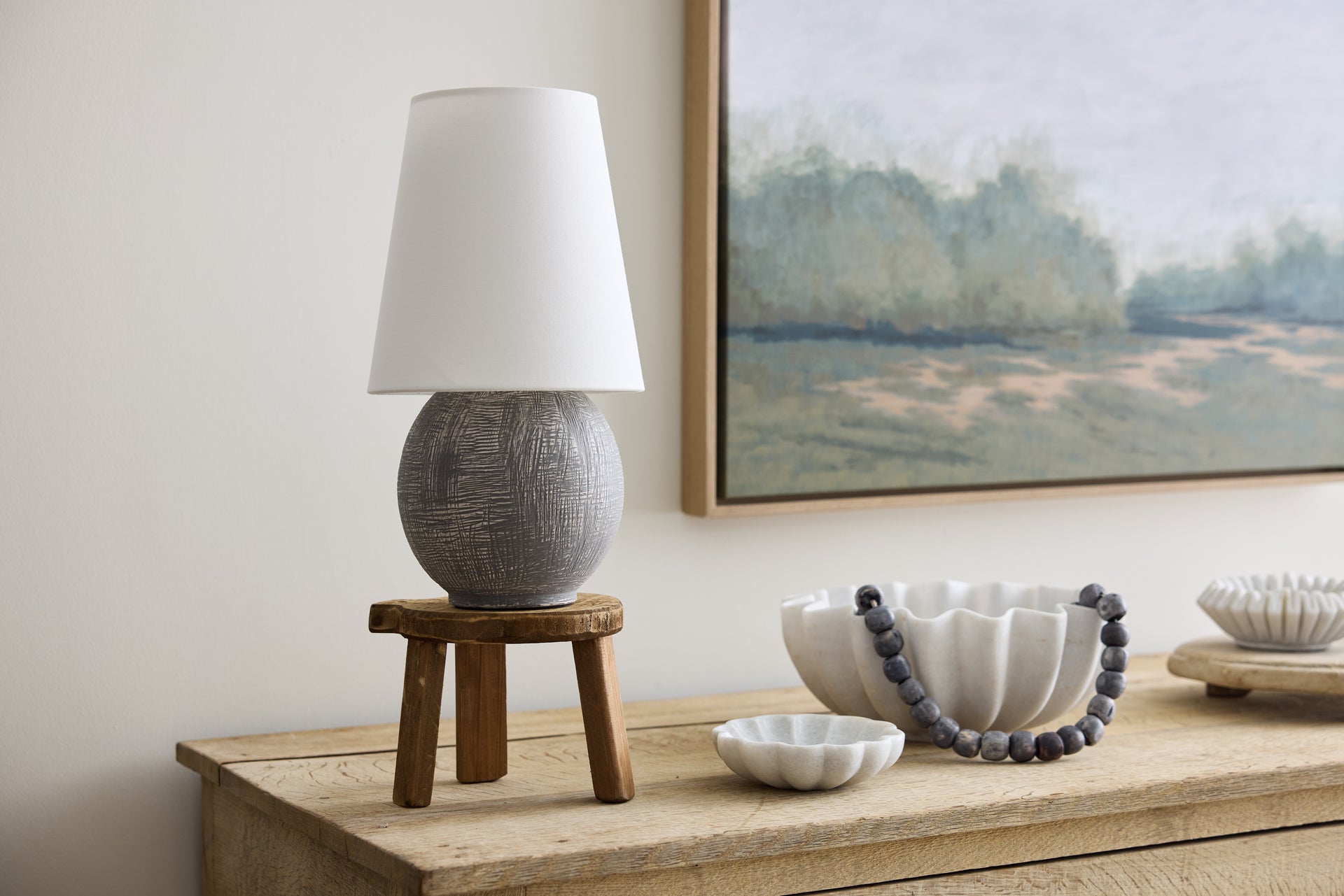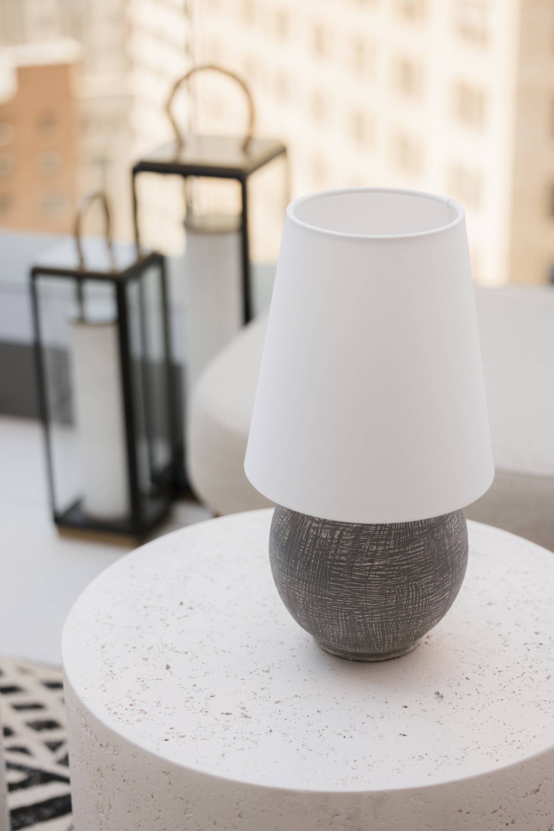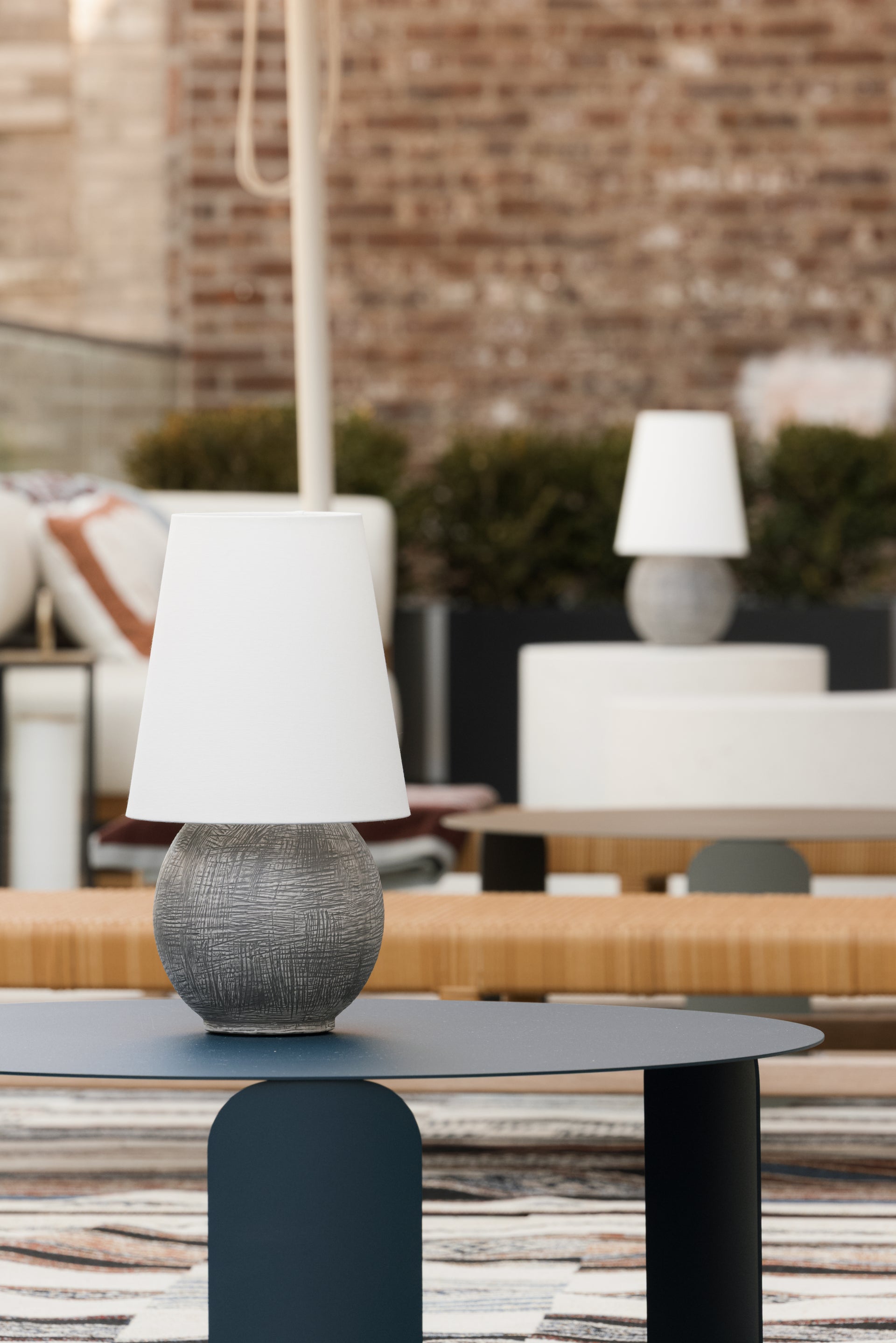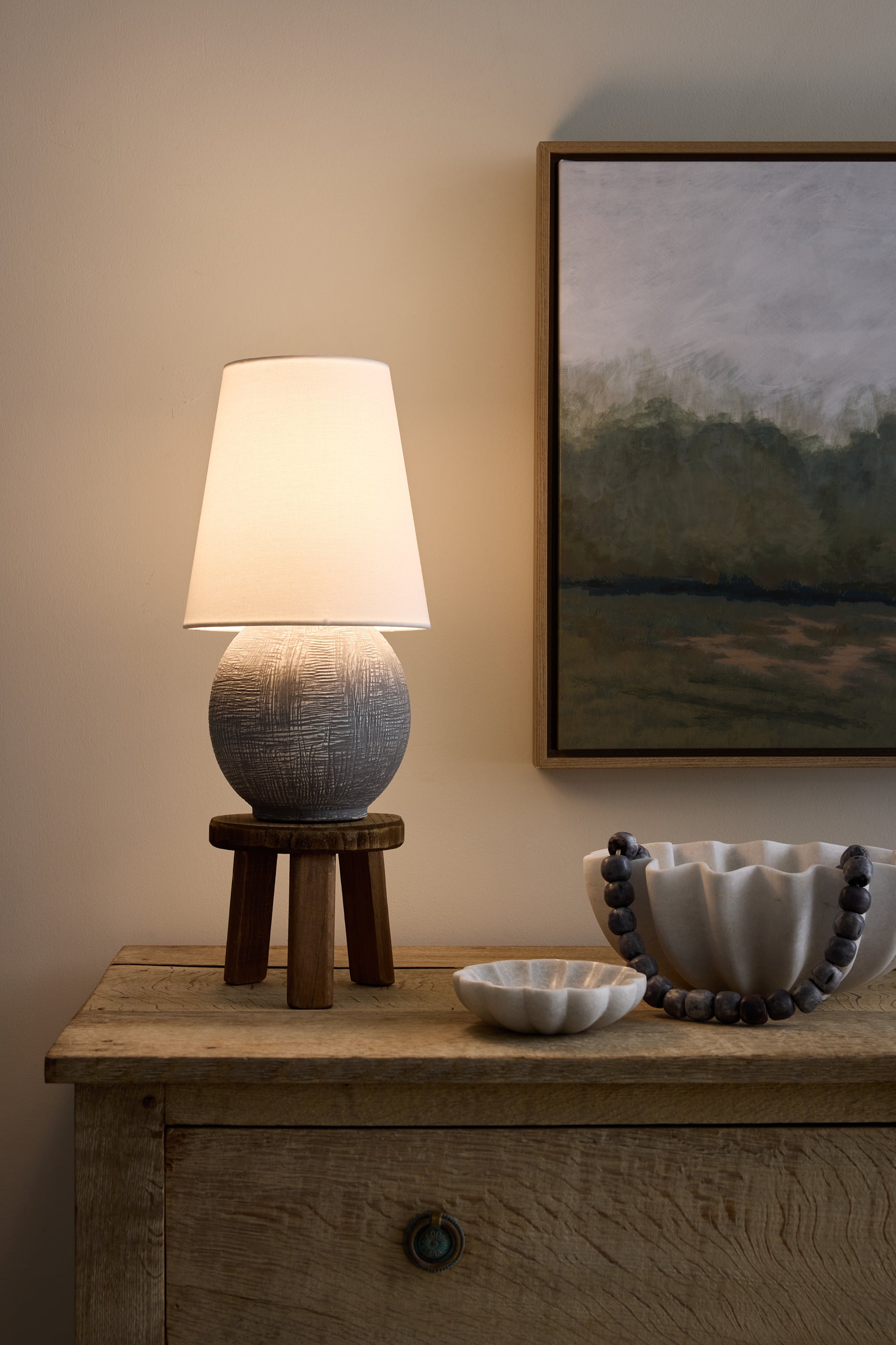 A celebration of unique proportions, Ulsterville features an oversized linen shade paired with a spherical ceramic base. While this dimmable lamp is petite, the textured finish gives it an artifact-like charm that makes it stand out as a focal point. Equipped with rechargeable LED lighting, Ulsterville is portable for versatile styling. The battery life is dependent on the brightness level set by the user, and it recharges in 3.5 hours. Ulsterville can also be used while charging.
