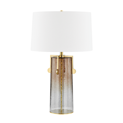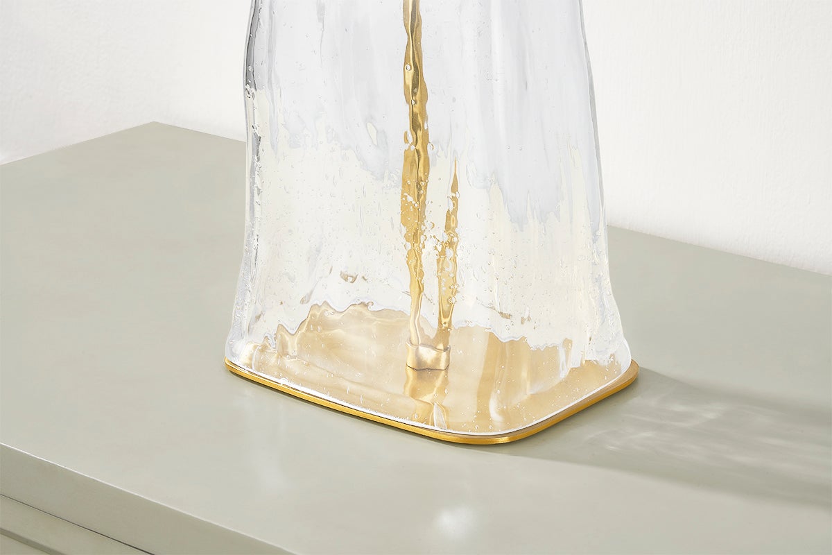 Resembling ice, the clear bubble glass structure of this table lamp presents a glacial vision of modern design. The crisp white linen shade and Aged Brass frame balance the fixture with a sense of warmth. As a finishing touch, a discreet black twisted cord blends seamlessly with modern surroundings.