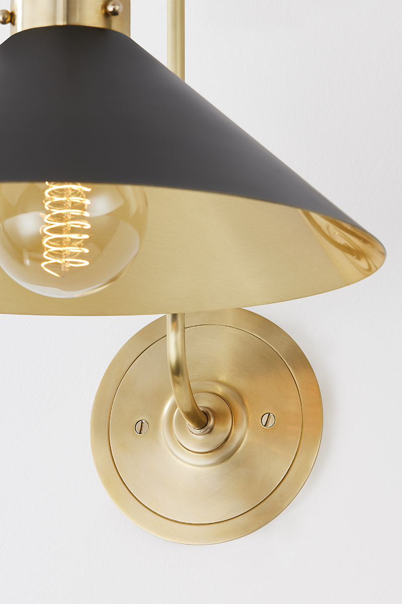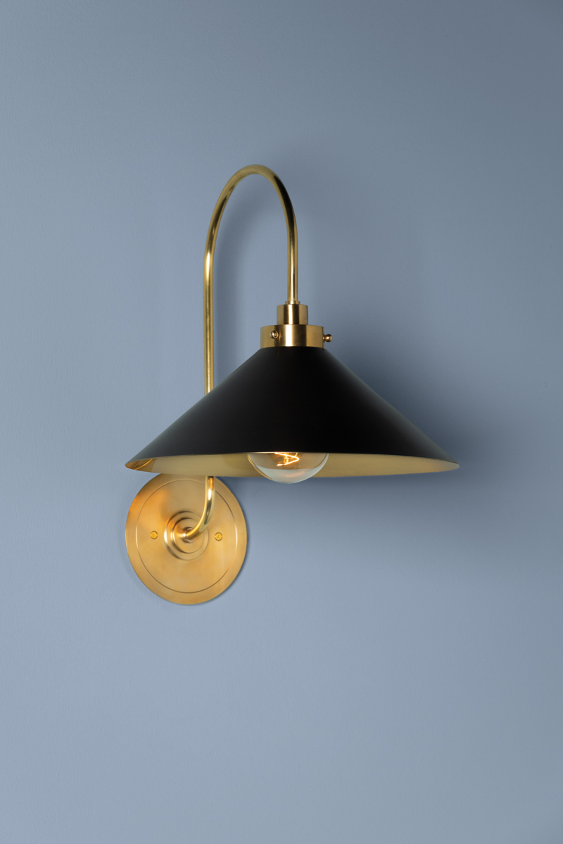 This classic metal shade design feels special with fresh finish combinations and sleek, heritage-inspired details. The contrastiing Aged Brass accents and modern gooseneck arm allow the pendants and sconce an updated, yet classic feel. The tapered shade over a five-light candelabra give the chandelier new traditional appeal. Each fixture features an Aged Brass or Polished Nickel shade that is metal on the inside and painted Off-White, Distressed Bronze or Bird Blue on the outside. Part of our Mark D. Sikes collection.