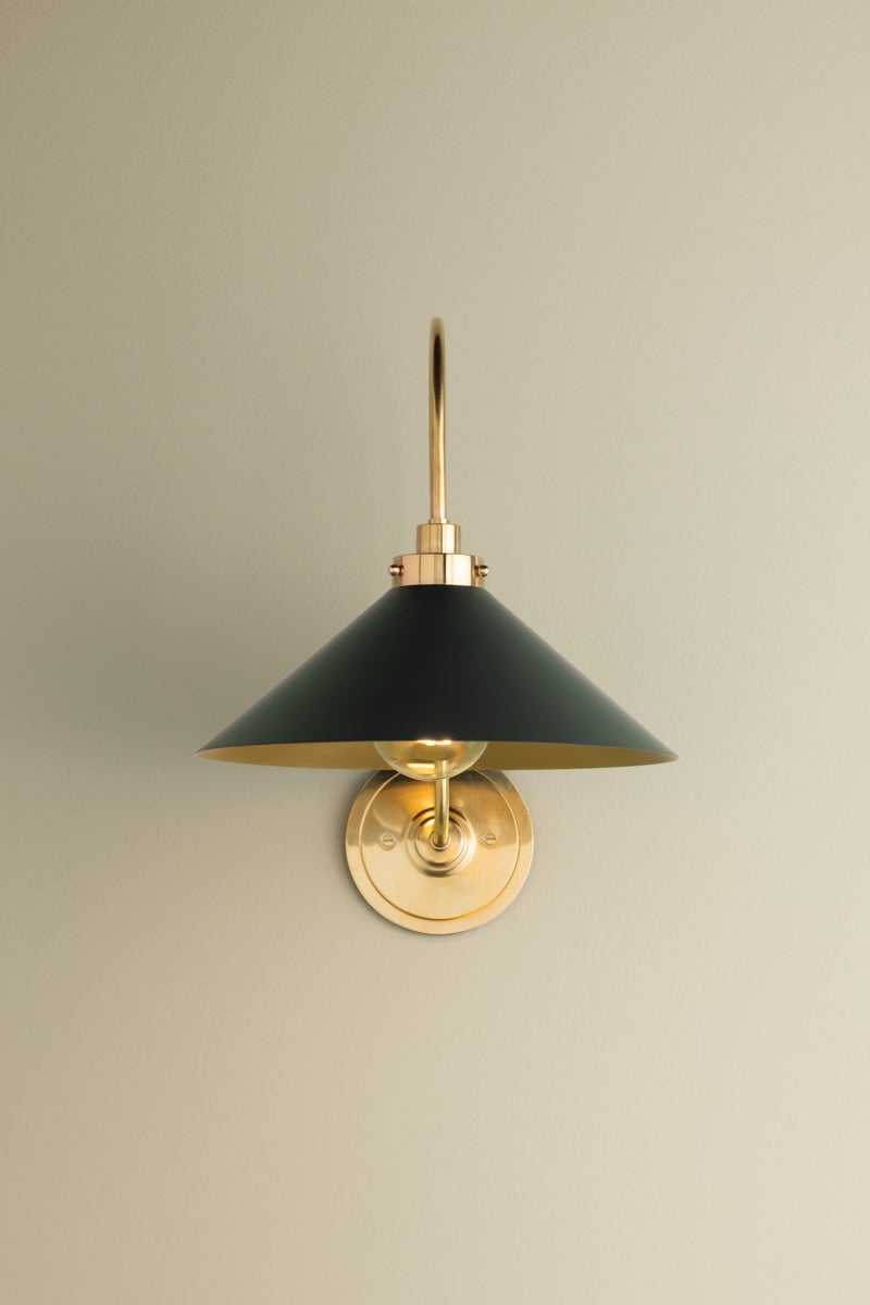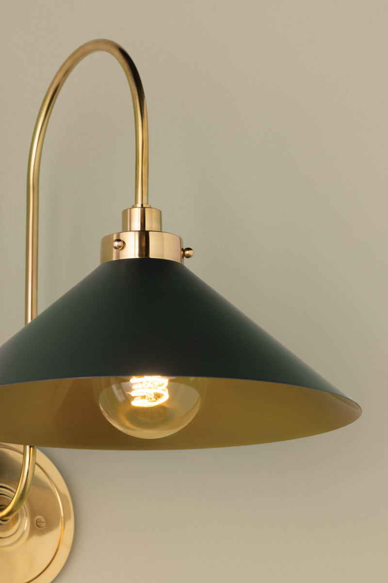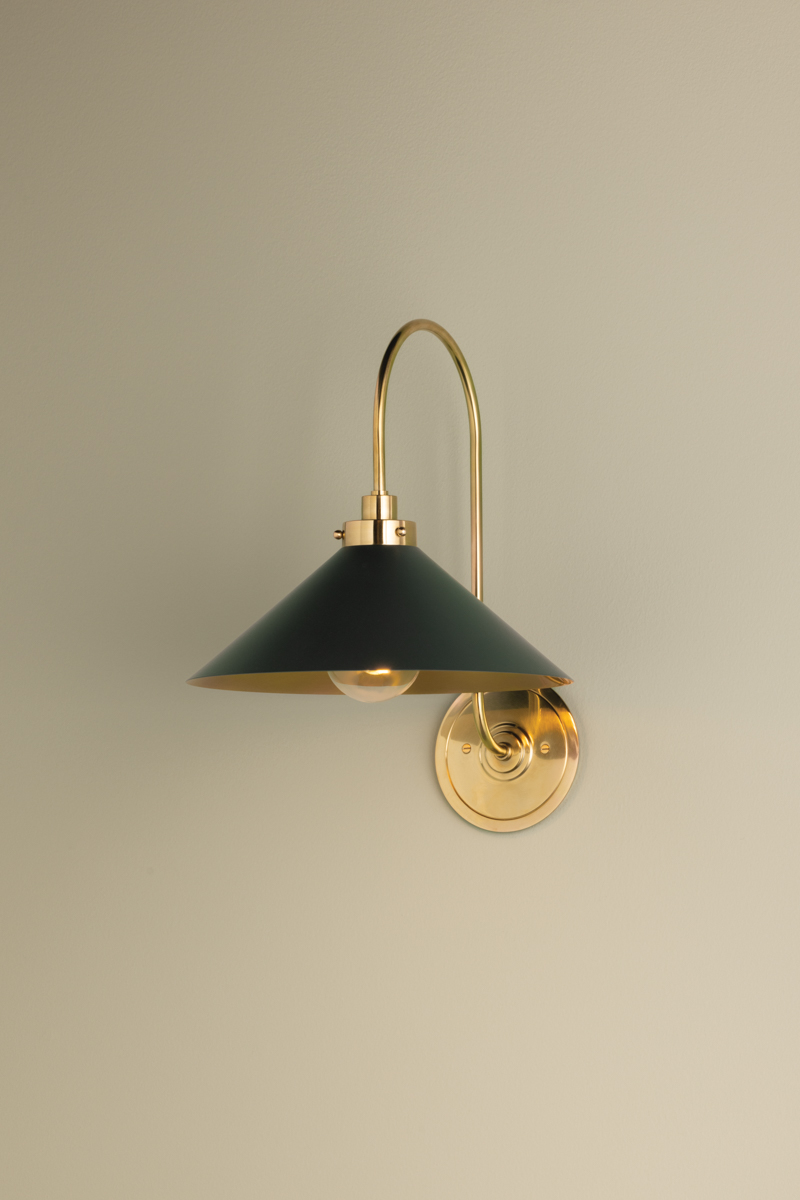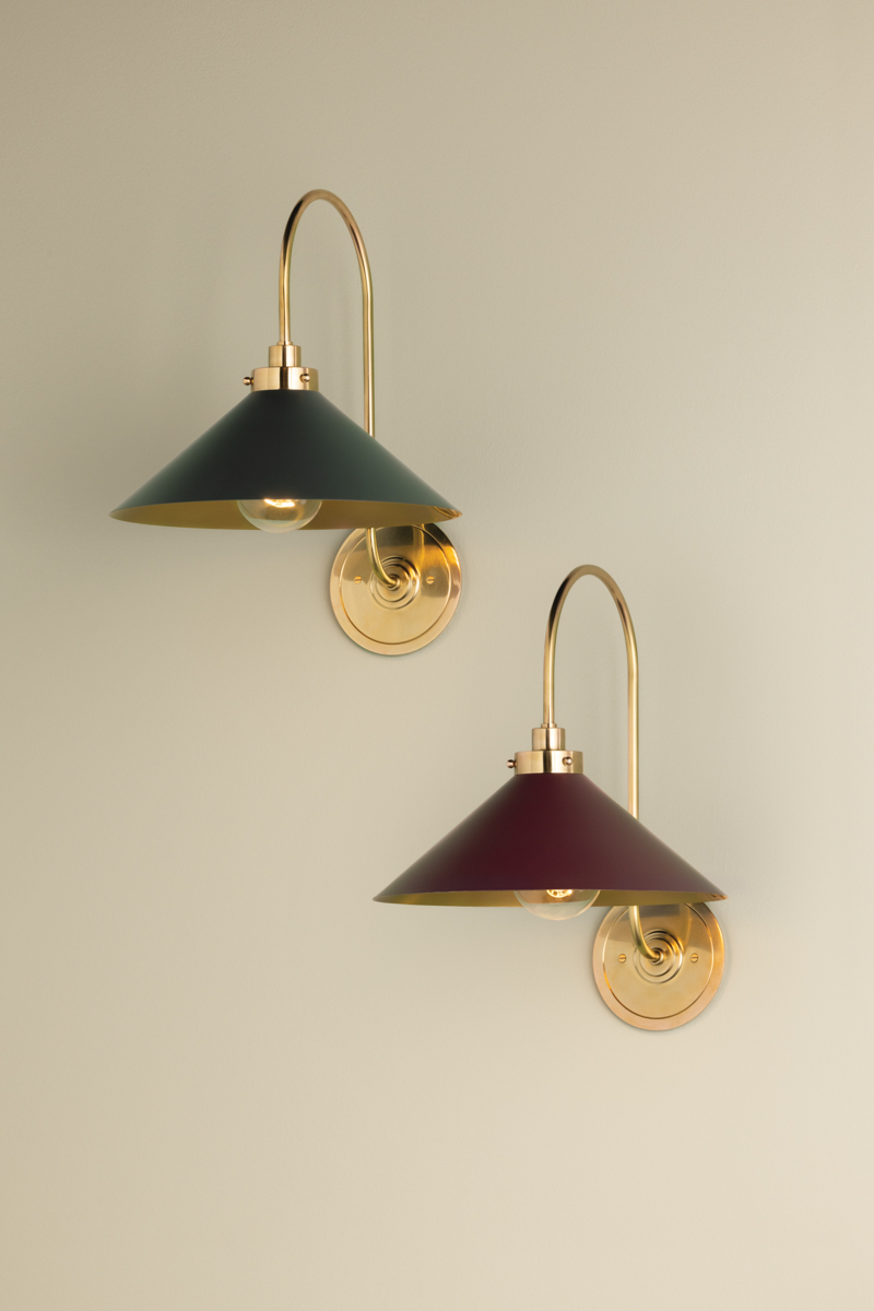 This classic metal shade design feels special with fresh finish combinations and sleek, heritage-inspired details. The contrastiing Aged Brass accents and modern gooseneck arm allow the pendants and sconce an updated, yet classic feel. The tapered shade over a five-light candelabra give the chandelier new traditional appeal. Each fixture features an Aged Brass or Polished Nickel shade that is metal on the inside and painted Off-White, Distressed Bronze or Bird Blue on the outside. Part of our Mark D. Sikes collection.