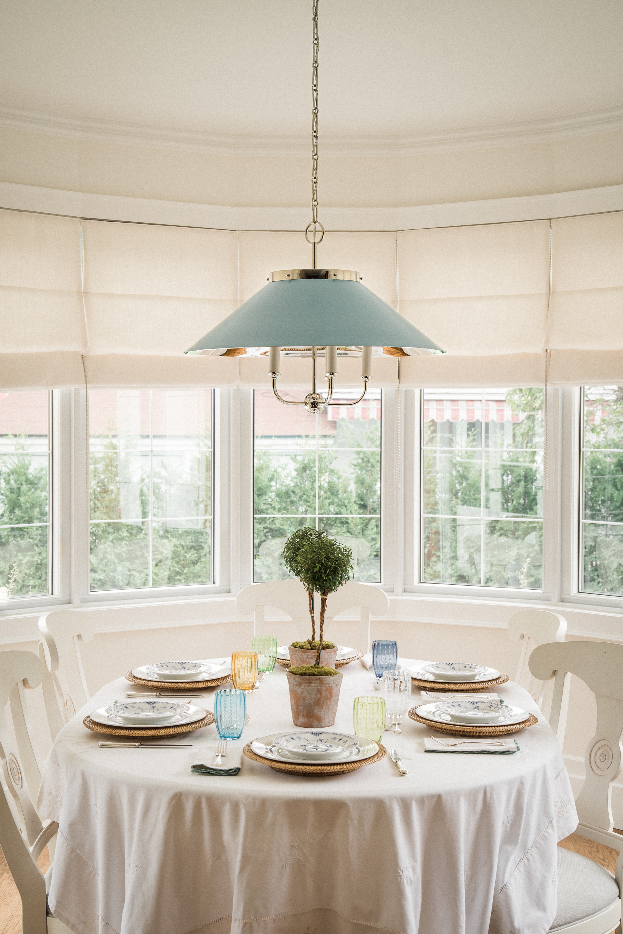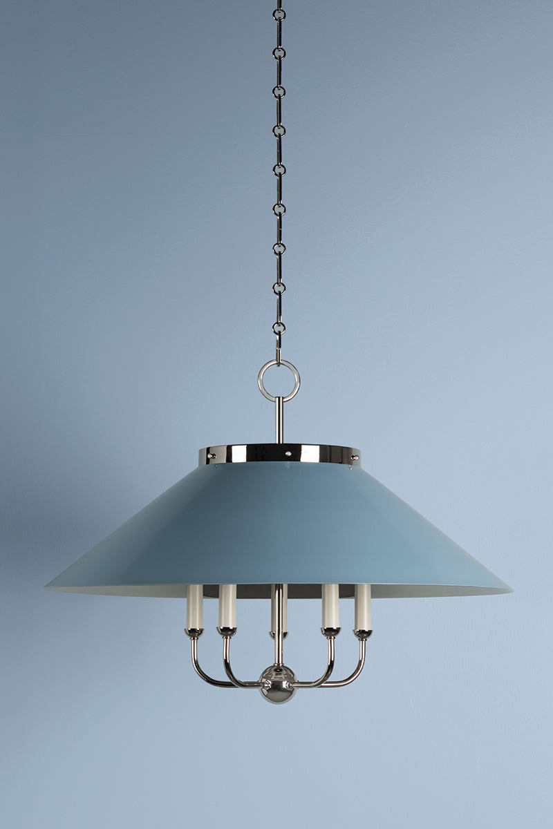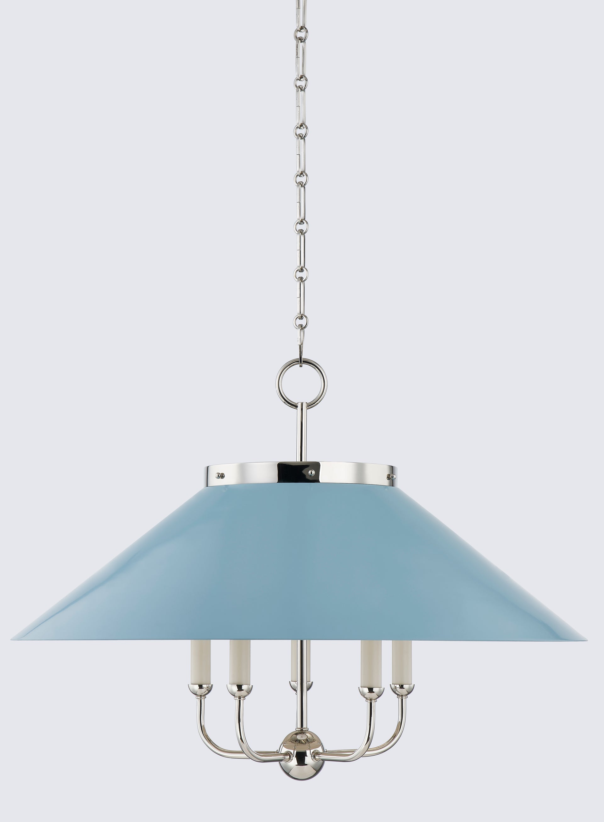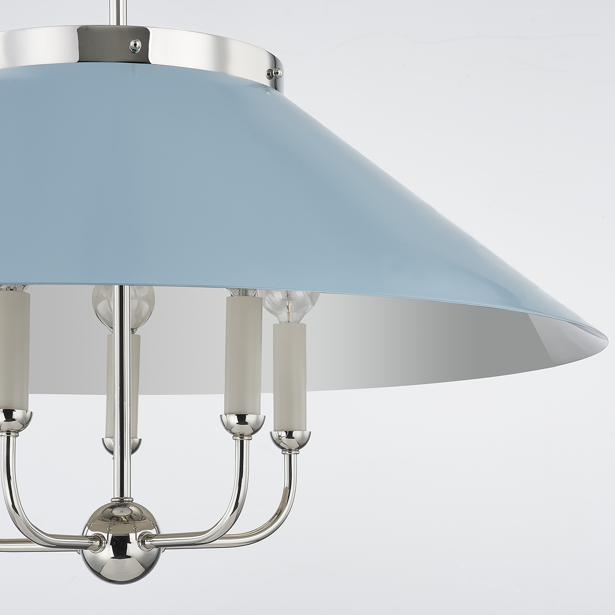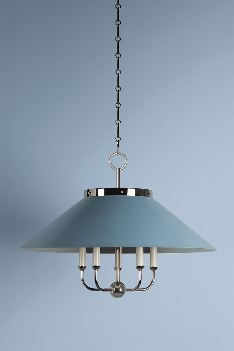 This classic metal shade design feels special with fresh finish combinations and sleek, heritage-inspired details. The contrastiing Aged Brass accents and modern gooseneck arm allow the pendants and sconce an updated, yet classic feel. The tapered shade over a five-light candelabra give the chandelier new traditional appeal. Each fixture features an Aged Brass or Polished Nickel shade that is metal on the inside and painted Off-White, Distressed Bronze or Bird Blue on the outside. Part of our Mark D. Sikes collection.