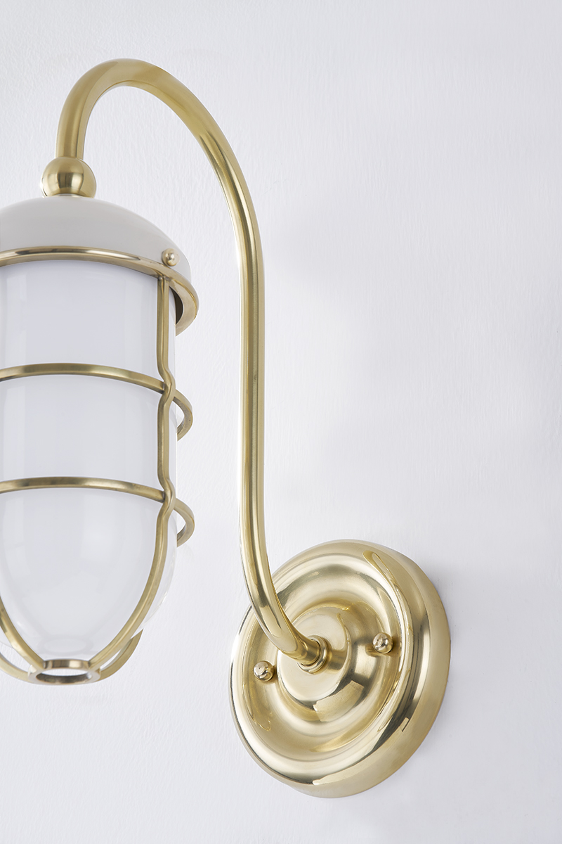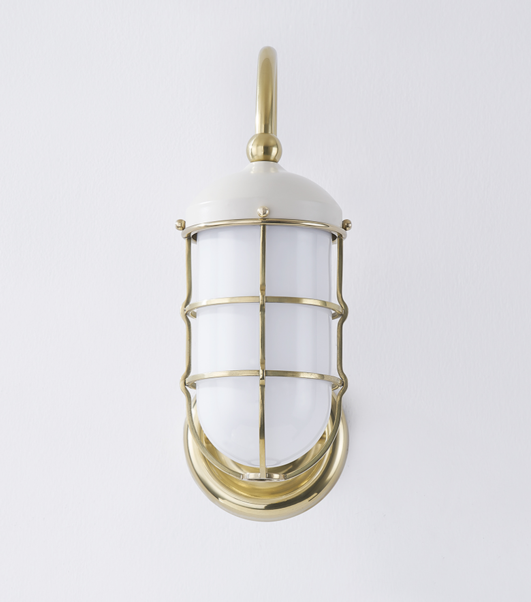 Gorgeous Aged Brass cagework and glossy opal glass give this recognizable silhouette an instant upgrade. The refined hardware and Off-White, Distressed Bronze, and Darkest Blue finish options add to Holkham's elevated nautical aesthetic. Part of our Mark D. Sikes collection.