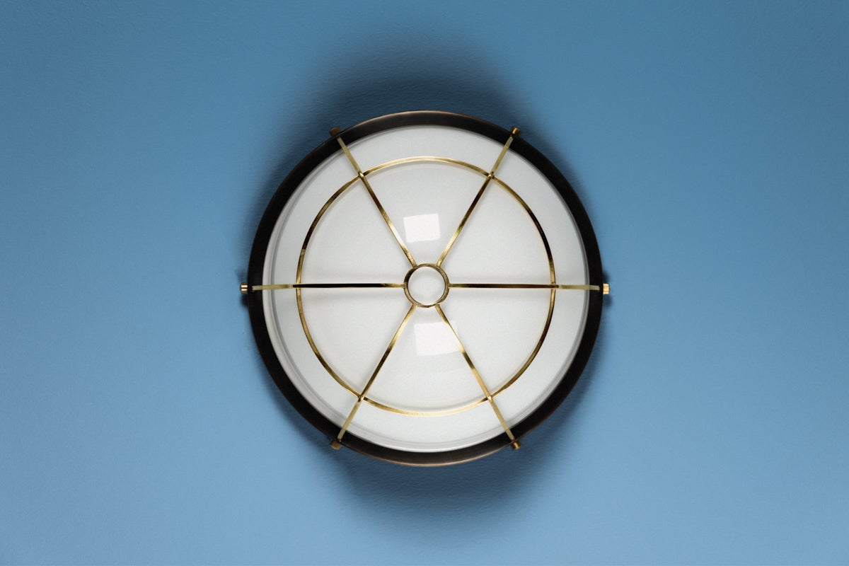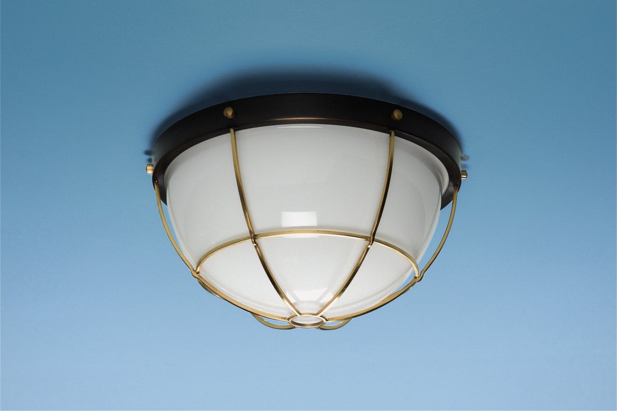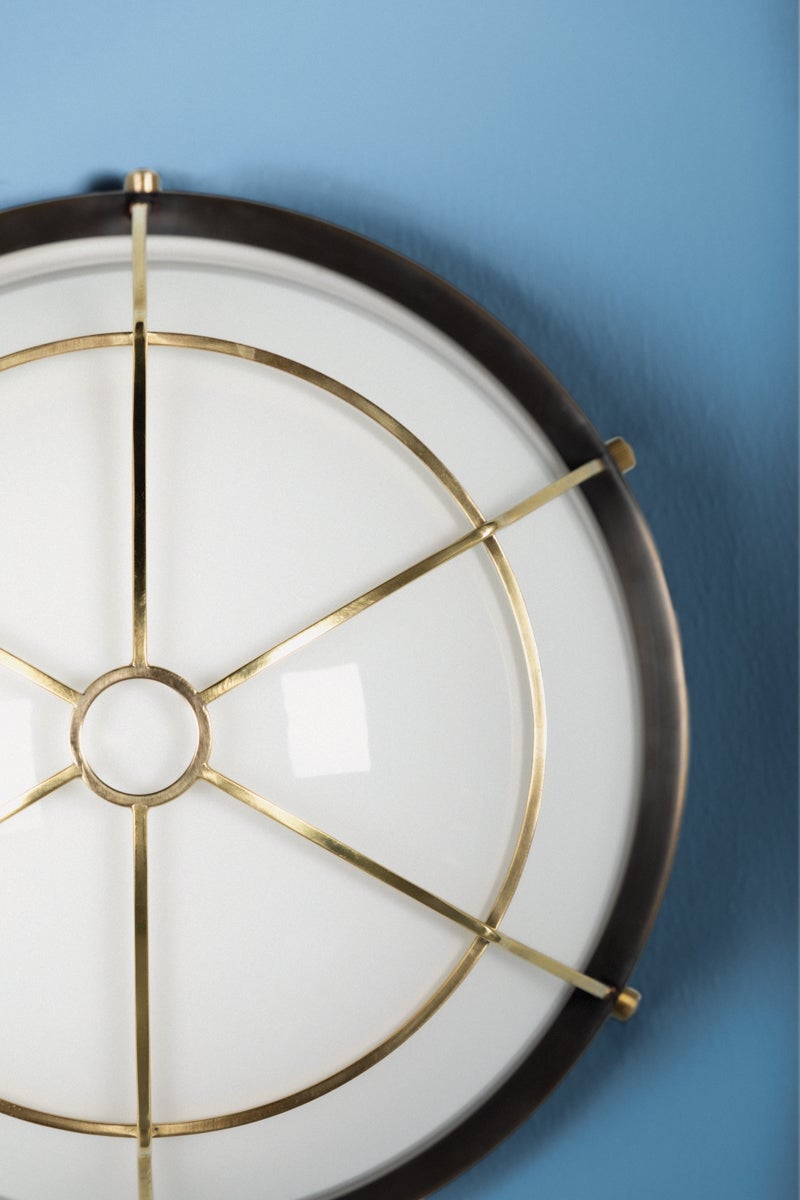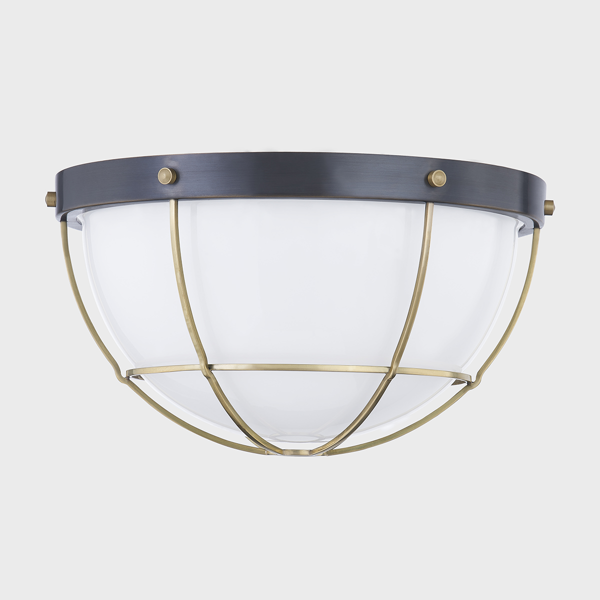 Gorgeous Aged Brass cagework and glossy opal glass give this recognizable silhouette an instant upgrade. The refined hardware and Off-White, Distressed Bronze, and Darkest Blue finish options add to Holkham's elevated nautical aesthetic. Part of our Mark D. Sikes collection.