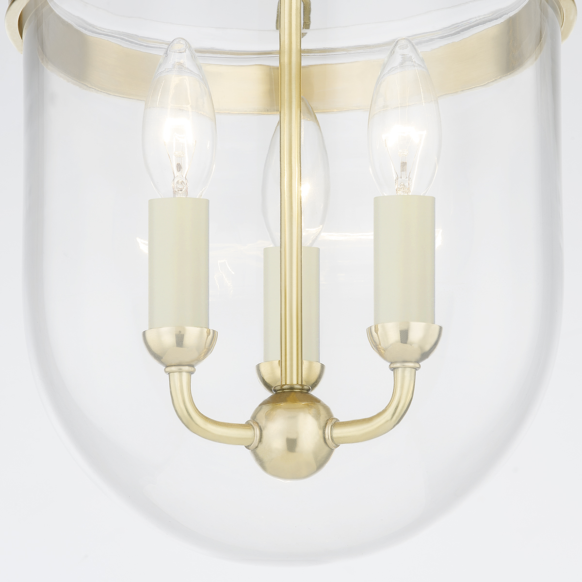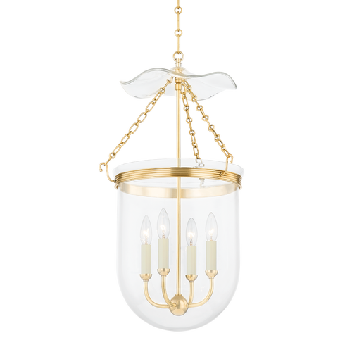 Rousham modernizes the traditional bell jar design with flowing lines and clean details such as ribbed metal banding and a stately chain, both in Aged Brass. The graceful, flowing glass that sits atop the pendant is a simple accent that draws the eye and makes the piece stand out. Part of our Mark D. Sikes collection.