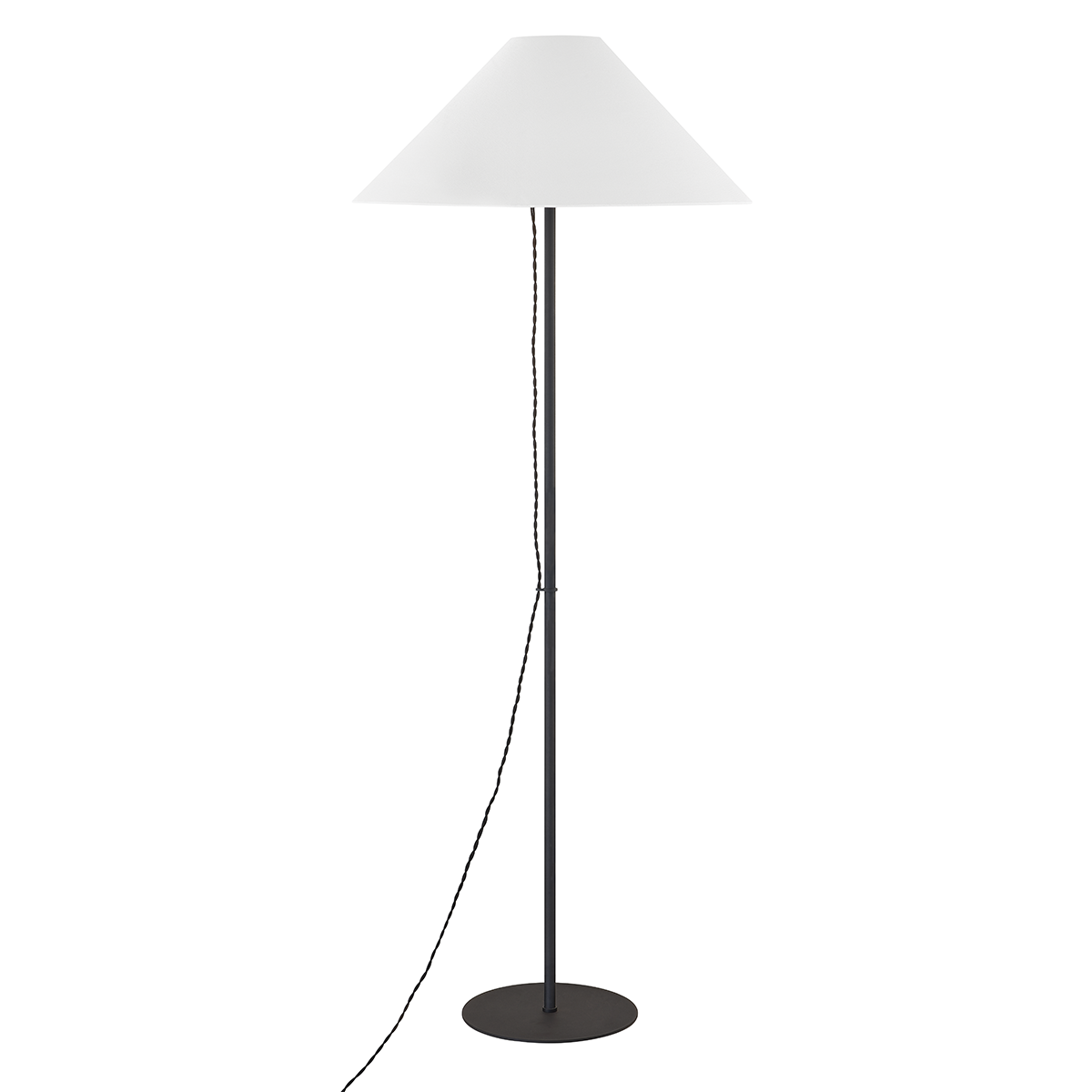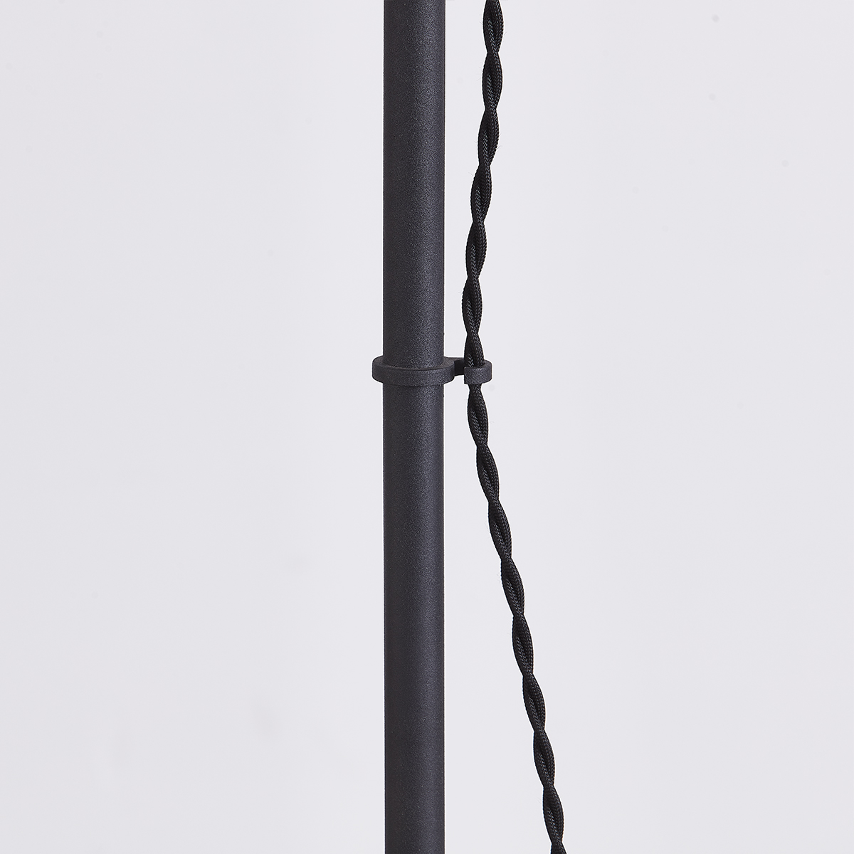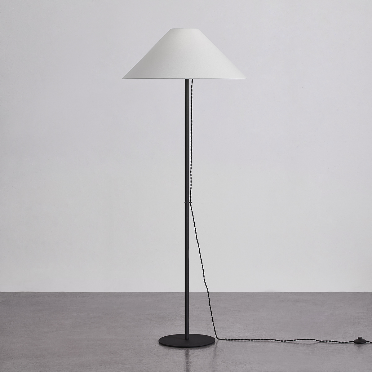 A braided cord threaded through a delicate hook elevates Pilar's familiar tapered shade and slim pole design. The Textured Black finish and off-white linen shade make this floor lamp effortlessly usable in a variety of interiors.