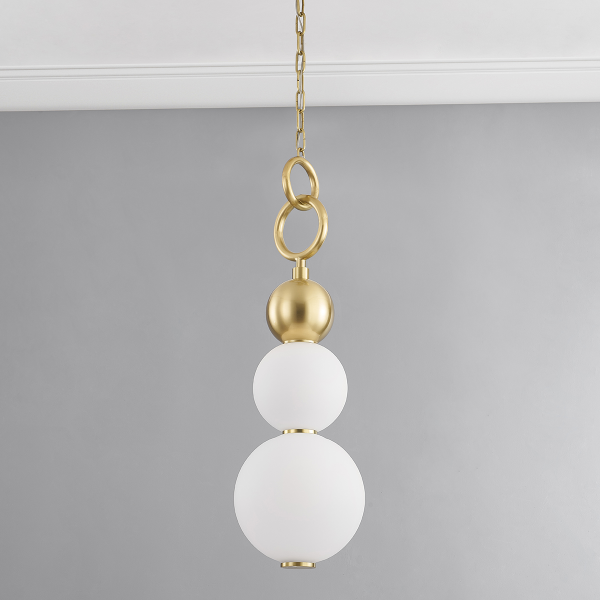 Jewelry-inspired Perrin dazzles as it dangles. Coming together in a delicate balance, an orb of Aged or Black Brass suspends from rings in a matching metallic finish while holding a pair of opal matte glass globes. This charming design adds elegance to any space.