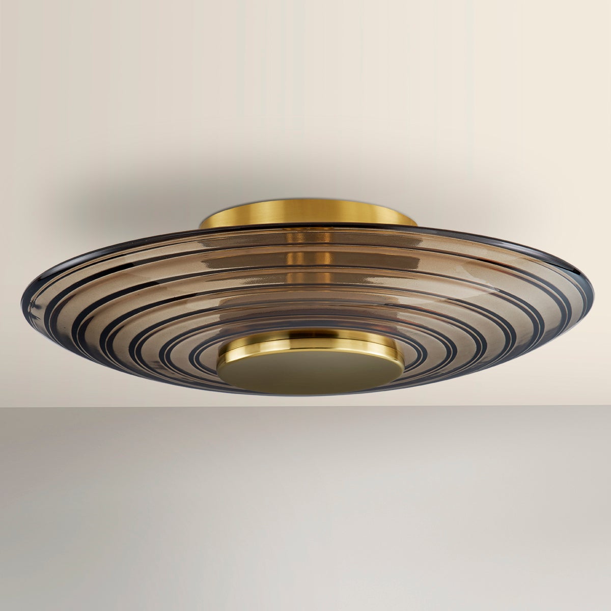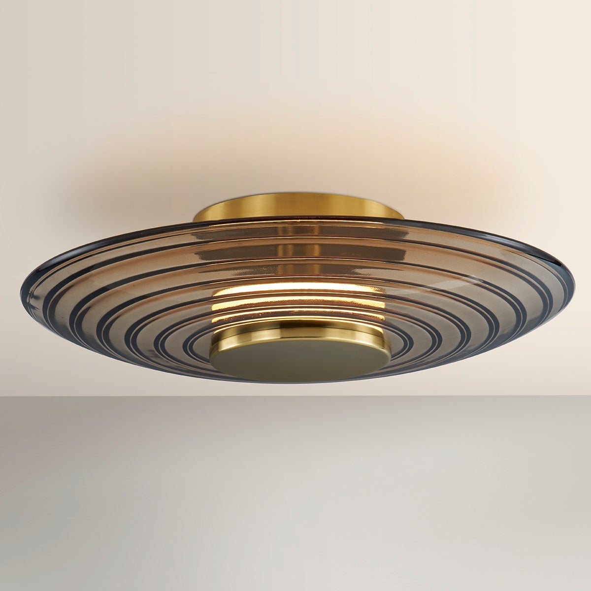 Discs of ribbed clear smoke glass capped in Aged Brass take cues from rippling waves to create the glamourous retro aesthetic of Griston. When lit, this vintage-inspired design casts a warm, golden glow, delivering just the right amount of sparkle.