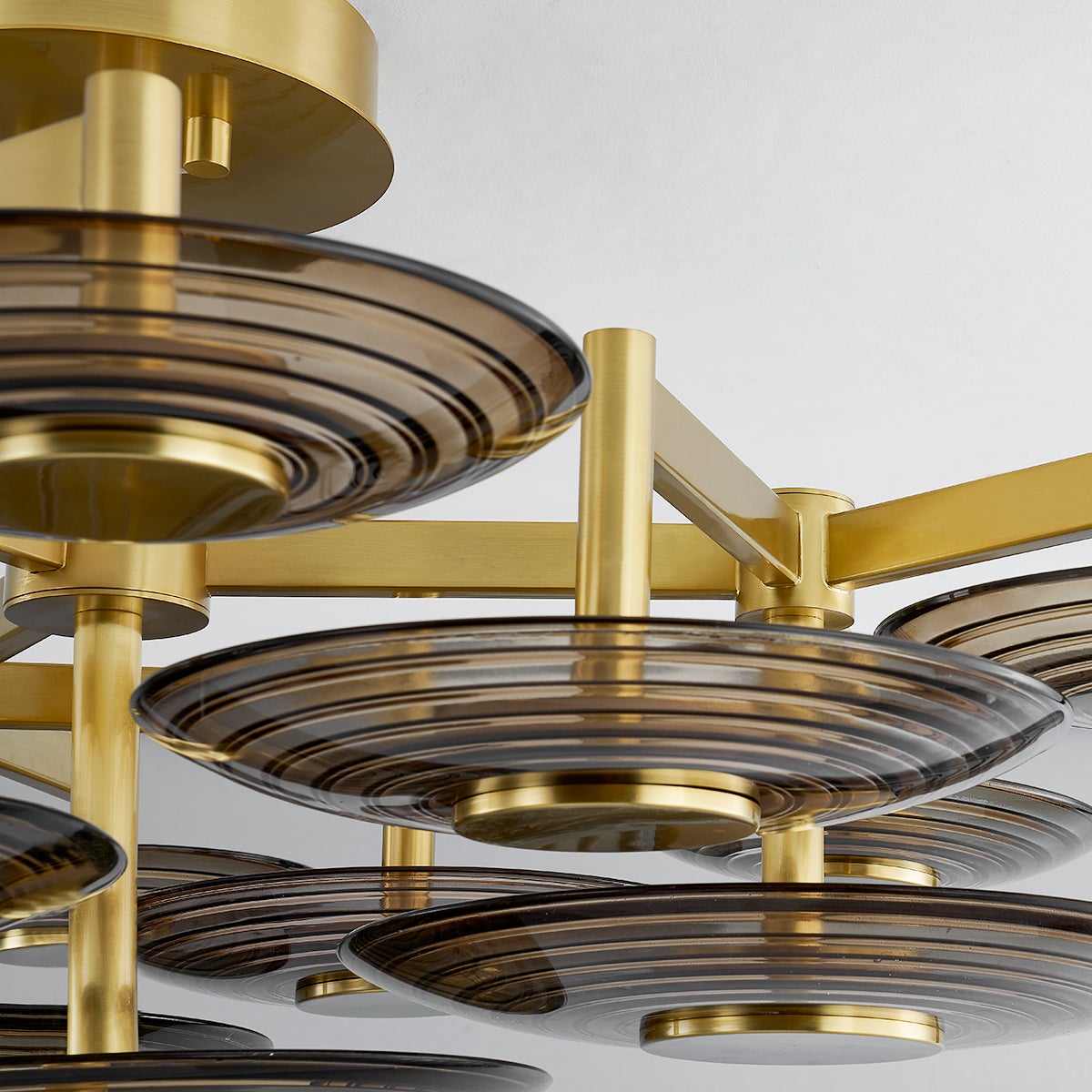 Discs of ribbed clear smoke glass capped in Aged Brass take cues from rippling waves to create the glamourous retro aesthetic of Griston. When lit, this vintage-inspired design casts a warm, golden glow, delivering just the right amount of sparkle.
