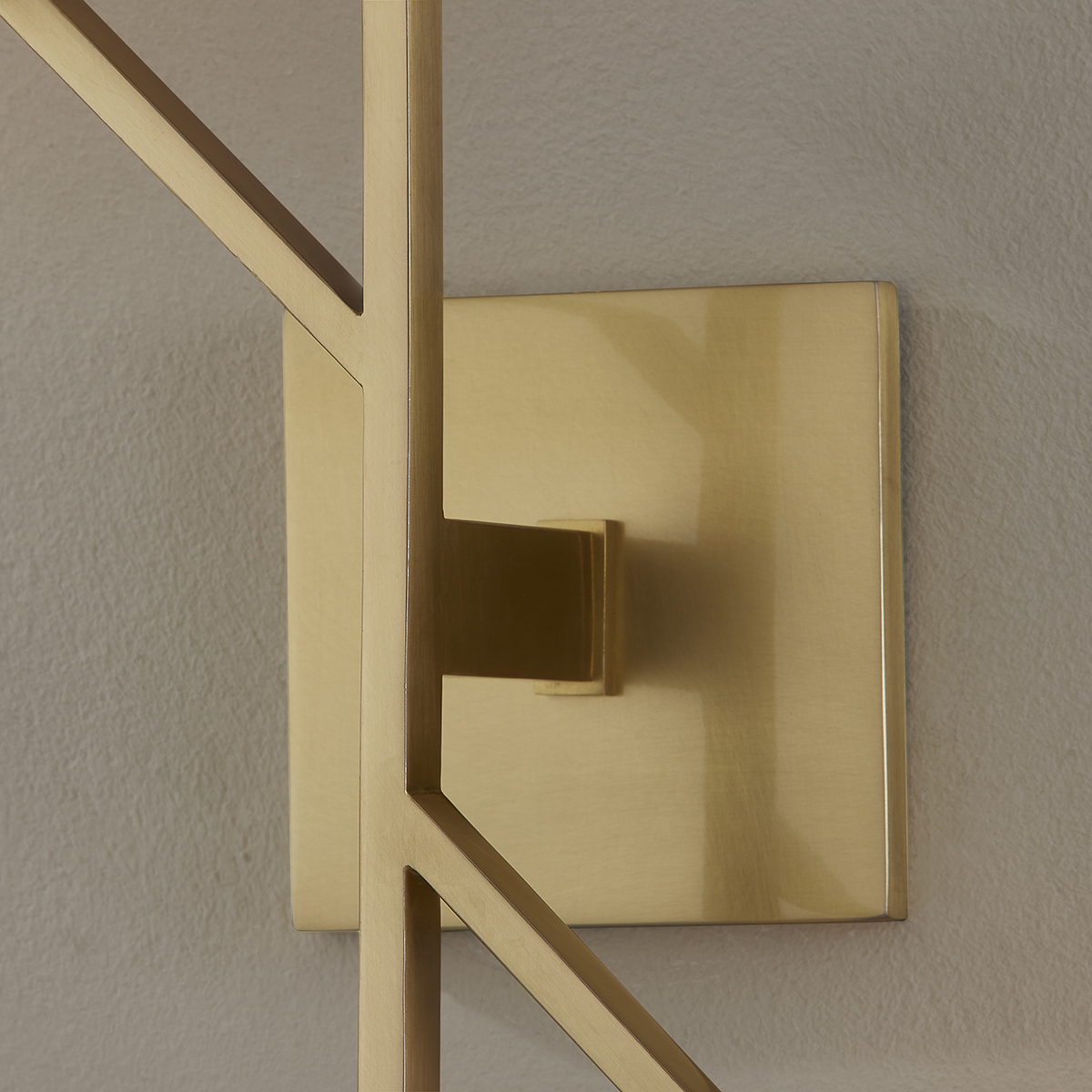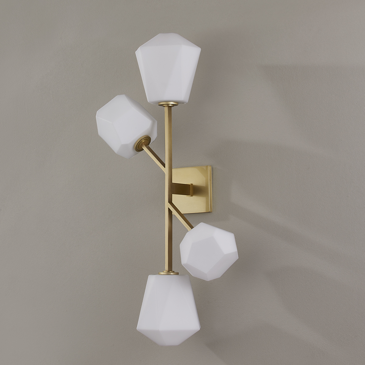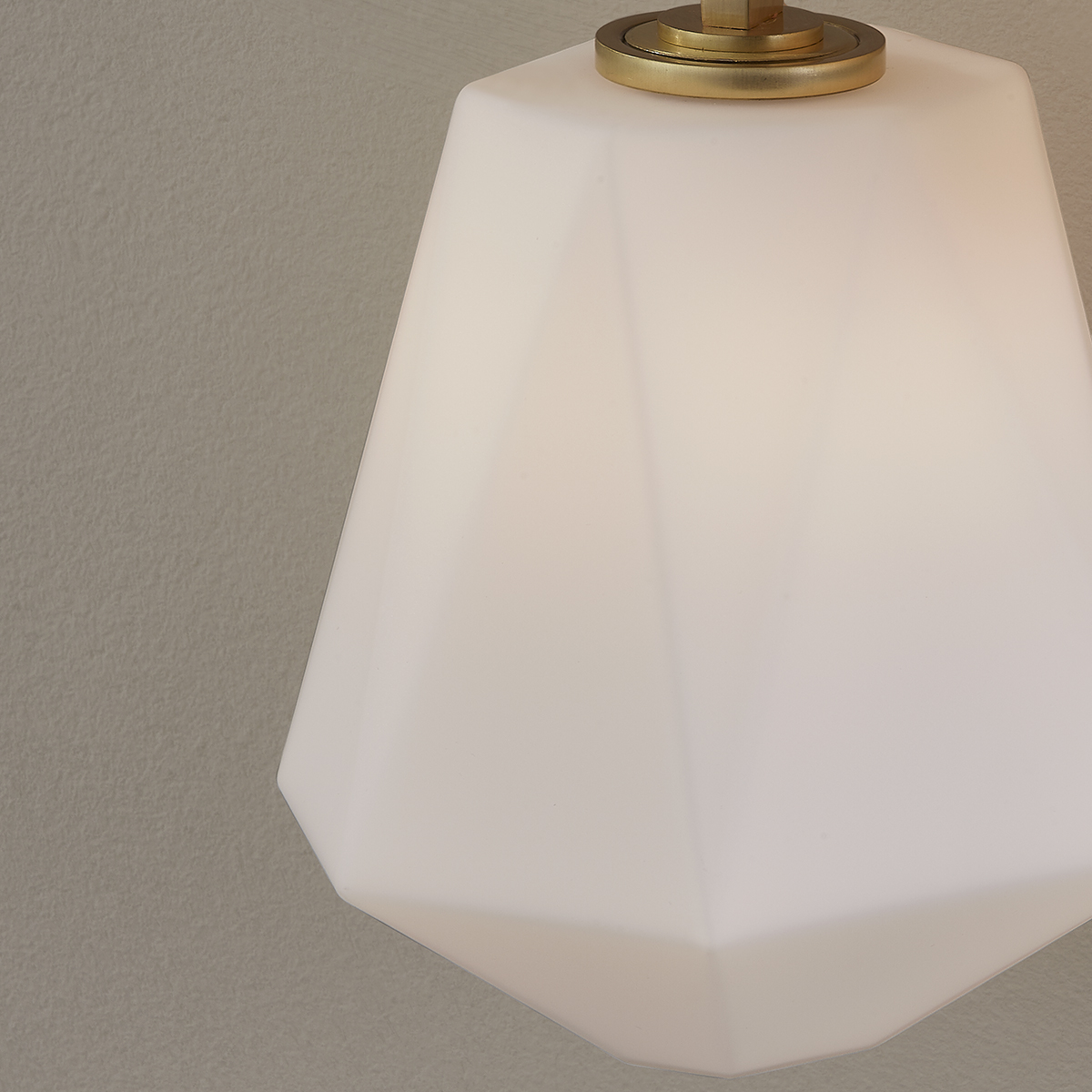 Tring's whimsical shade shape draws the eye and sparks the imagination. Gem-like, asymmetrical opal matte glass shades extend from sleek geometric metal work, creating stunning bursts of light when lit. A multifaceted work of art, Tring is available as a 4-light wall sconce, 1-light flush mount, or 13-light chandelier in Aged Brass or Polished Nickel.