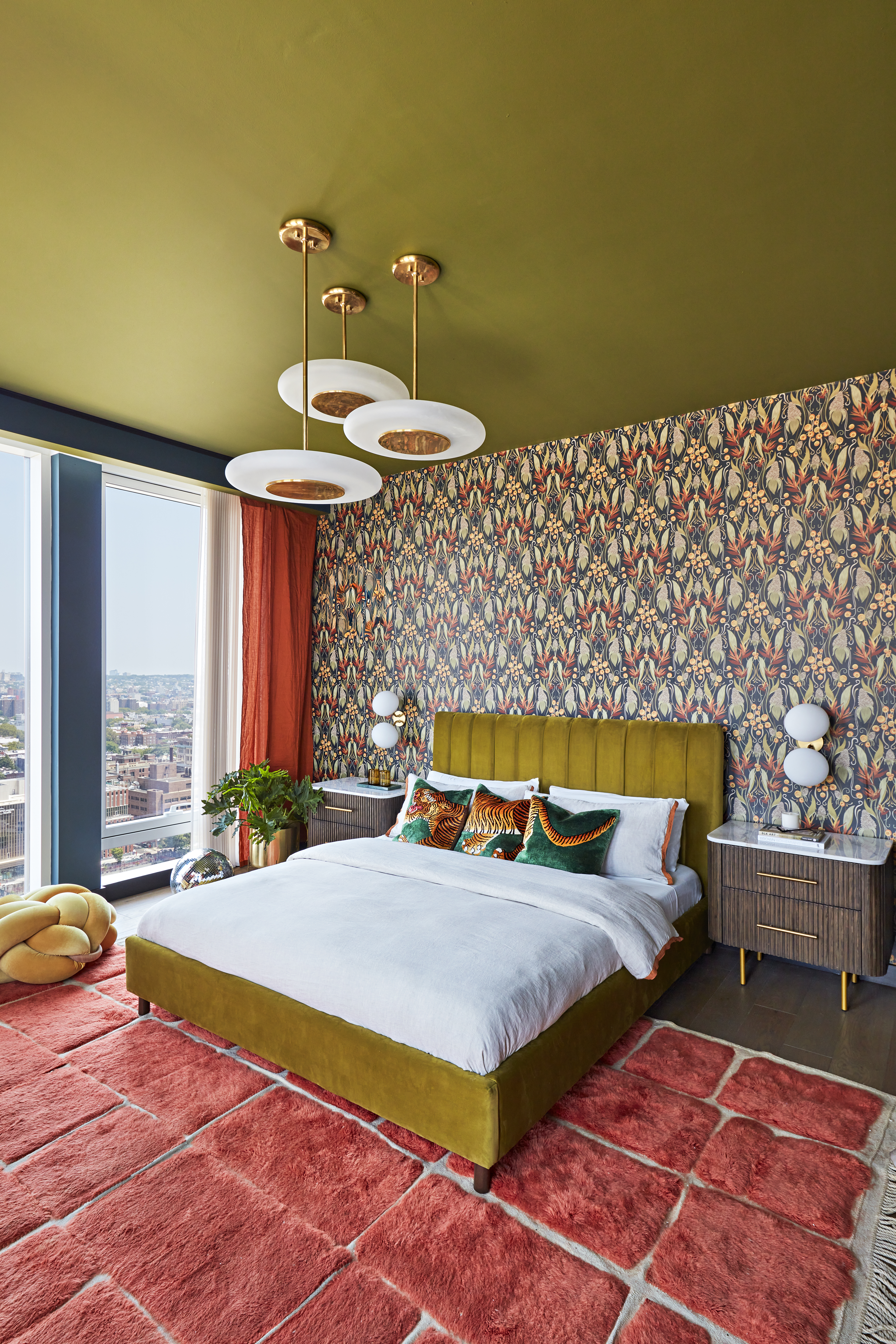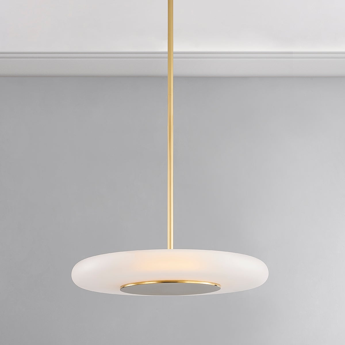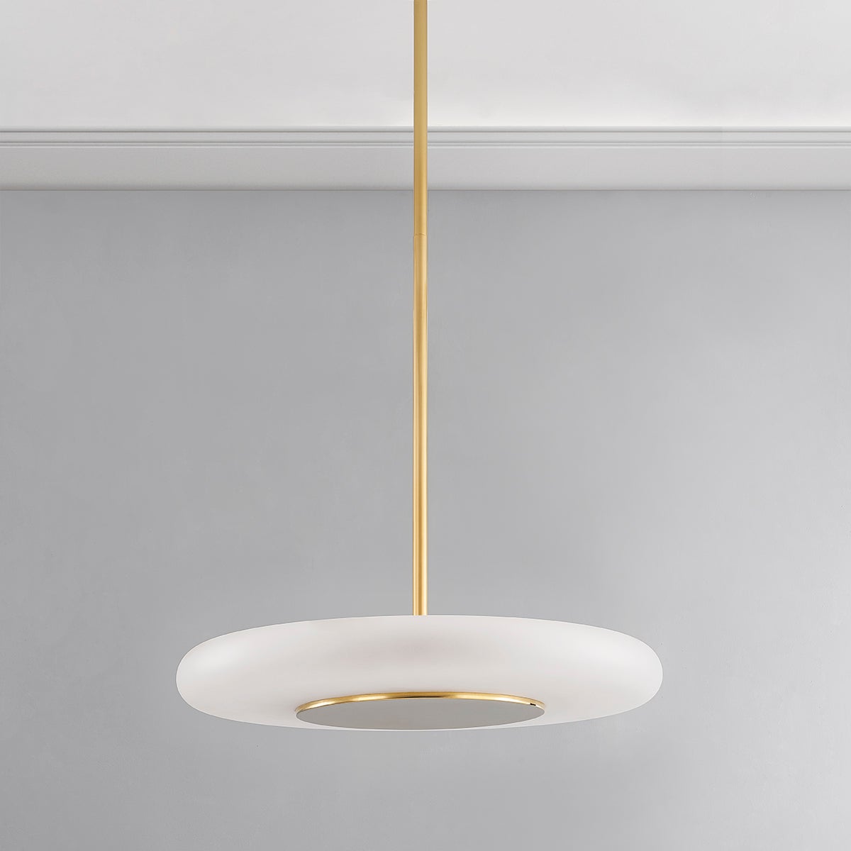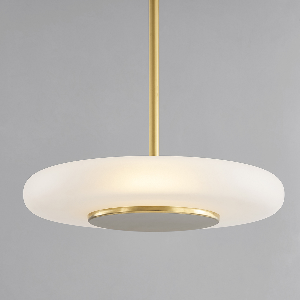 Blyford's sleek and minimal design has an orbit-like quality that draws the eye around and around. The clear etched glass is accented by streamlined Aged Brass and Black Nickel metalwork, bringing a simple sophistication to the ceiling.