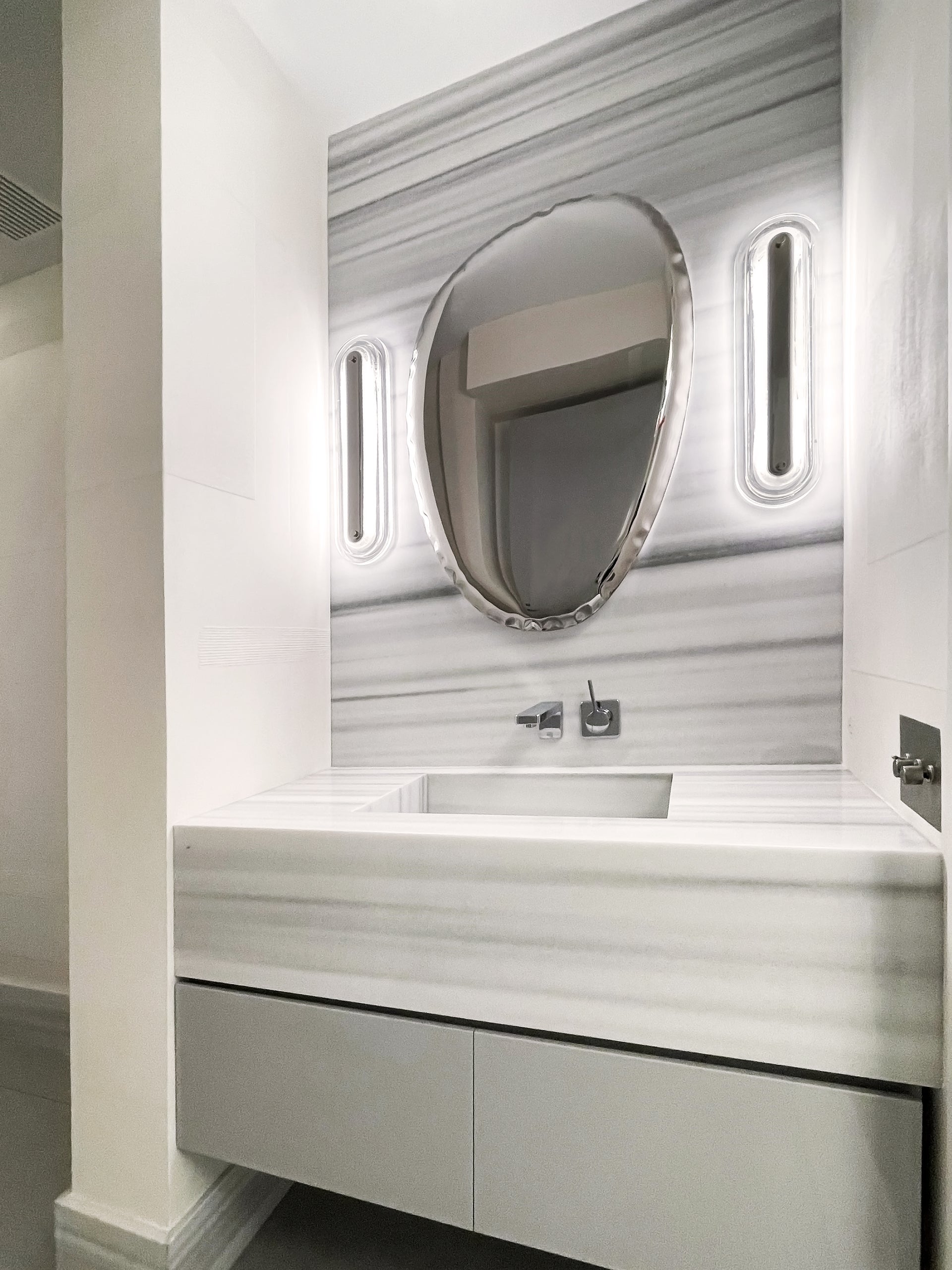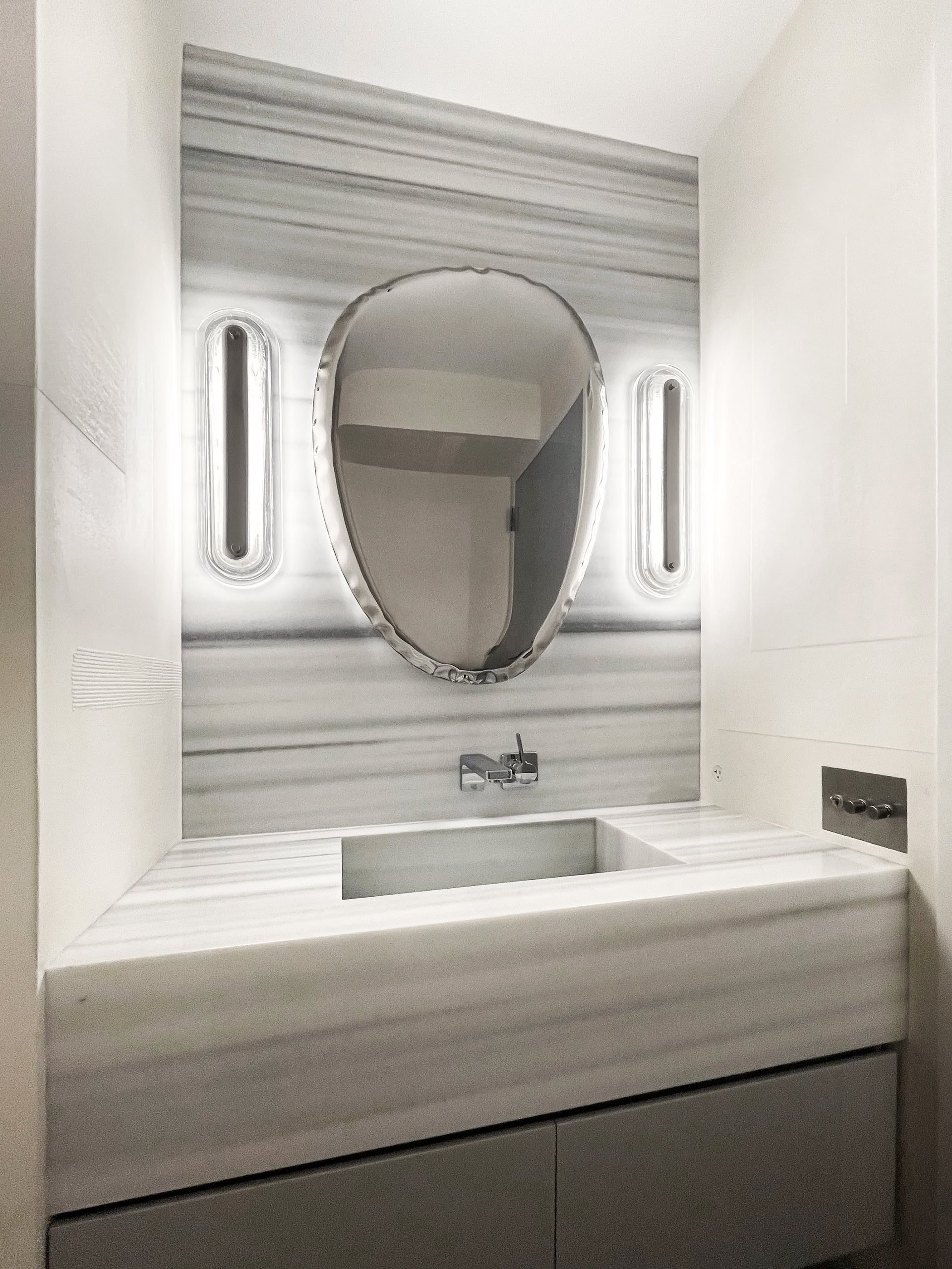 Litton layers smooth, clear cast blonchino glass, and glass with a linear metal core for a luxurious design. These stylish sconces can be mounted vertically or horizontally, adding elegance to a fireplace or a touch of glamour in the bath.