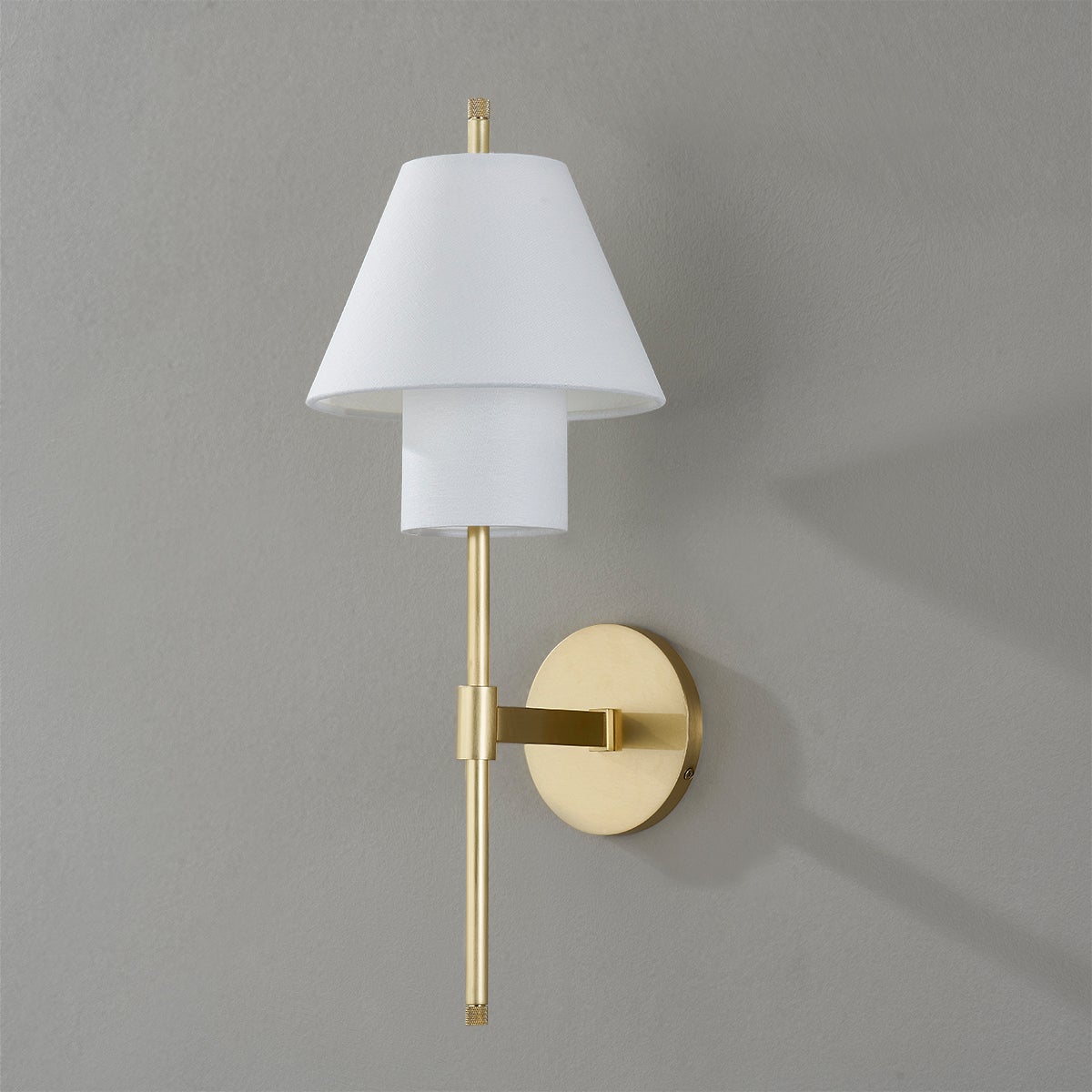 Glenmoore gives the classic shade on a stick a chic modern update. A sleek metal arm is the base for a tapered white linen shade with an elongated cylindrical shade set inside. This uniquely tailored detail extends light downward for a soft glow. Knurled accents add a touch of sophistication to this already refined design, available as a wall sconce, pendant, chandelier, and floor lamp in two elegant finishes.