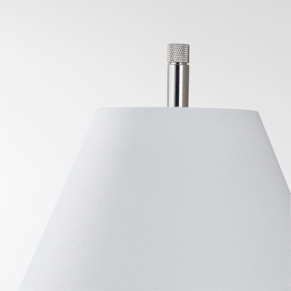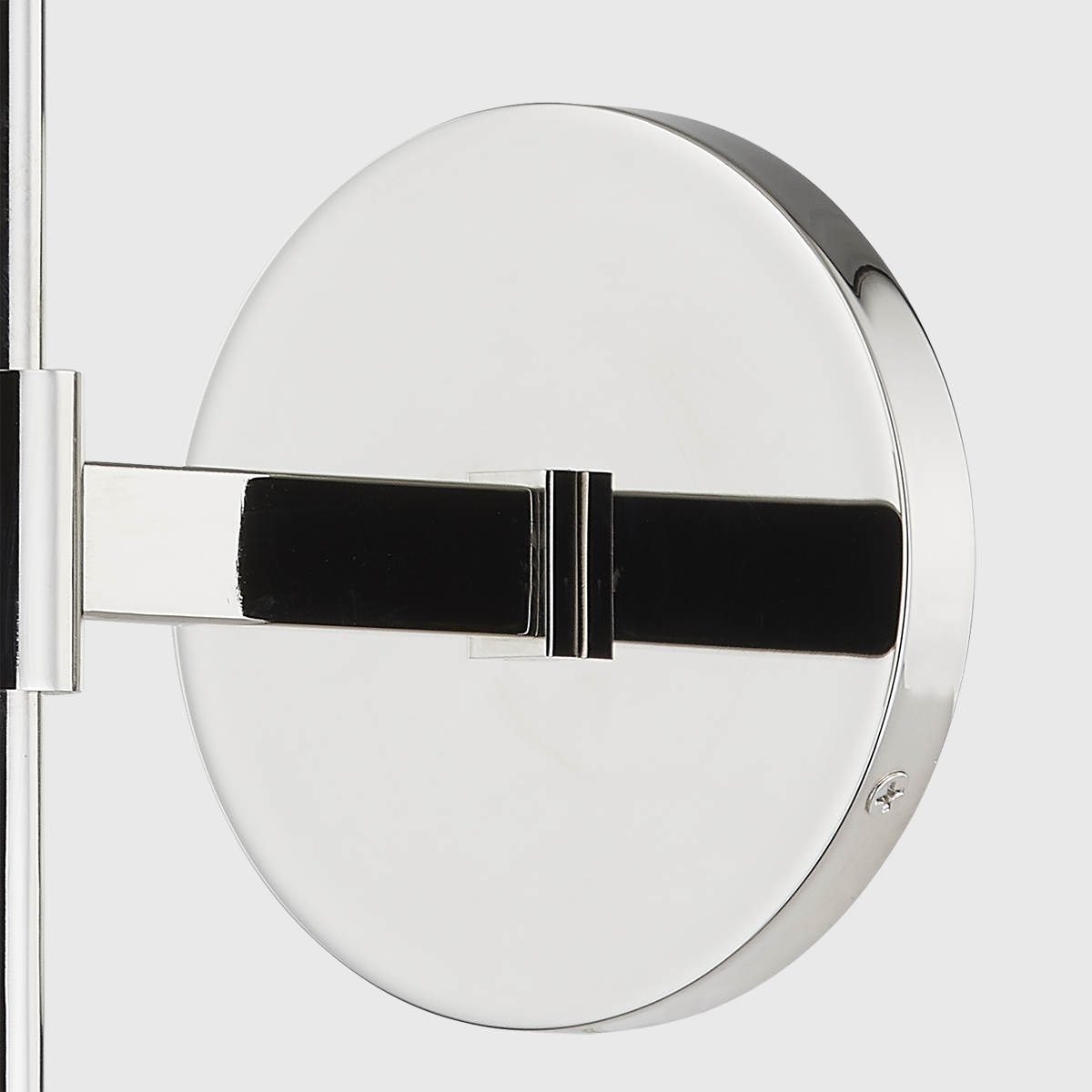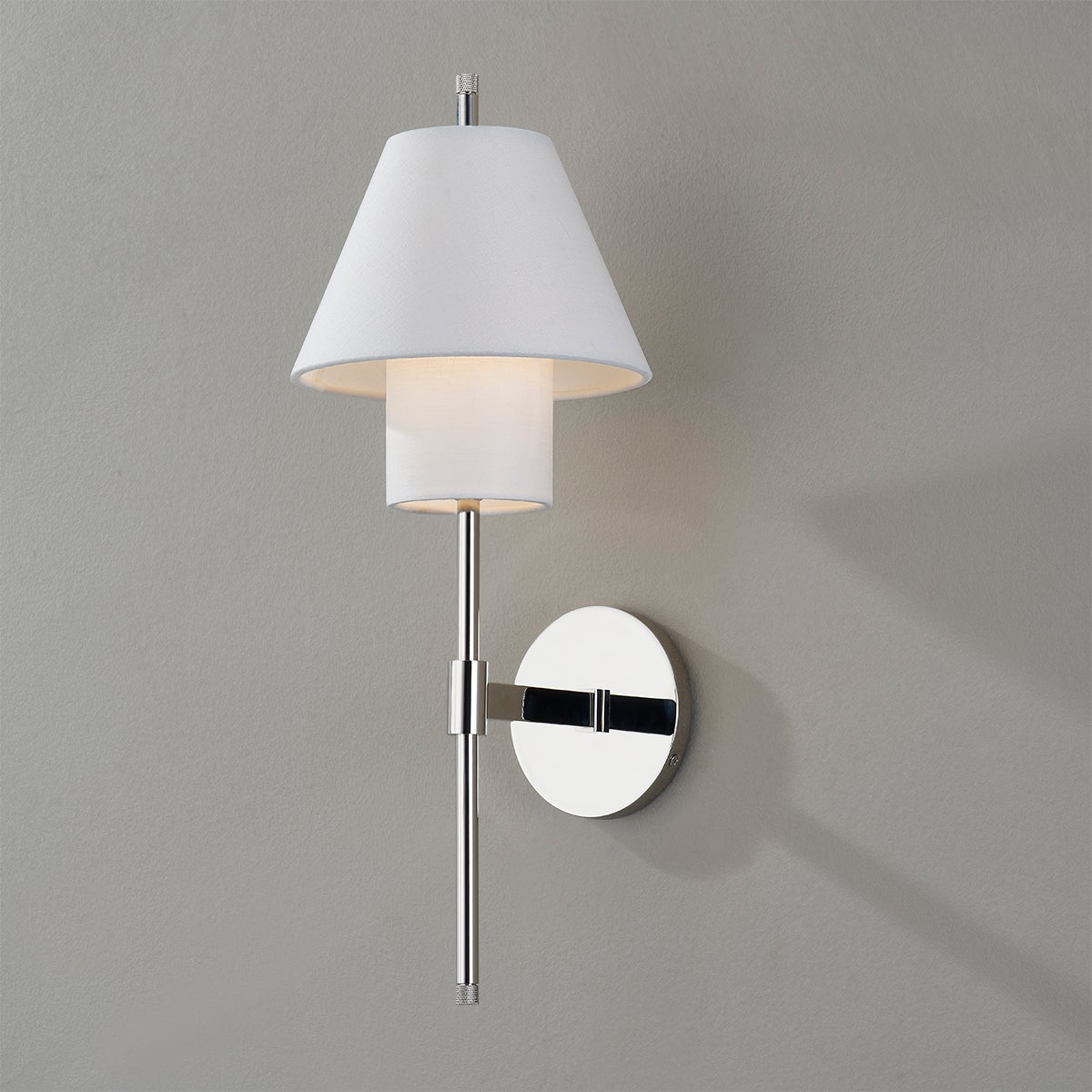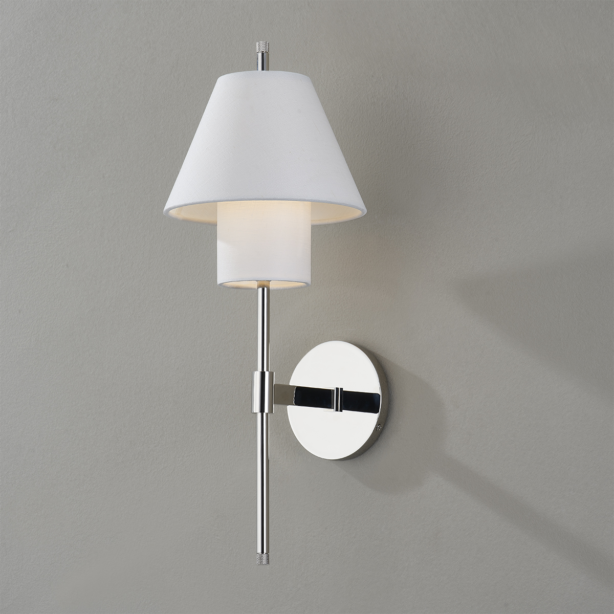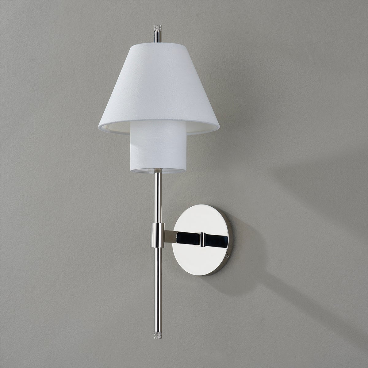 Glenmoore gives the classic shade on a stick a chic modern update. A sleek metal arm is the base for a tapered white linen shade with an elongated cylindrical shade set inside. This uniquely tailored detail extends light downward for a soft glow. Knurled accents add a touch of sophistication to this already refined design, available as a wall sconce, pendant, chandelier, and floor lamp in two elegant finishes.
