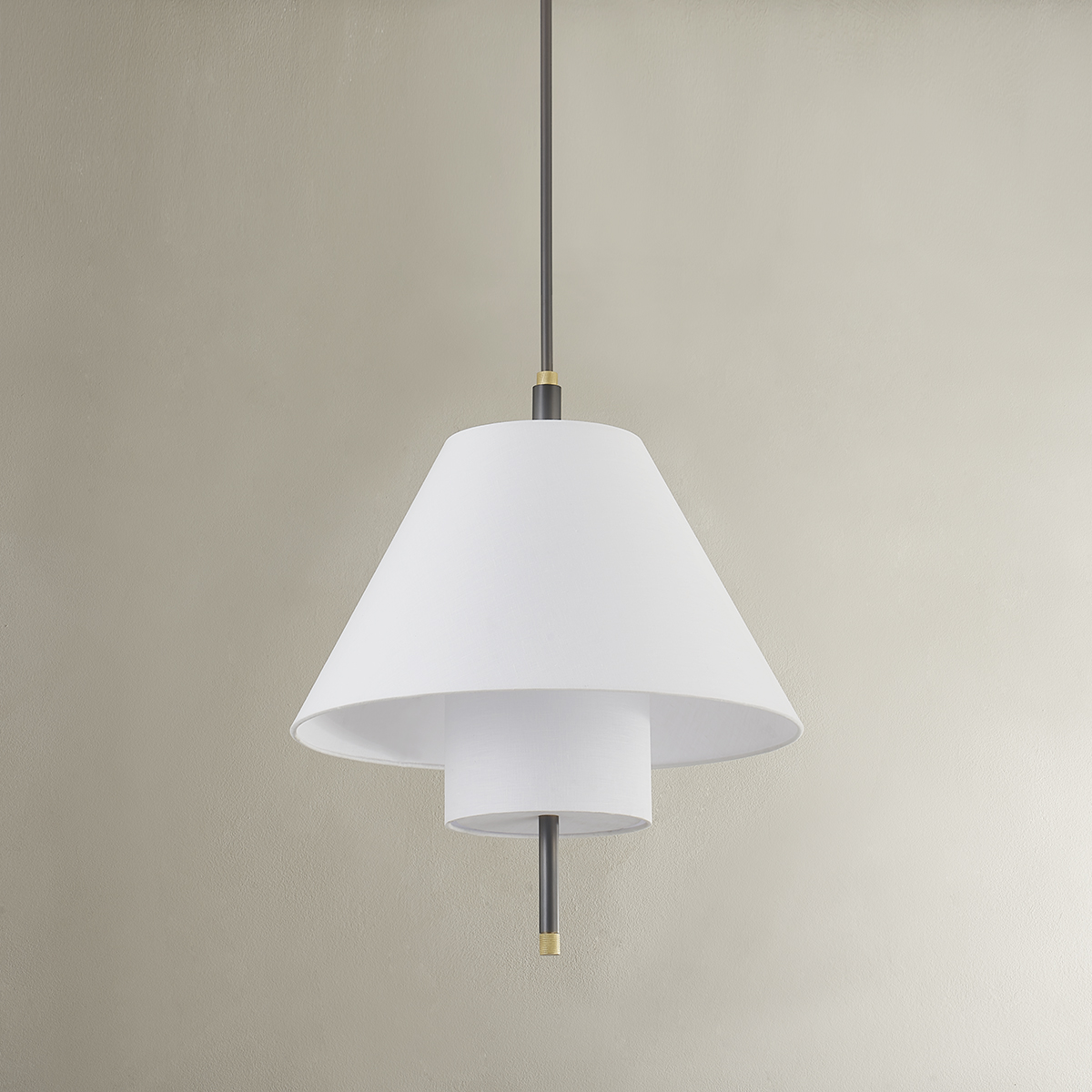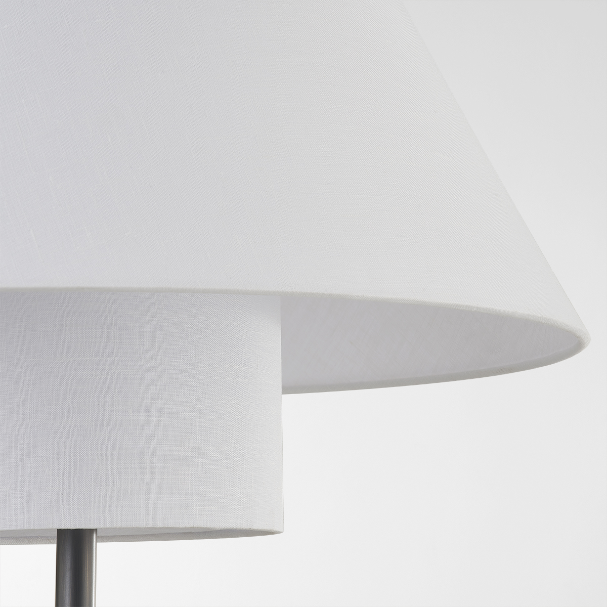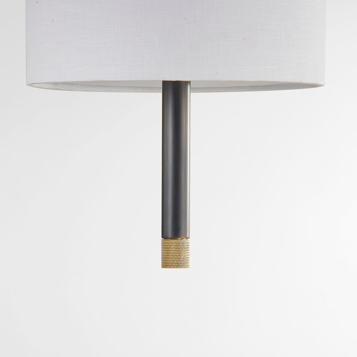 Glenmoore gives the classic shade on a stick a chic modern update. A sleek metal arm is the base for a tapered white linen shade with an elongated cylindrical shade set inside. This uniquely tailored detail extends light downward for a soft glow. Knurled accents add a touch of sophistication to this already refined design, available as a wall sconce, pendant, chandelier, and floor lamp in two elegant finishes.