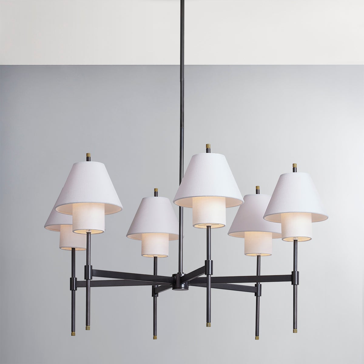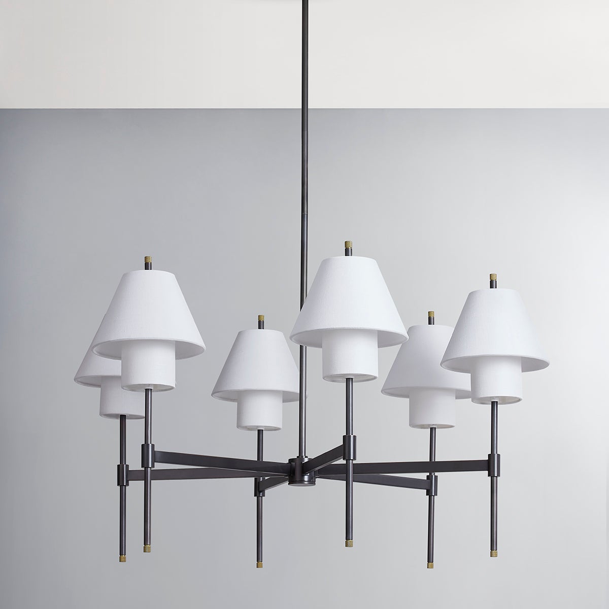 Glenmoore gives the classic shade on a stick a chic modern update. A sleek metal arm is the base for a tapered white linen shade with an elongated cylindrical shade set inside. This uniquely tailored detail extends light downward for a soft glow. Knurled accents add a touch of sophistication to this already refined design, available as a wall sconce, pendant, chandelier, and floor lamp in two elegant finishes.
