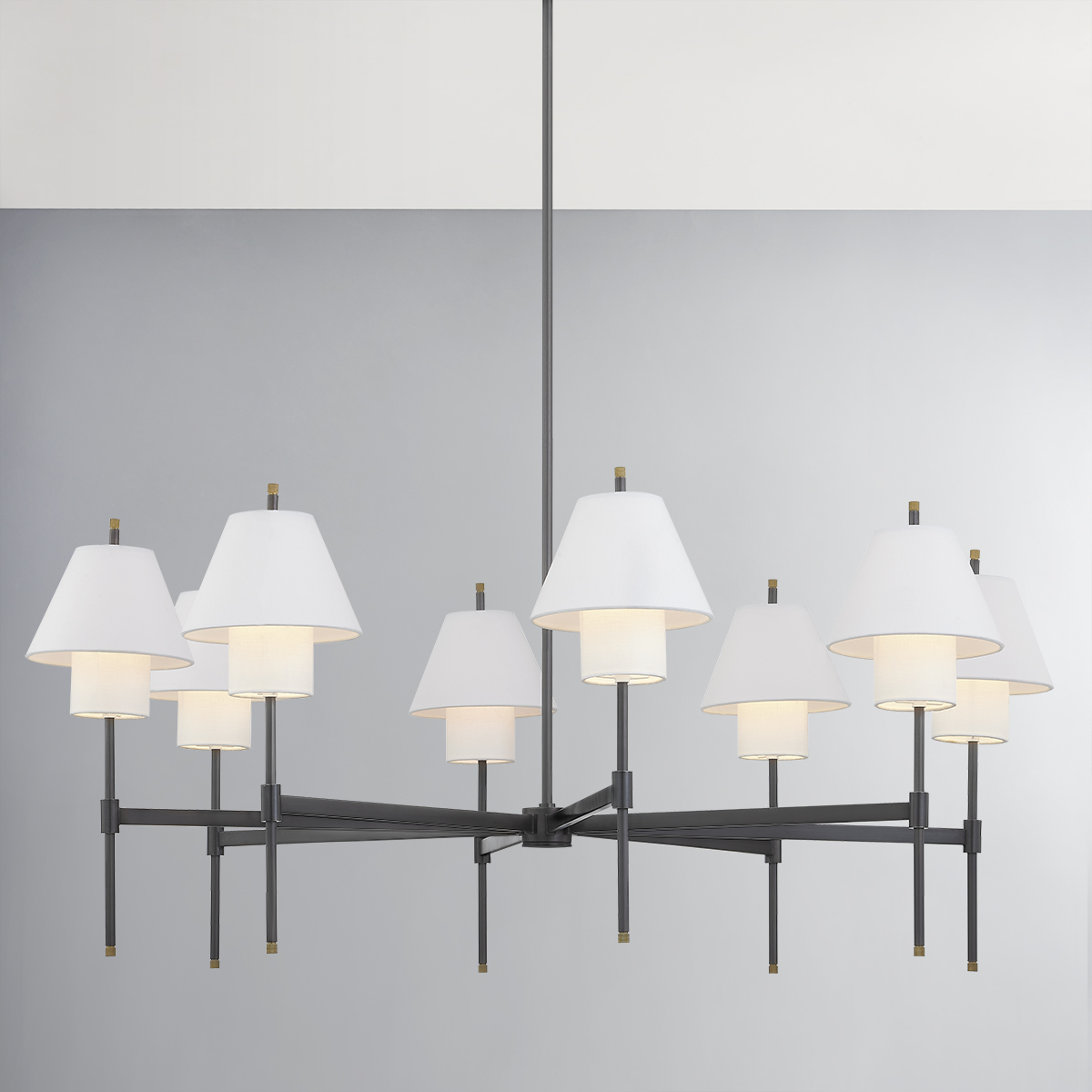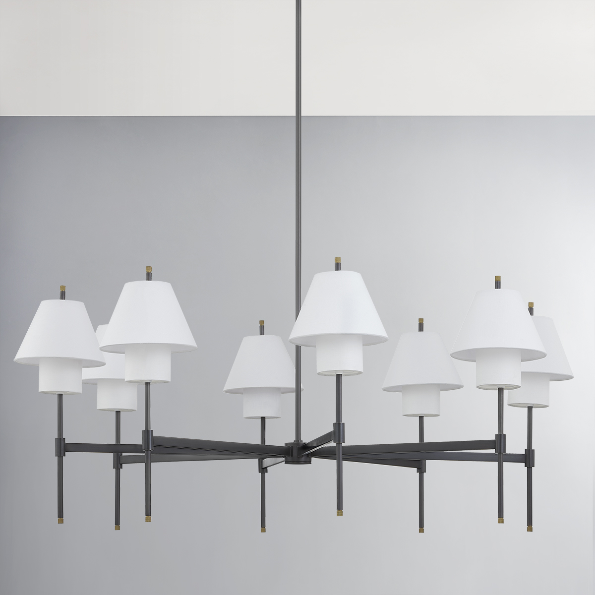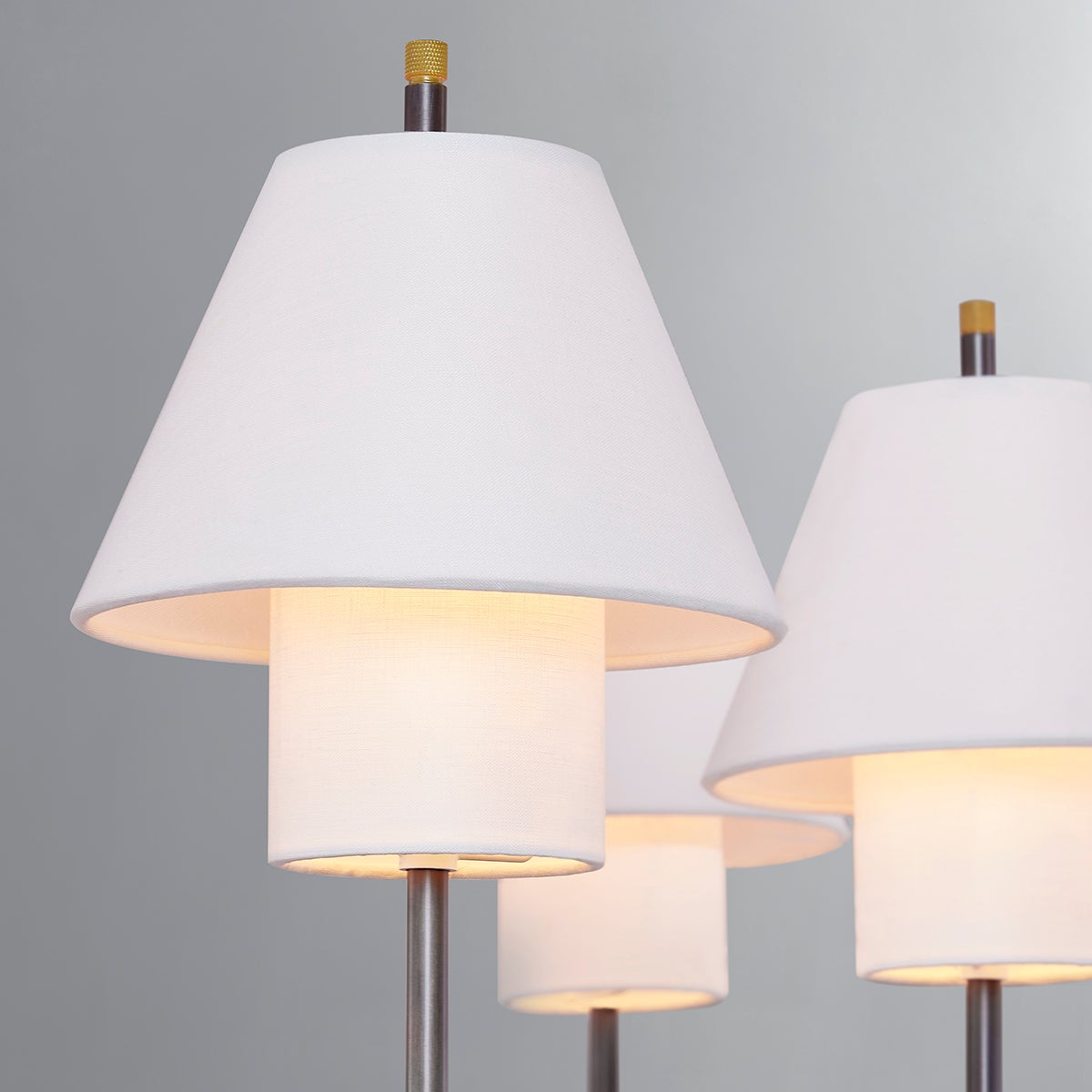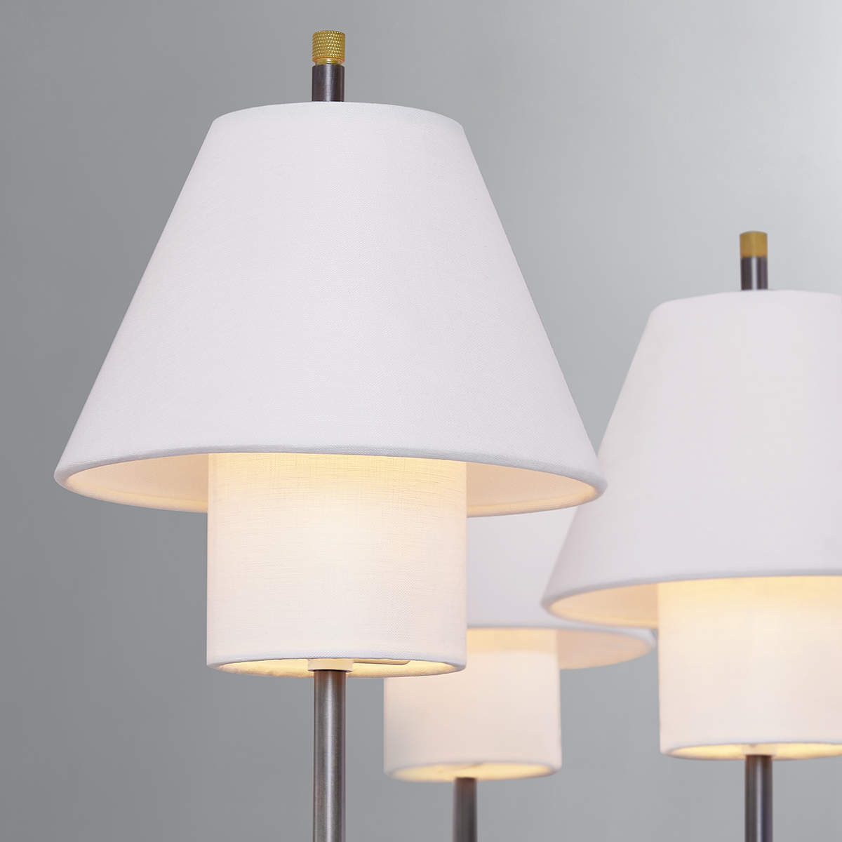 Glenmoore gives the classic shade on a stick a chic modern update. A sleek metal arm is the base for a tapered white linen shade with an elongated cylindrical shade set inside. This uniquely tailored detail extends light downward for a soft glow. Knurled accents add a touch of sophistication to this already refined design, available as a wall sconce, pendant, chandelier, and floor lamp in two elegant finishes.