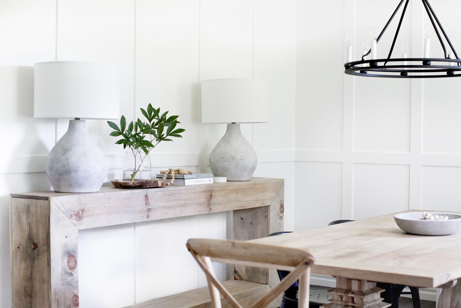 The stone-like finishes and forms of the Zen family bring a serene, natural touch to living spaces. These two lamps complement each other perfectly, easily finding harmony the same room. Each lamp is topped with a natural linen drum shade, providing a mindful accompaniment to their dynamic, dimensional finishes.