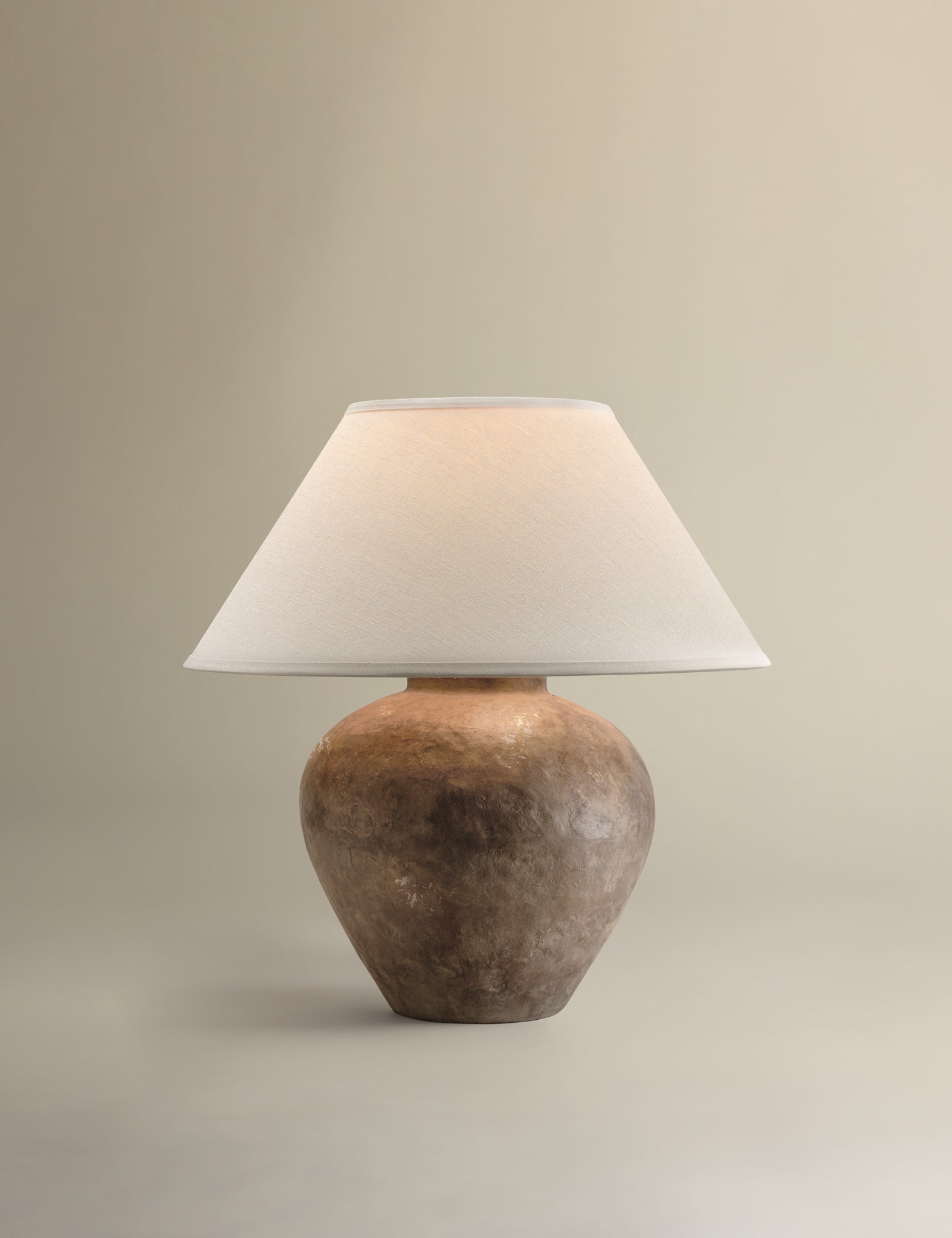Inspired by the sun-soaked beaches of southern Italy, the Calabria family of table lamps features earthy, textural finishes and curvy silhouettes. The large conical linen shades complement the rustic appearance of these treasures. Layered together, they bring an organic beauty into any space.