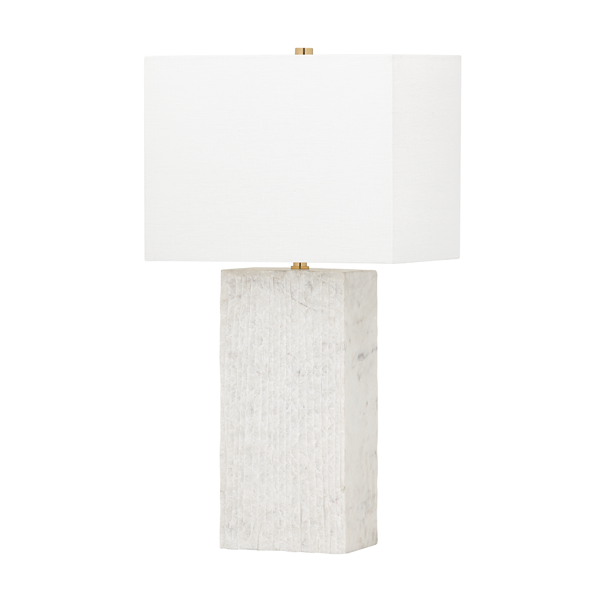 Inspired by split face stone, Seismic features a base of solid Bansra Marble with the irregular lines and texture of rough-cut rock. The square white linen shade pairs perfectly with the rectangular shape of the base. The slim profile and neutral all-white hues make this substantial table lamp fresh and usable.