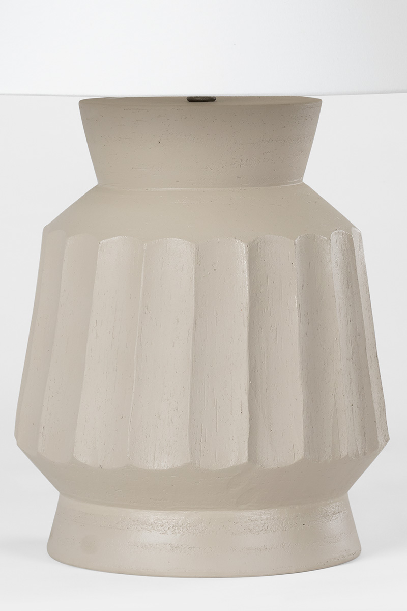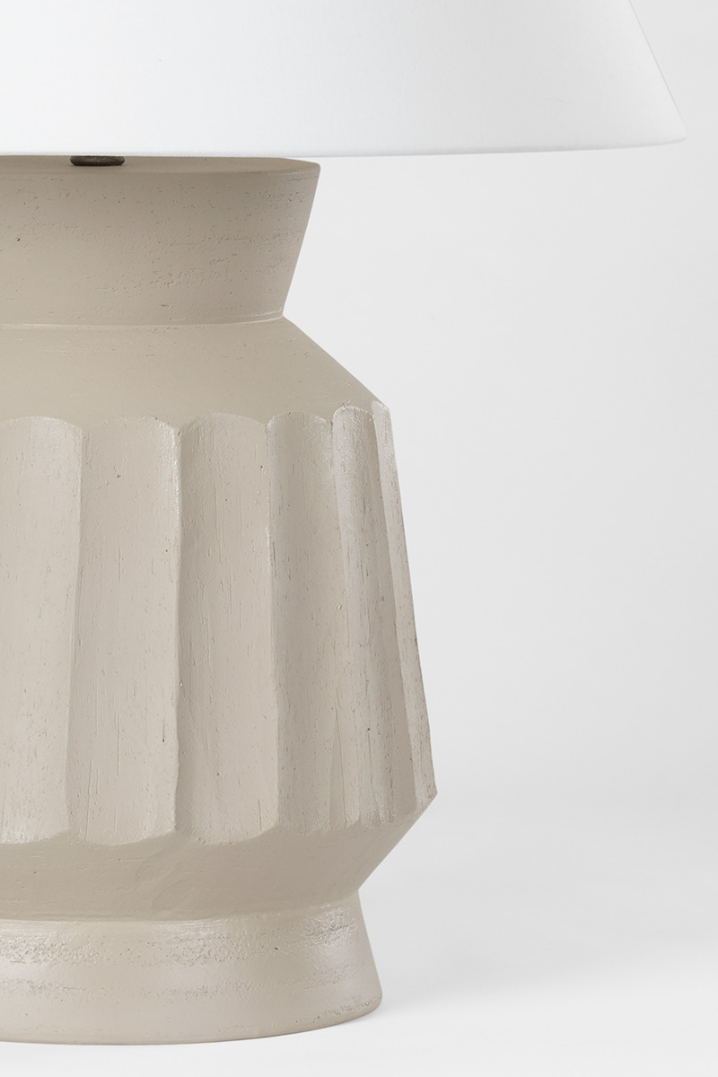 Selma features a fluted, scalloped base in a Ceramic Unglazed Grey for a look that feels both artisanal and architectural. The unglazed finish and tapered off-white linen shade add to the natural, earthy quality. With its clean lines and organic aesthetic, this lamp adds a chic mid-century style to any table.