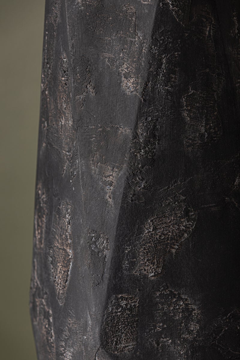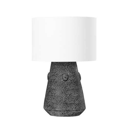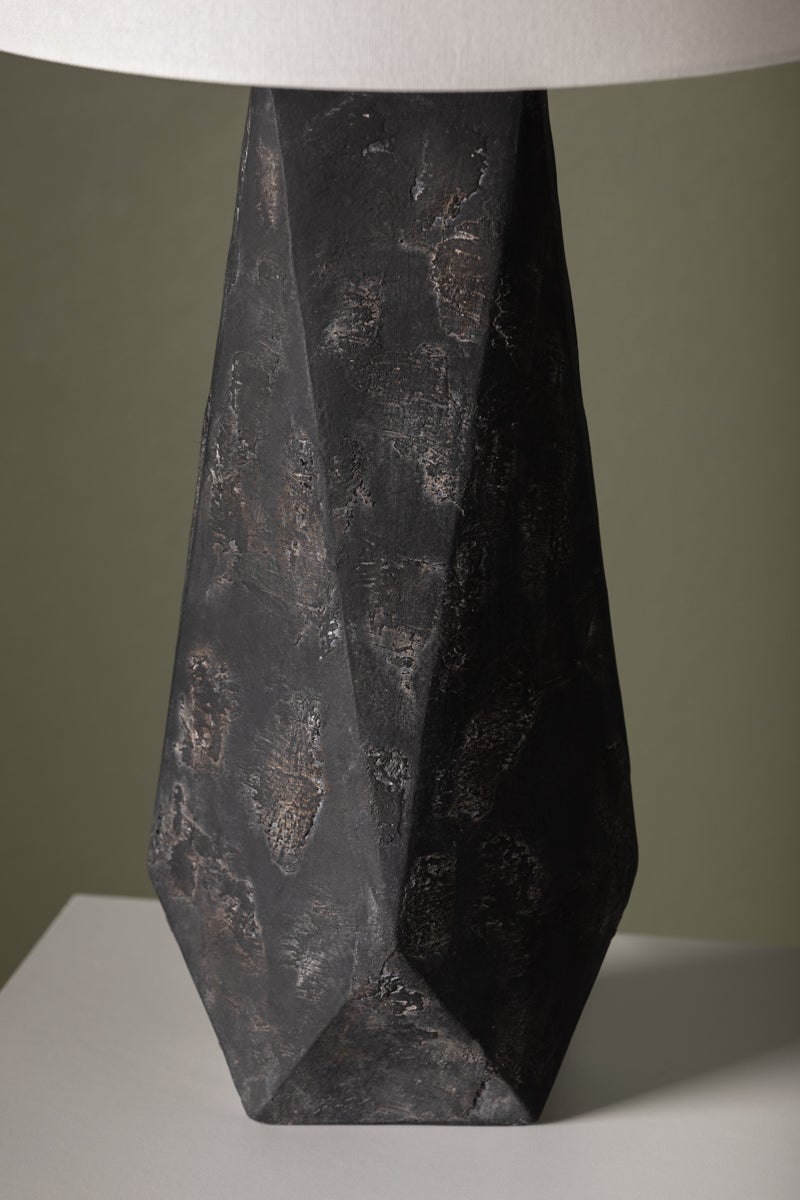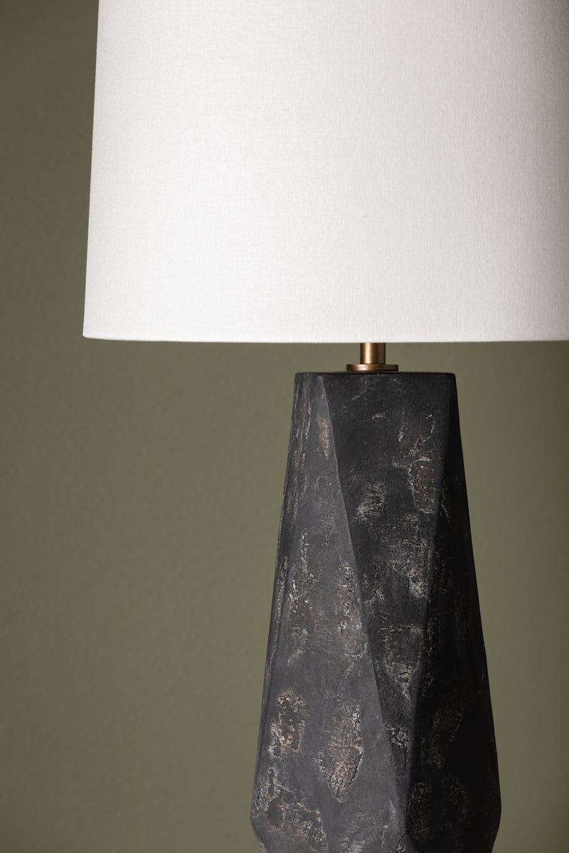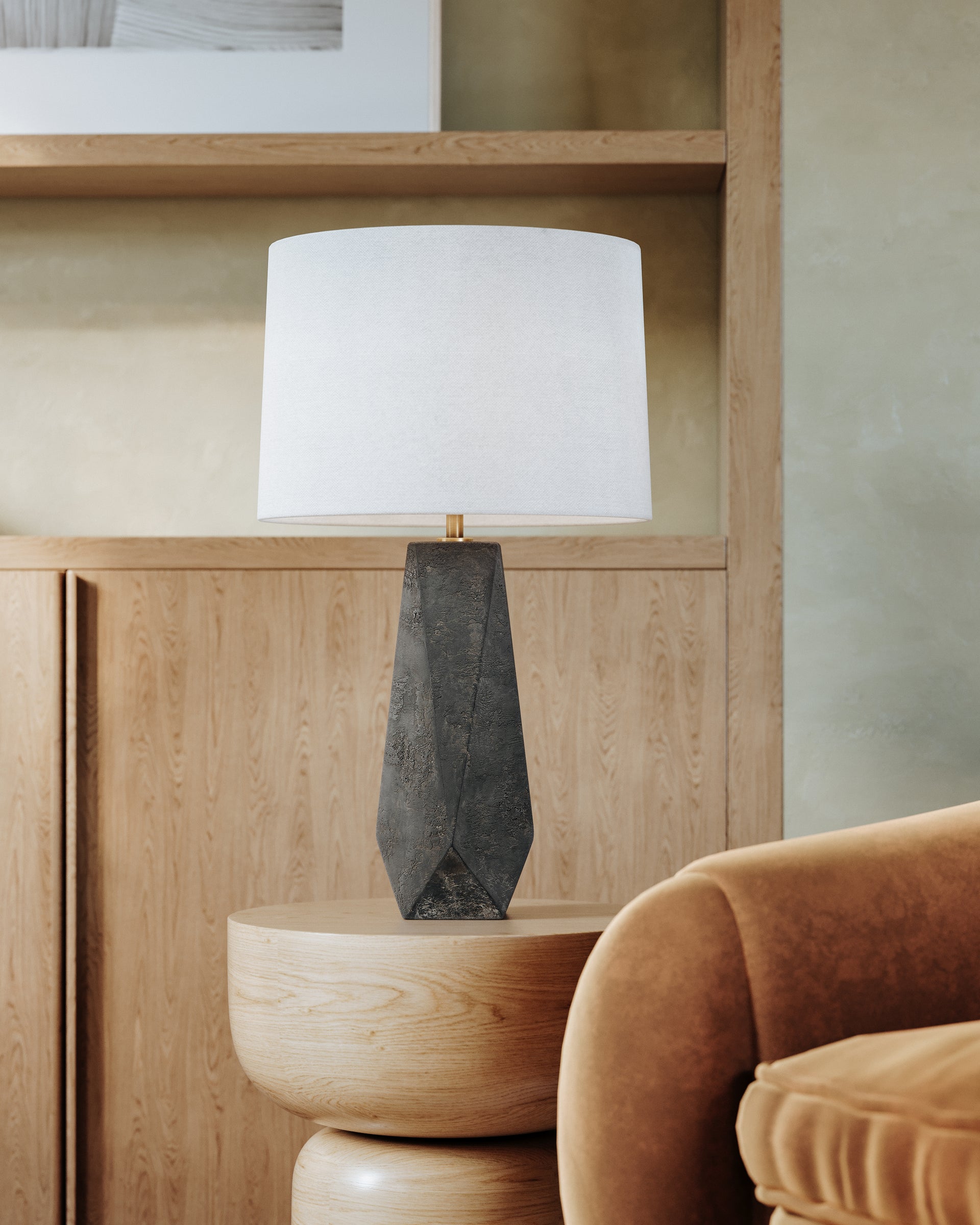 A geometrically faceted lamp with a primitive, hand-hewn quality, Coronado has the appearance of a modern sculpture carved from stone. The chalky finish of the black ceramic is balanced by the freshness of a natural grained off-white linen shade. A subtle glint of Patina Brass metalwork introduces a warm note at the neck.
