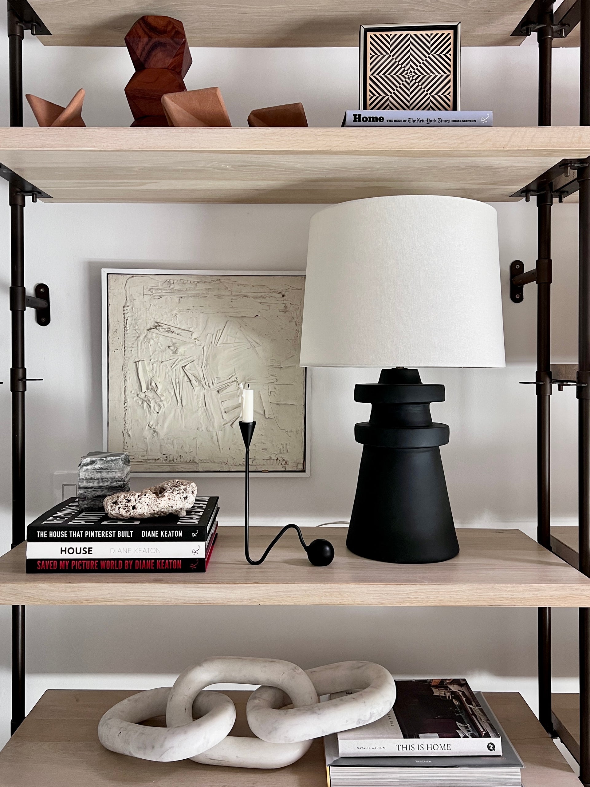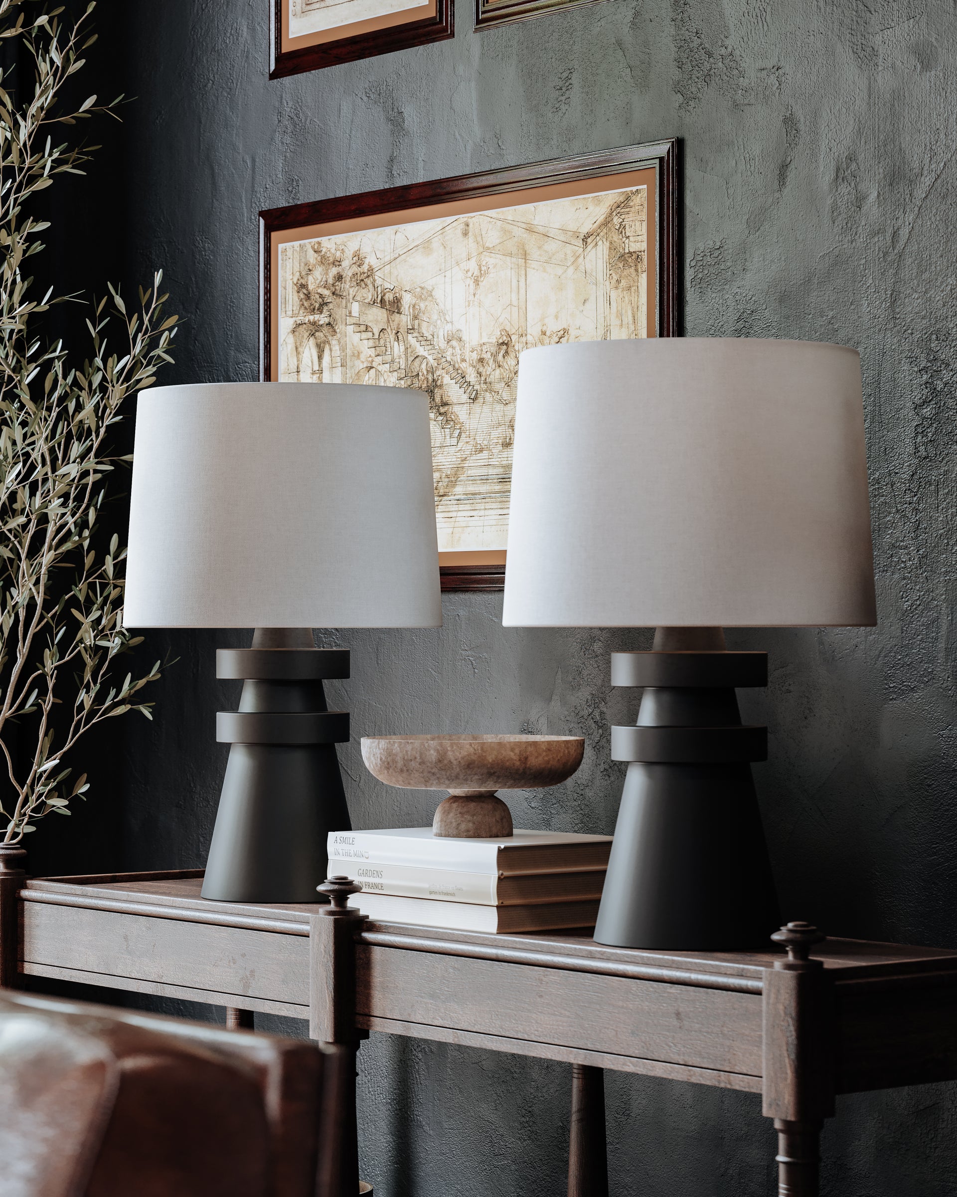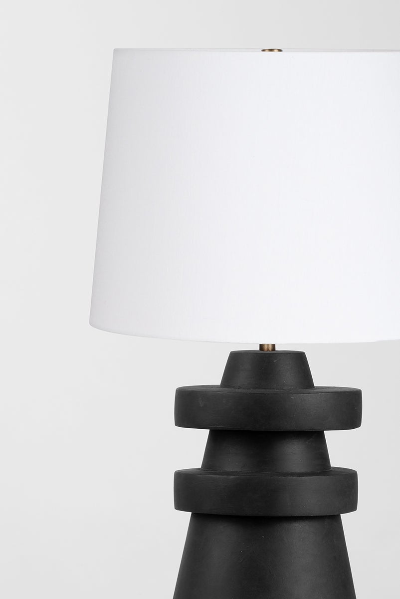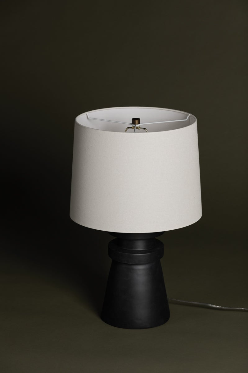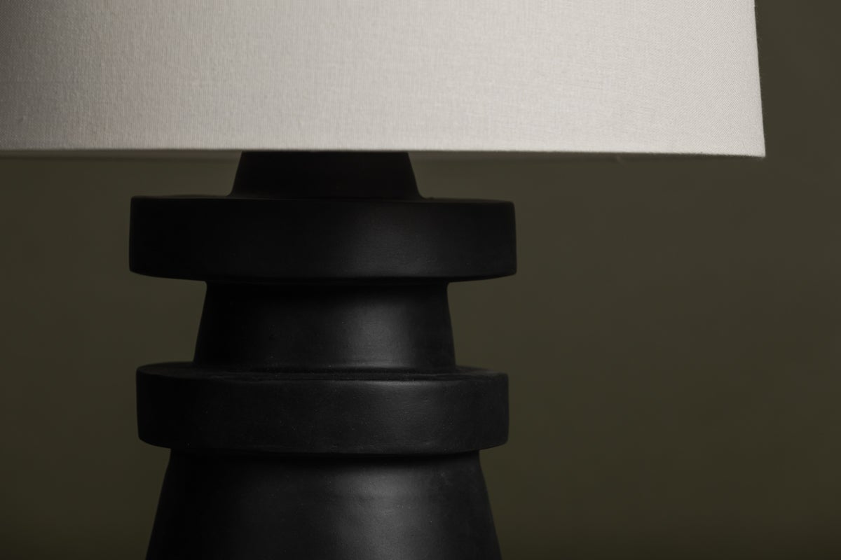 A conical base of charcoal ceramic gives Grover a hand-crafted feel that makes a strong sculptural statement. The ceramic rings add visual interest and balance and the off-white linen drum shade brings contrast and texture to this artistic, modern table lamp.