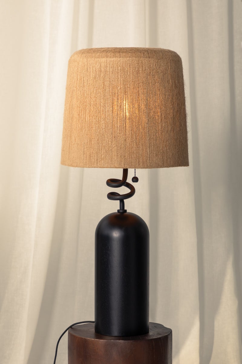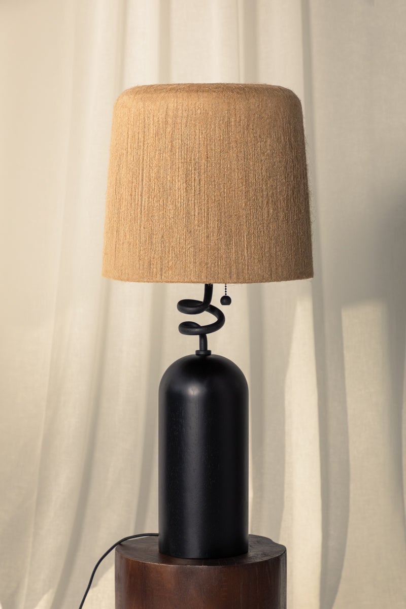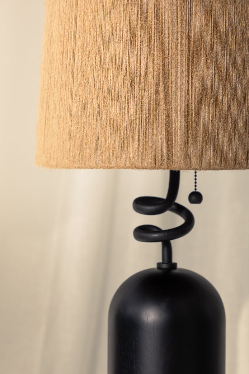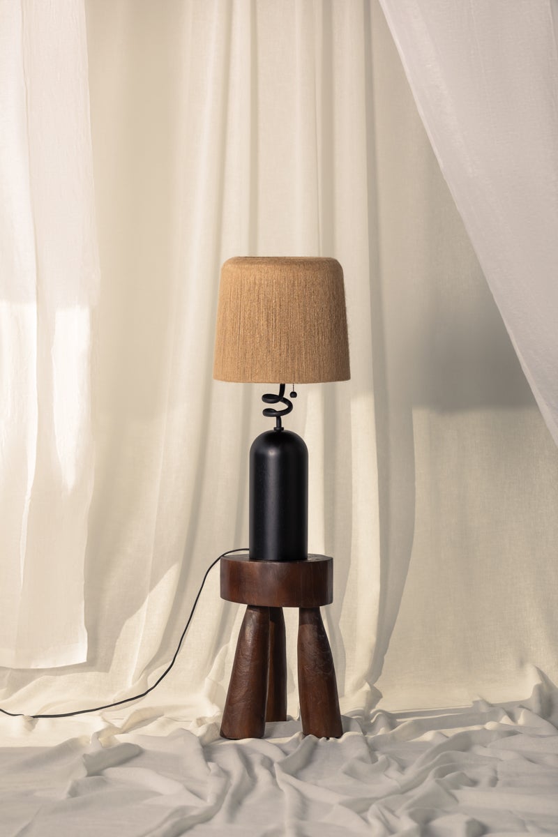 In tribute to novelist Toni Morrison, Morri commands attention with its gestural silhouette. The charred wood lamp body provides a solid base for the artfully twisted neck and woven natural Abaca string shade. The rich tones of the dark wood harmonize with the Forged Iron metalwork, merging durability with lasting beauty. Part of our Loft and Thought collection.