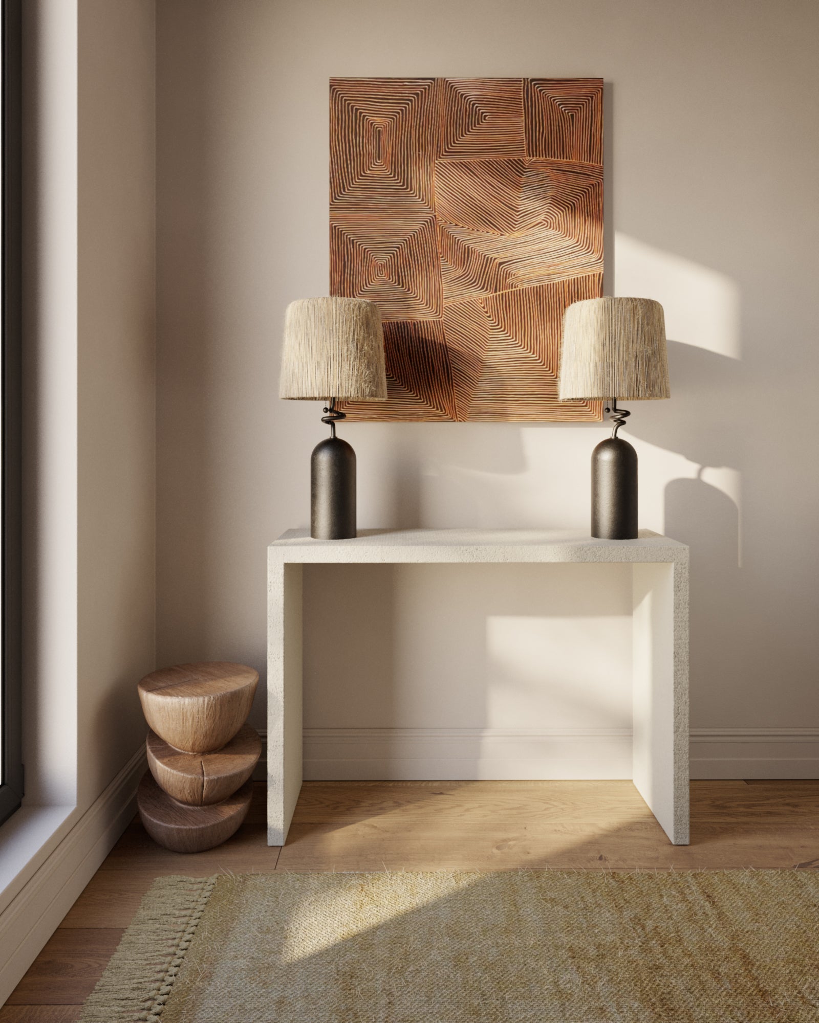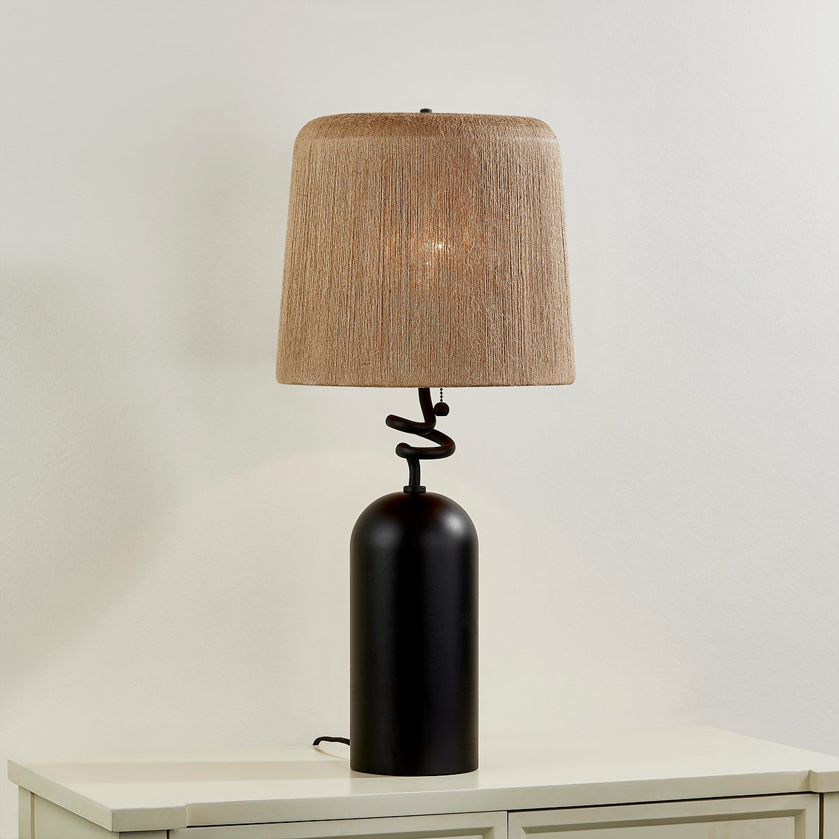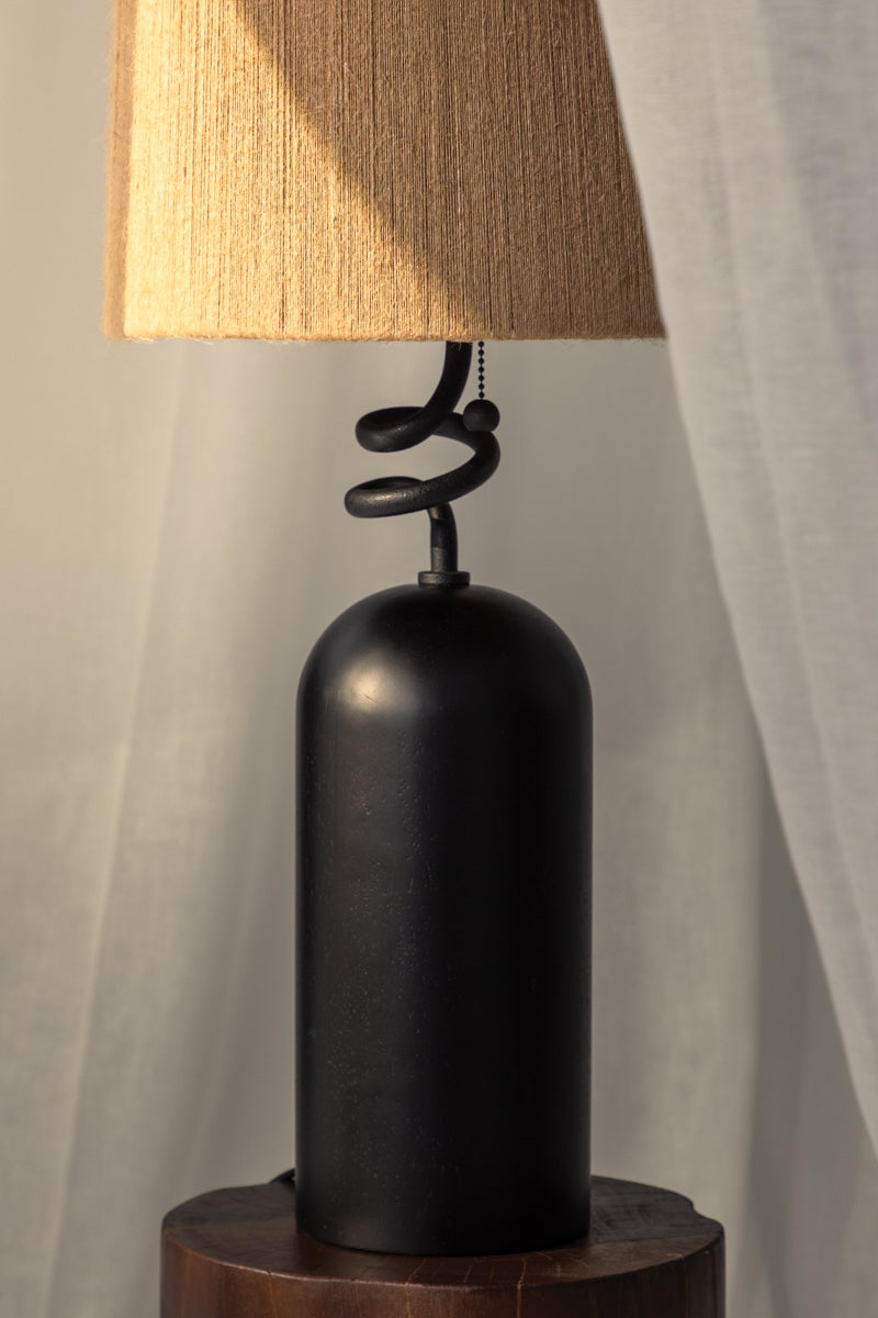 In tribute to novelist Toni Morrison, Morri commands attention with its gestural silhouette. The charred wood lamp body provides a solid base for the artfully twisted neck and woven natural Abaca string shade. The rich tones of the dark wood harmonize with the Forged Iron metalwork, merging durability with lasting beauty. Part of our Loft and Thought collection.