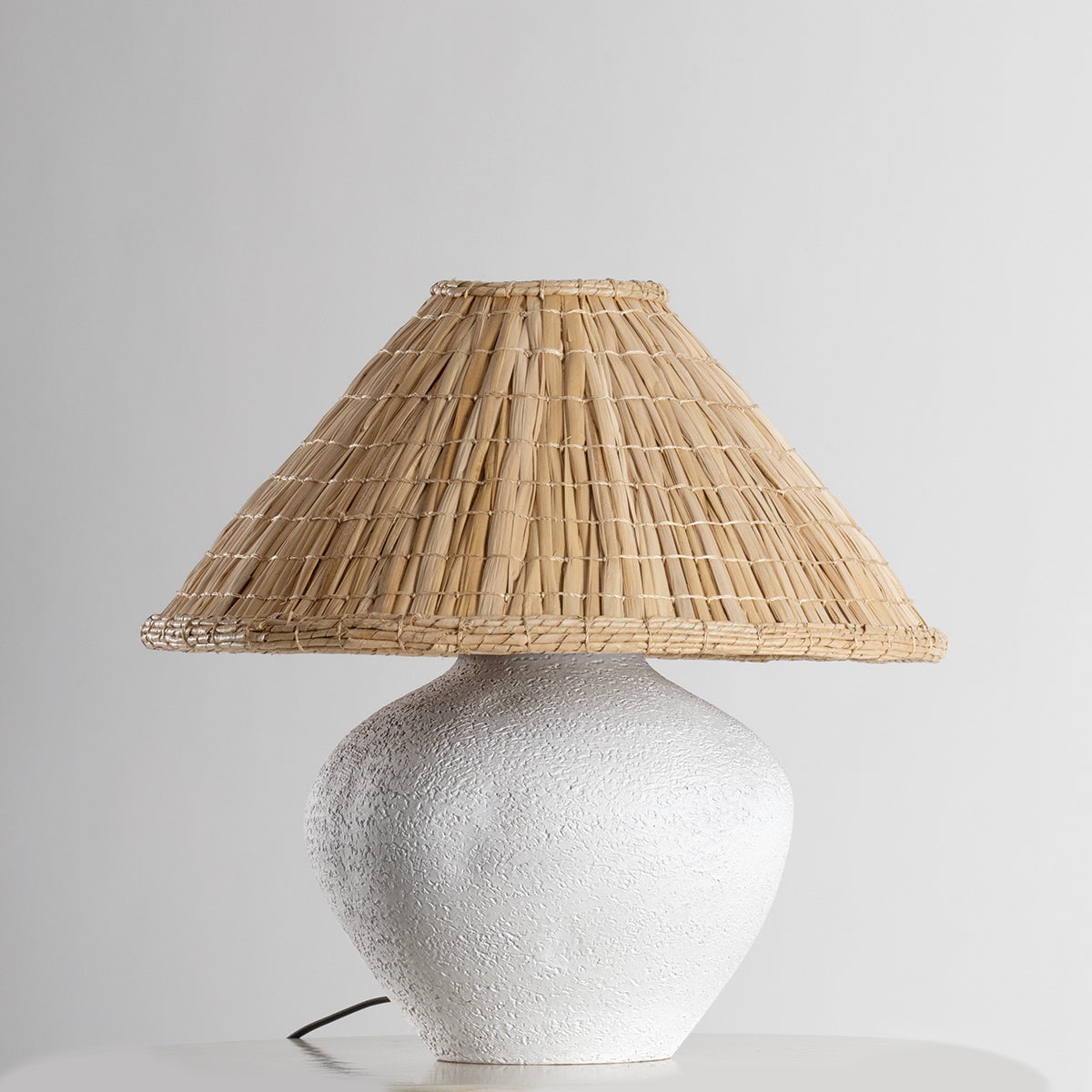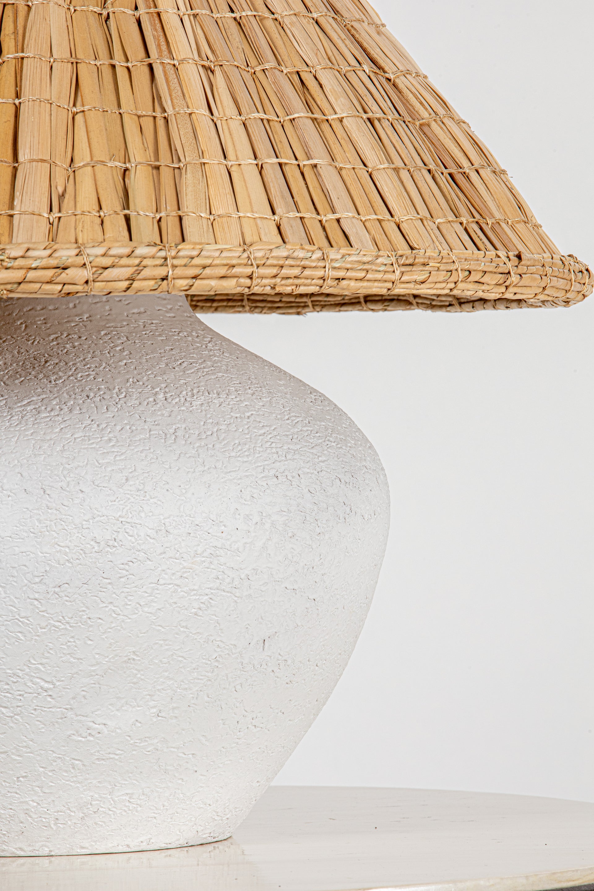 The raw finish and distinctive indentations of the ceramic base of Solon give it a delightful found object quality. By contrast, the woven grass shade provides a refreshing touch with its sharp taper and organic texture. Casting light downwards across the tactile clay, Solon celebrates the marriage of enduring natural materials, textures, and tones.
