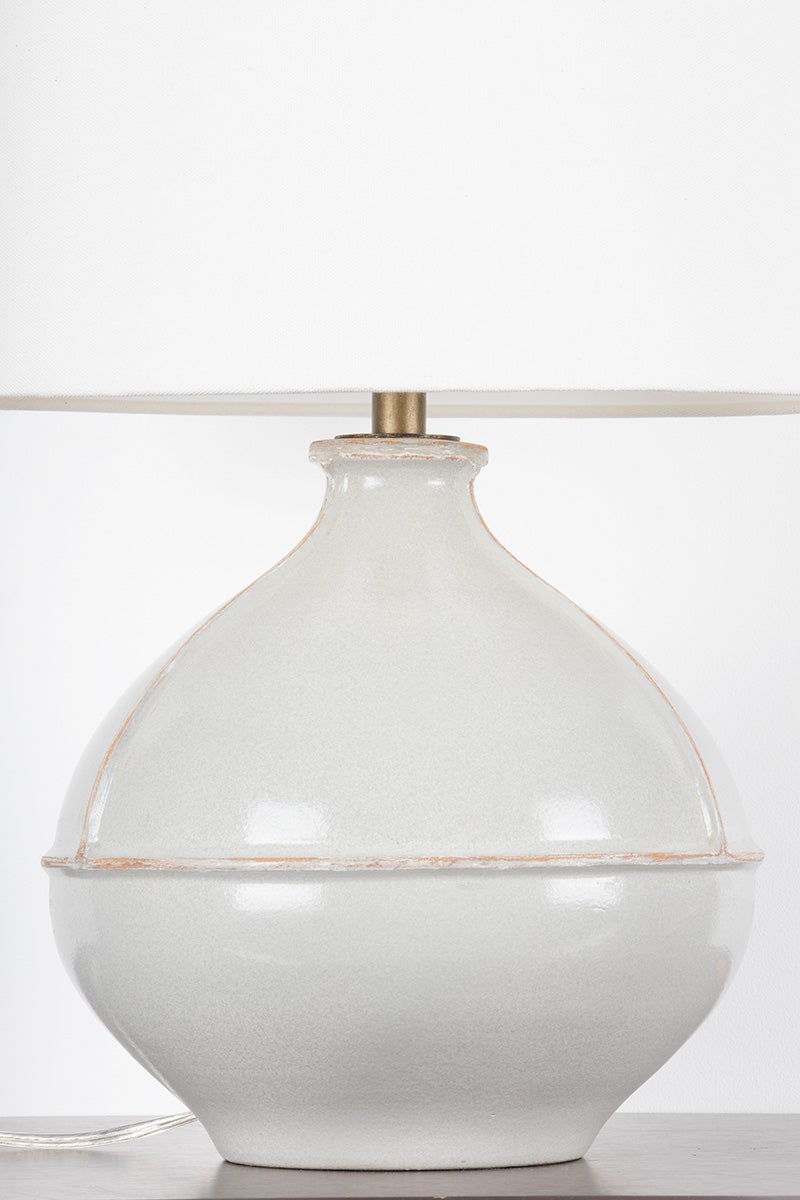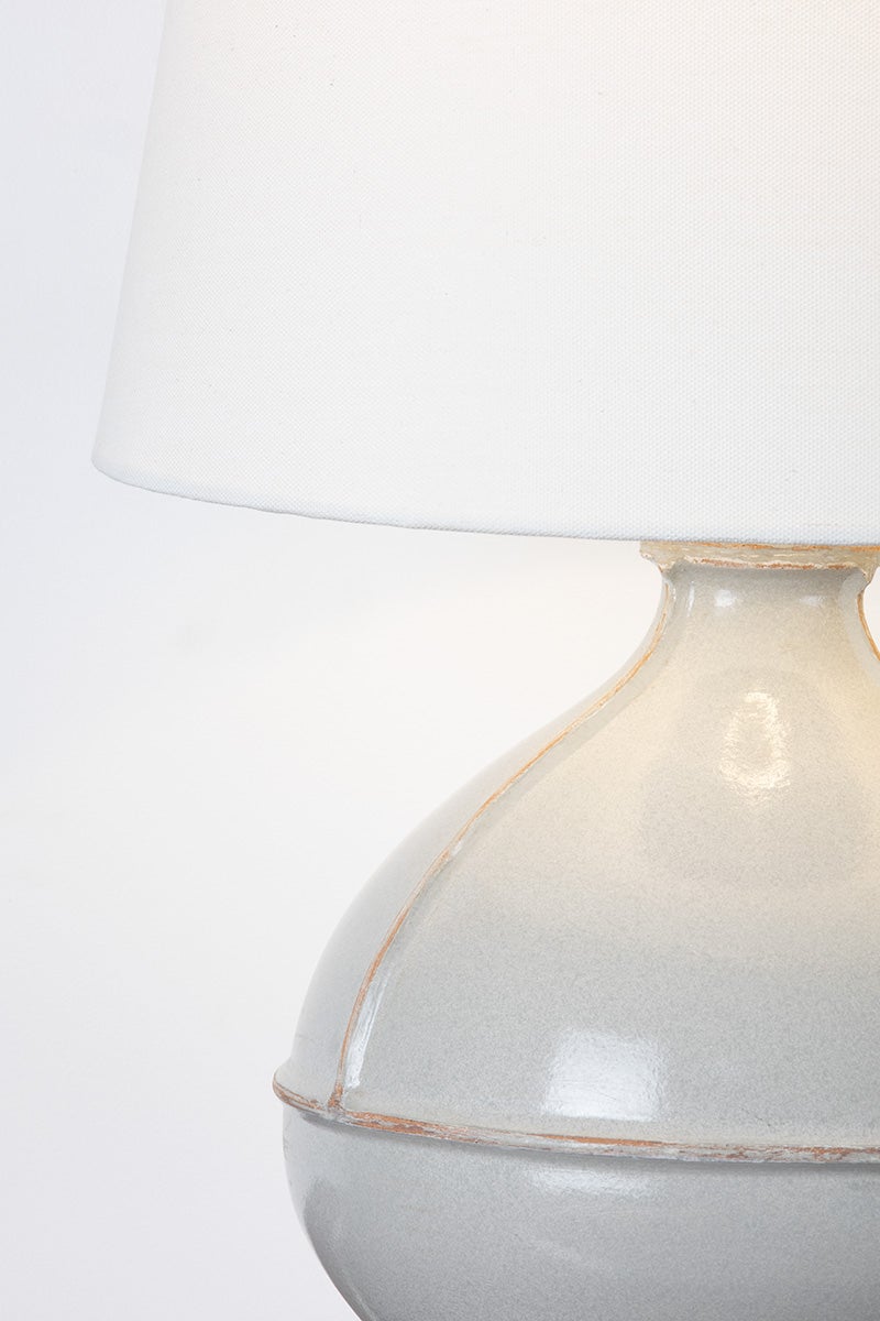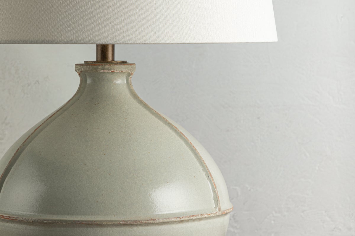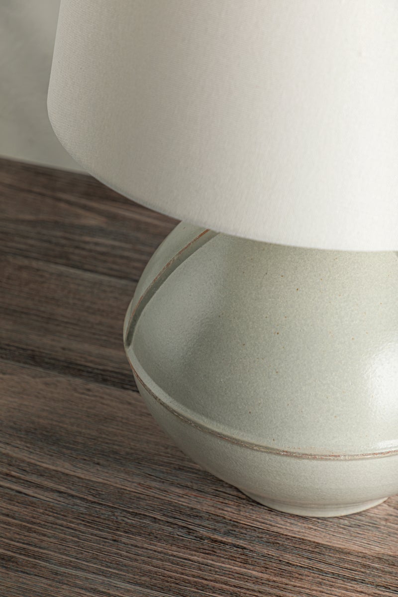 Inspired by rustic pottery, this table lamp's beautifully shaped base is crafted of pale sage ceramic giving it an earthy pale green tone. The off white linen shade pairs naturally and casts a soft glow. Raised seamlines and a reactive glaze that allows hints of the natural ceramic to peek through, give the fixture a hand-thrown, crafted feel. Part of our Lauren Liess collection.