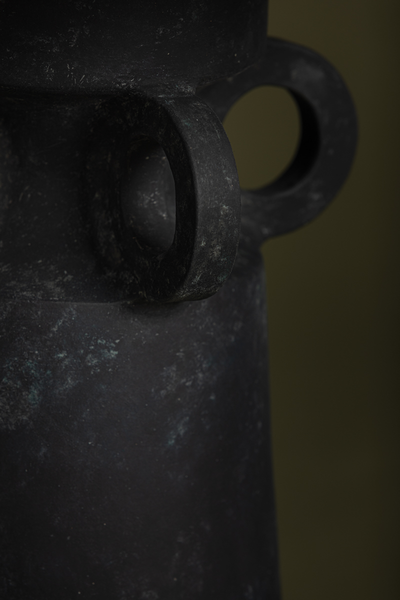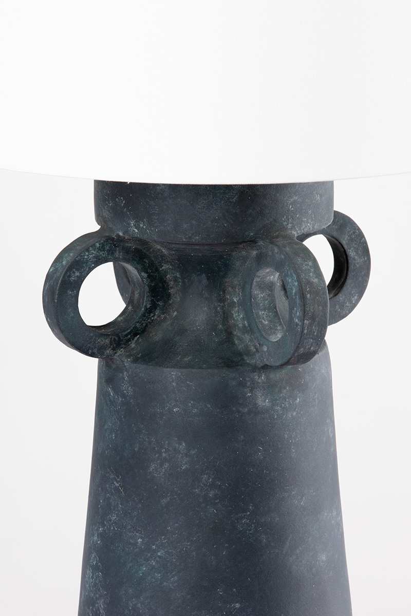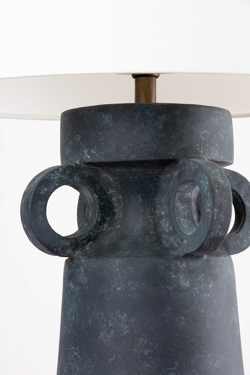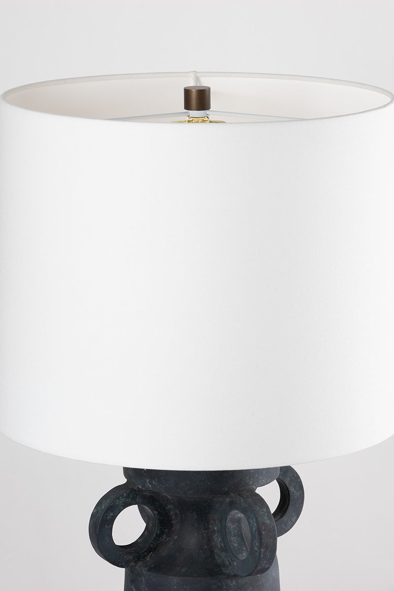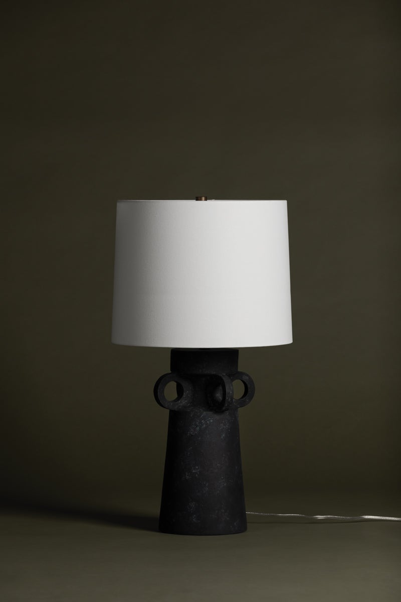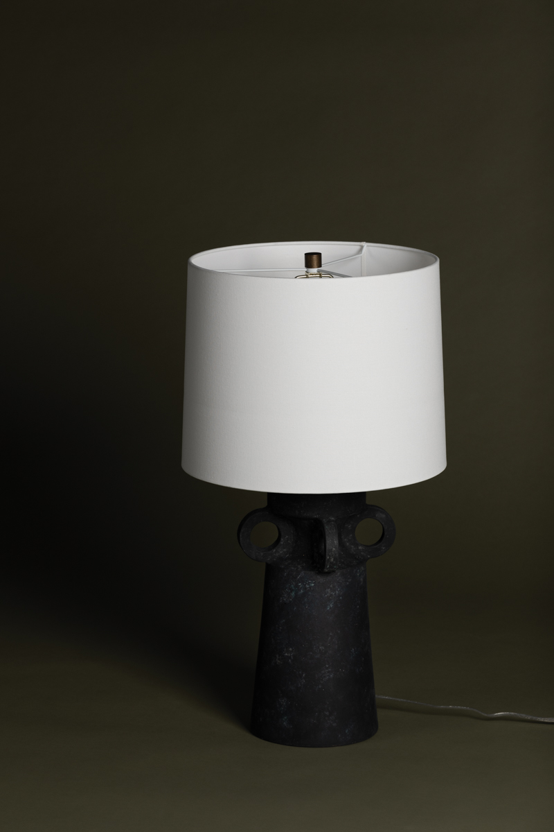 The artifact black ceramic sculptural base gives this modern table lamp an earthy, weathered look that makes it feel like an ancient hand-crafted treasure. The white linen drum shade adds contrast and warmth. Santa Cruz makes a stunning statement on any tabletop.