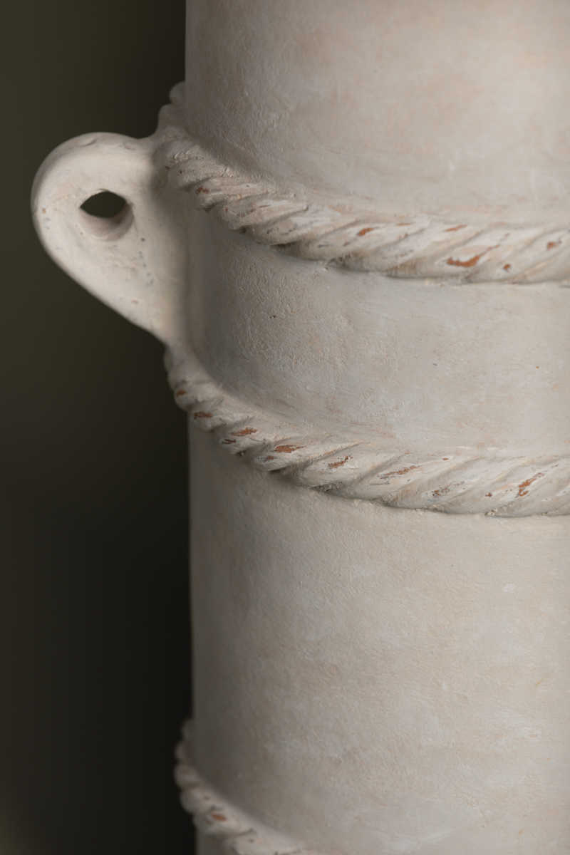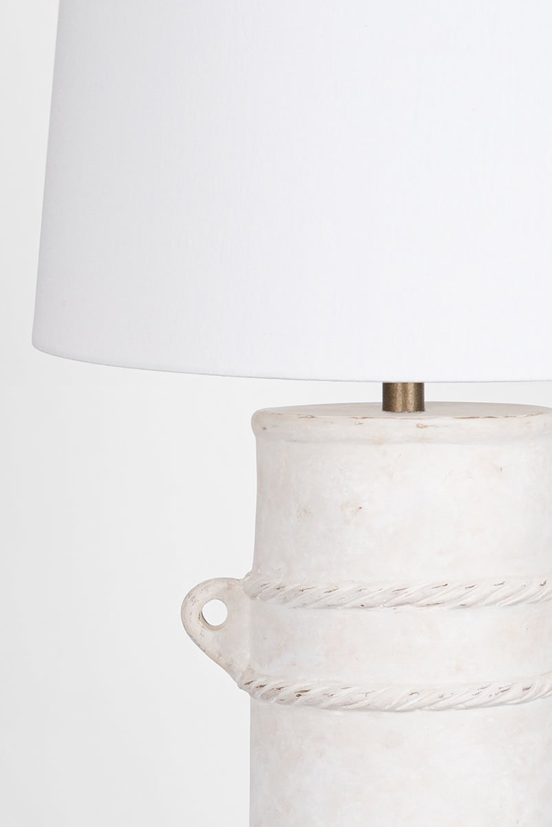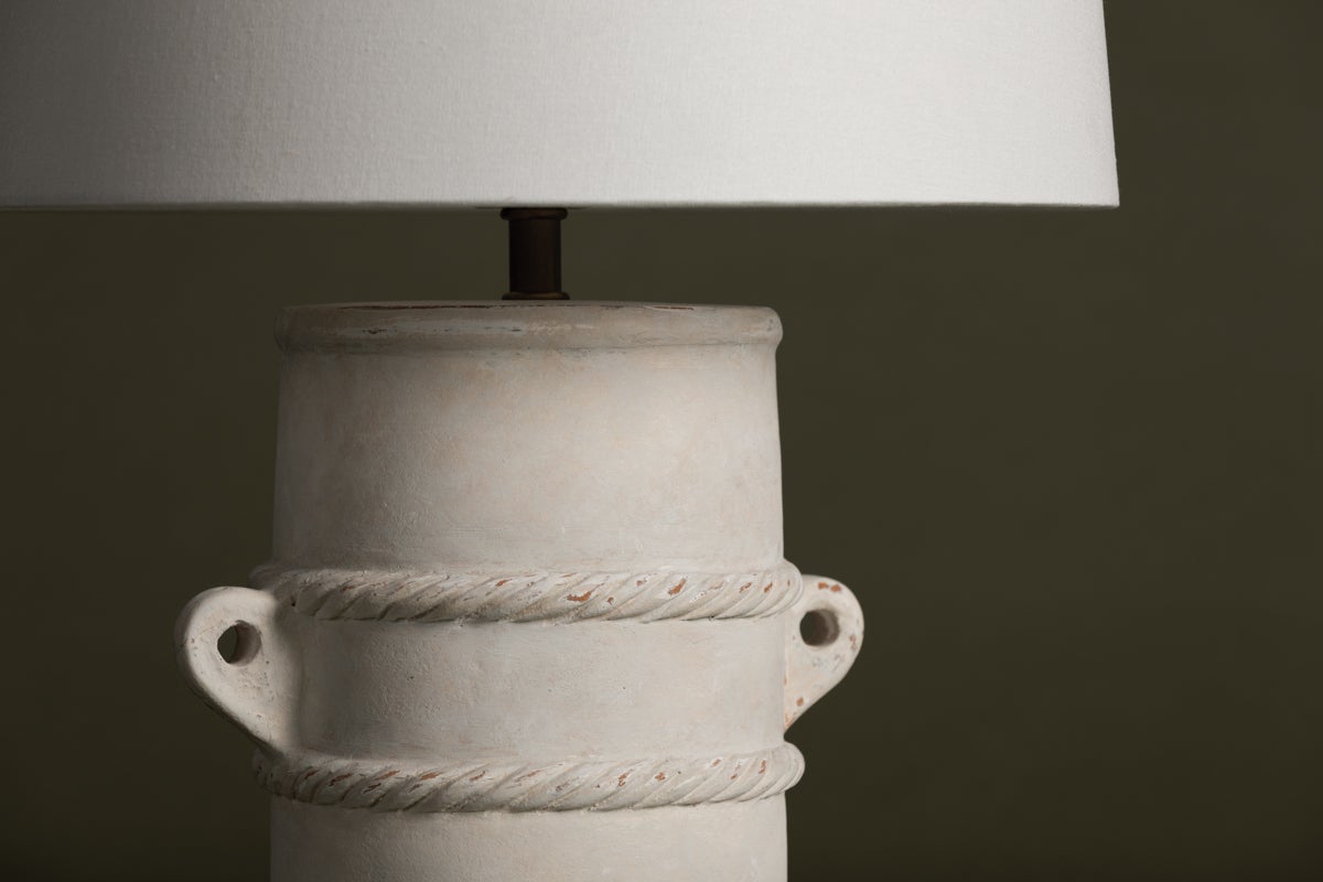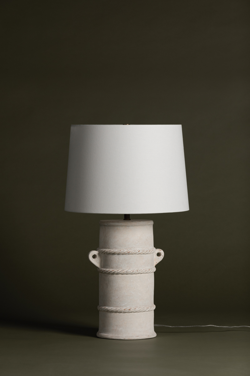 A modernized version of an ancient artifact, Siena features a cylindrical terracotta base with hand-sculpted rope-like details and rounded "handles" on each side. The whitewash finish gives this earthy table lamp a natural weathered feel that works well with the white linen drum shade and subtle Patina Brass accents. The neutral tone pairs with many interiors.