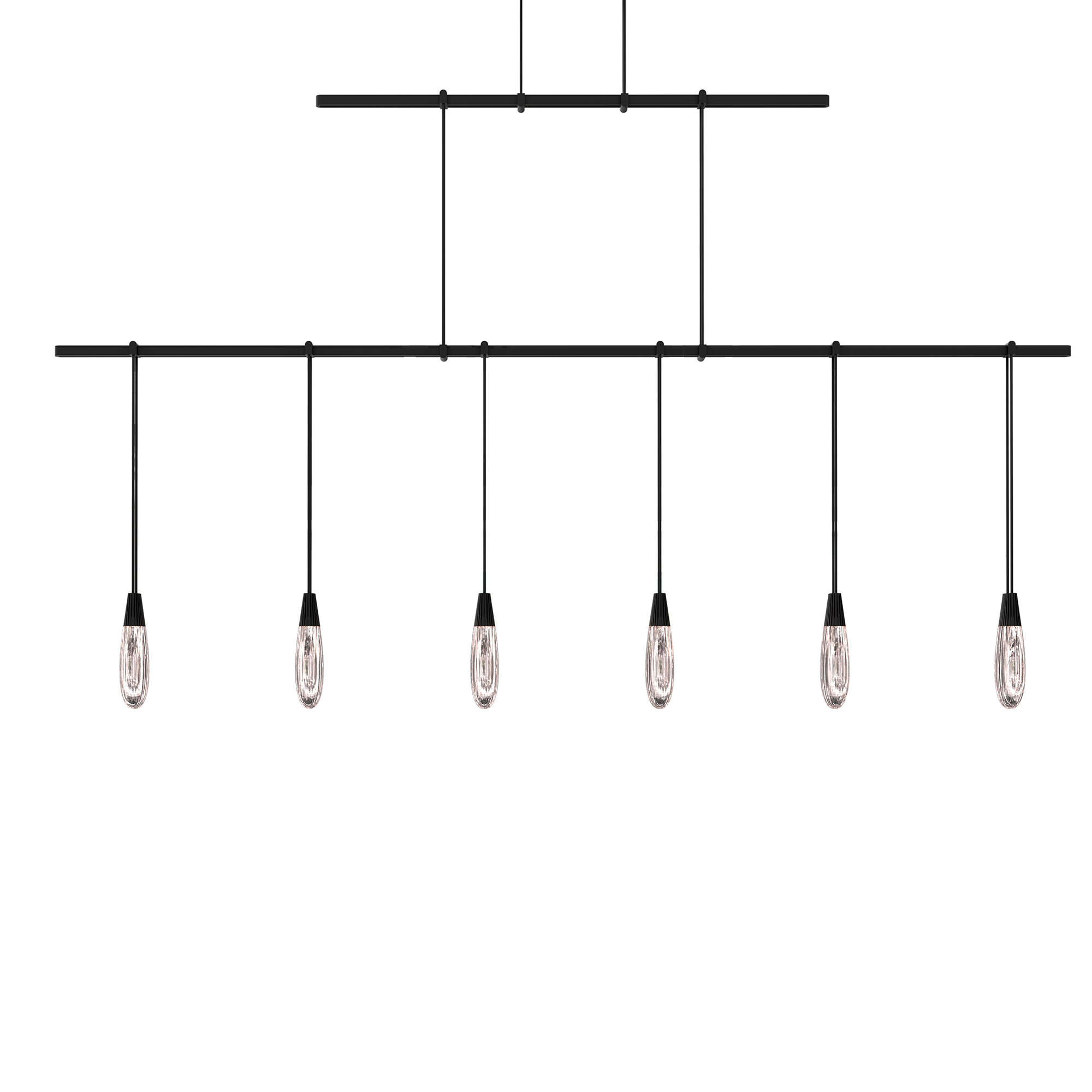Power bars are suspended at right angles to each other, connected by perpendicular Power Bar Hangers. Zig Zag arrangements can be used to form a linear pattern, or combined and oriented to form a broad composition arrayed across the plane of an entire ceiling.