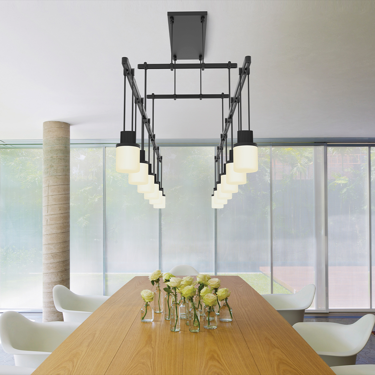 Power bars are suspended at right angles to each other, connected by perpendicular Power Bar Hangers. Zig Zag arrangements can be used to form a linear pattern, or combined and oriented to form a broad composition arrayed across the plane of an entire ceiling.