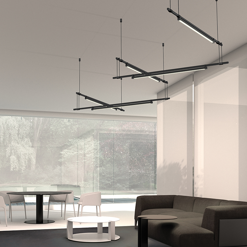 Power bars are suspended at right angles to each other, connected by perpendicular Power Bar Hangers. Zig Zag arrangements can be used to form a linear pattern, or combined and oriented to form a broad composition arrayed across the plane of an entire ceiling.
