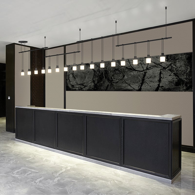 Power bars are suspended at right angles to each other, connected by perpendicular Power Bar Hangers. Zig Zag arrangements can be used to form a linear pattern, or combined and oriented to form a broad composition arrayed across the plane of an entire ceiling.