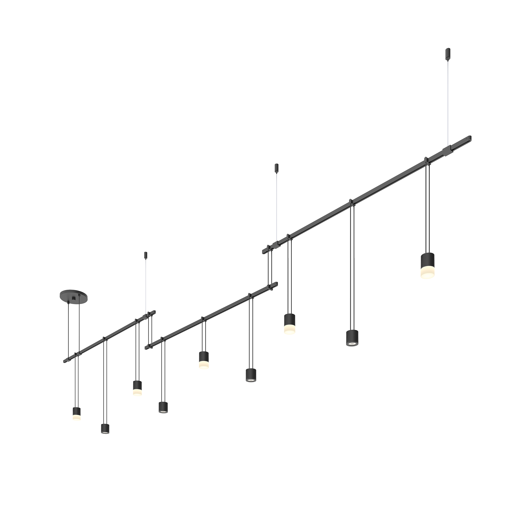 Power bars are suspended at right angles to each other, connected by perpendicular Power Bar Hangers. Zig Zag arrangements can be used to form a linear pattern, or combined and oriented to form a broad composition arrayed across the plane of an entire ceiling.
